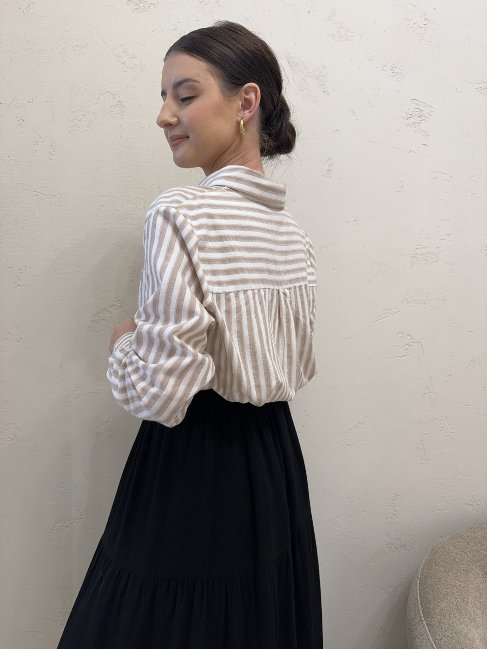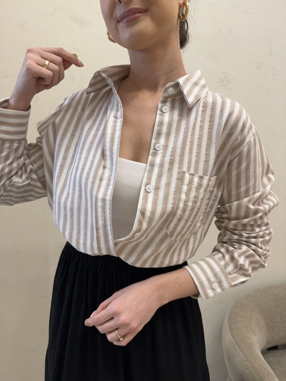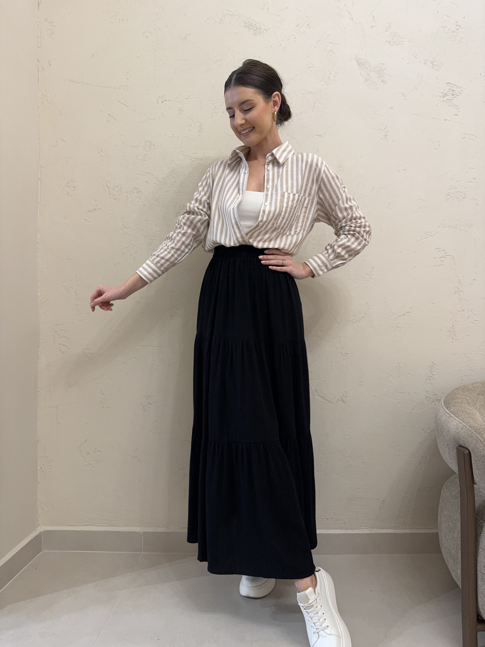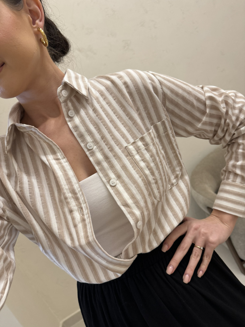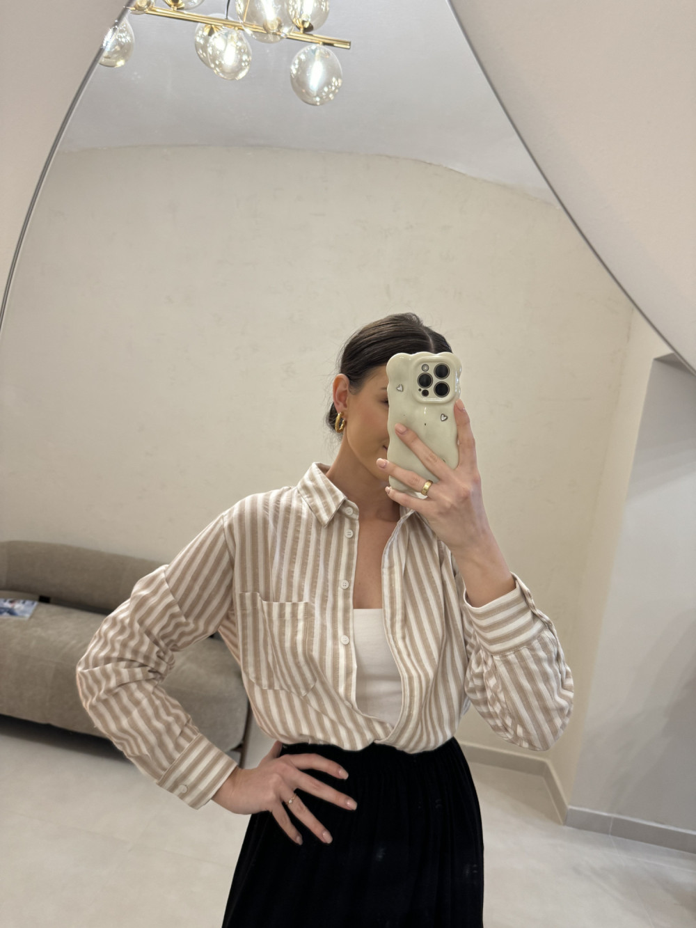 Koszula w paski wykonana z bawełny, lekka i komfortowa w noszeniu. Model posiada nieco wydłużony krój, który pięknie prezentuje się zarówno wpuszczony w spodnie, jak i noszony luźno. Zapinana na guziki, idealnie sprawdzi się jako baza do wielu stylizacji. Klasyka w świeżym, nowoczesnym wydaniu.
