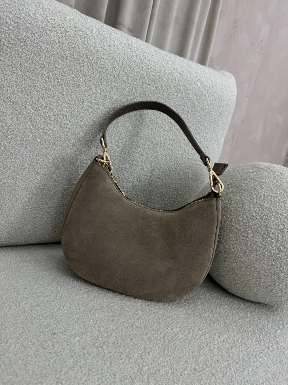 Torebka w odcieniu fango ze złotymi okuciami to klasyka, która nigdy nie wychodzi z mody. Posiada krótki uchwyt do noszenia w dłoni oraz dłuższy, regulowany pasek, dzięki czemu z łatwością dopasujesz ją do okazji. Jej minimalistyczny kształt sprawia, że pasuje zarówno do eleganckich, jak i codziennych stylizacji.