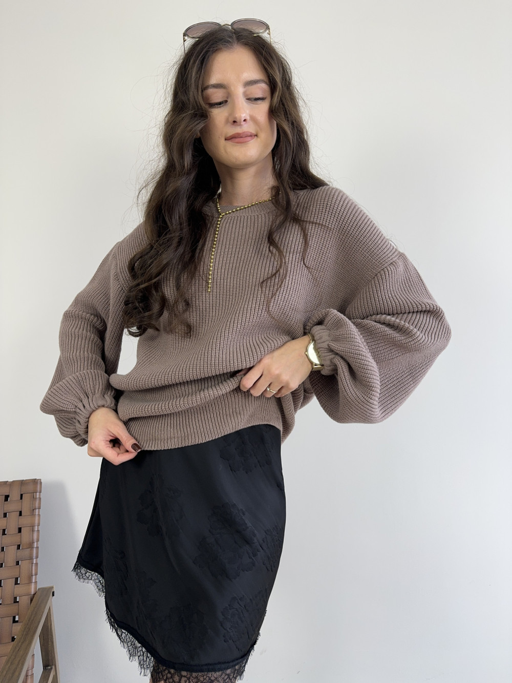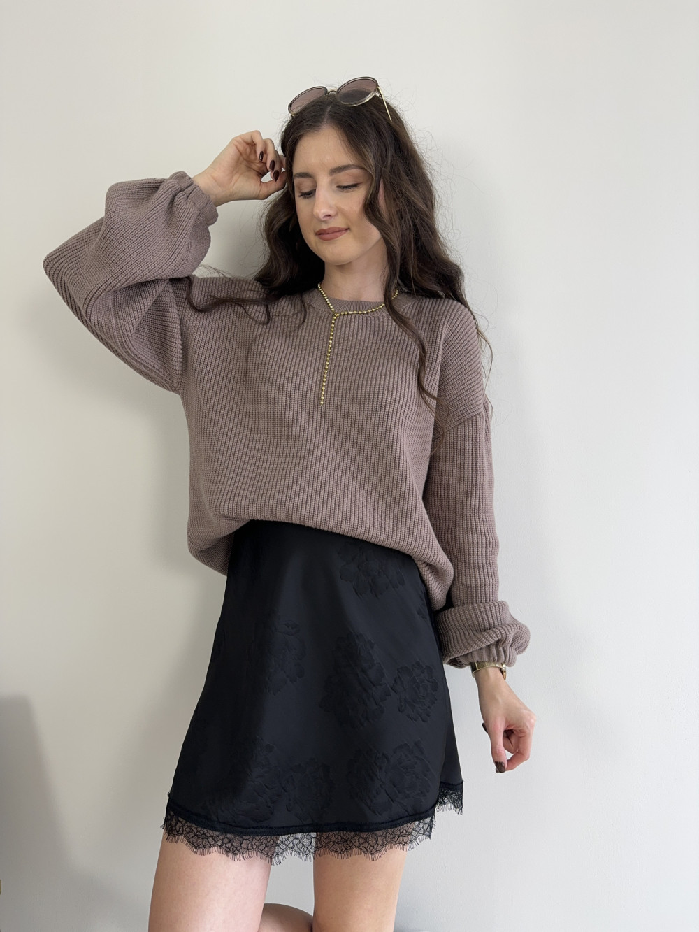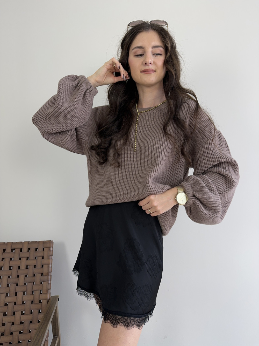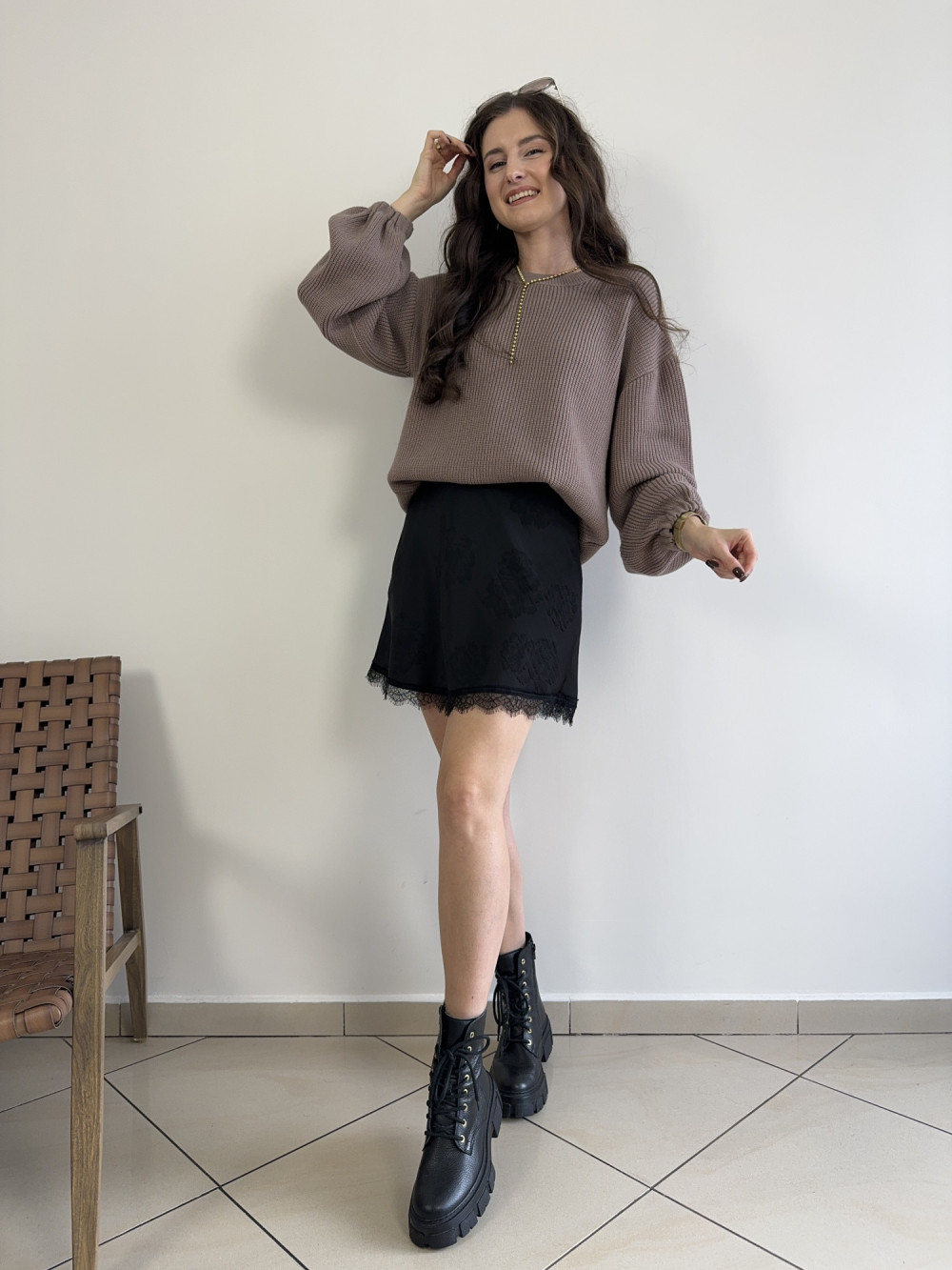 Sweter o luźnym kroju z lekko balonowymi rękawami. W składzie znajdziesz 50% wiskozy i 30% kaszmiru – to model premium, który zachwyca miękkością i jakością. Nie gryzie, jest niezwykle ciepły i komfortowy w noszeniu. Doskonały wybór na chłodniejsze dni.
