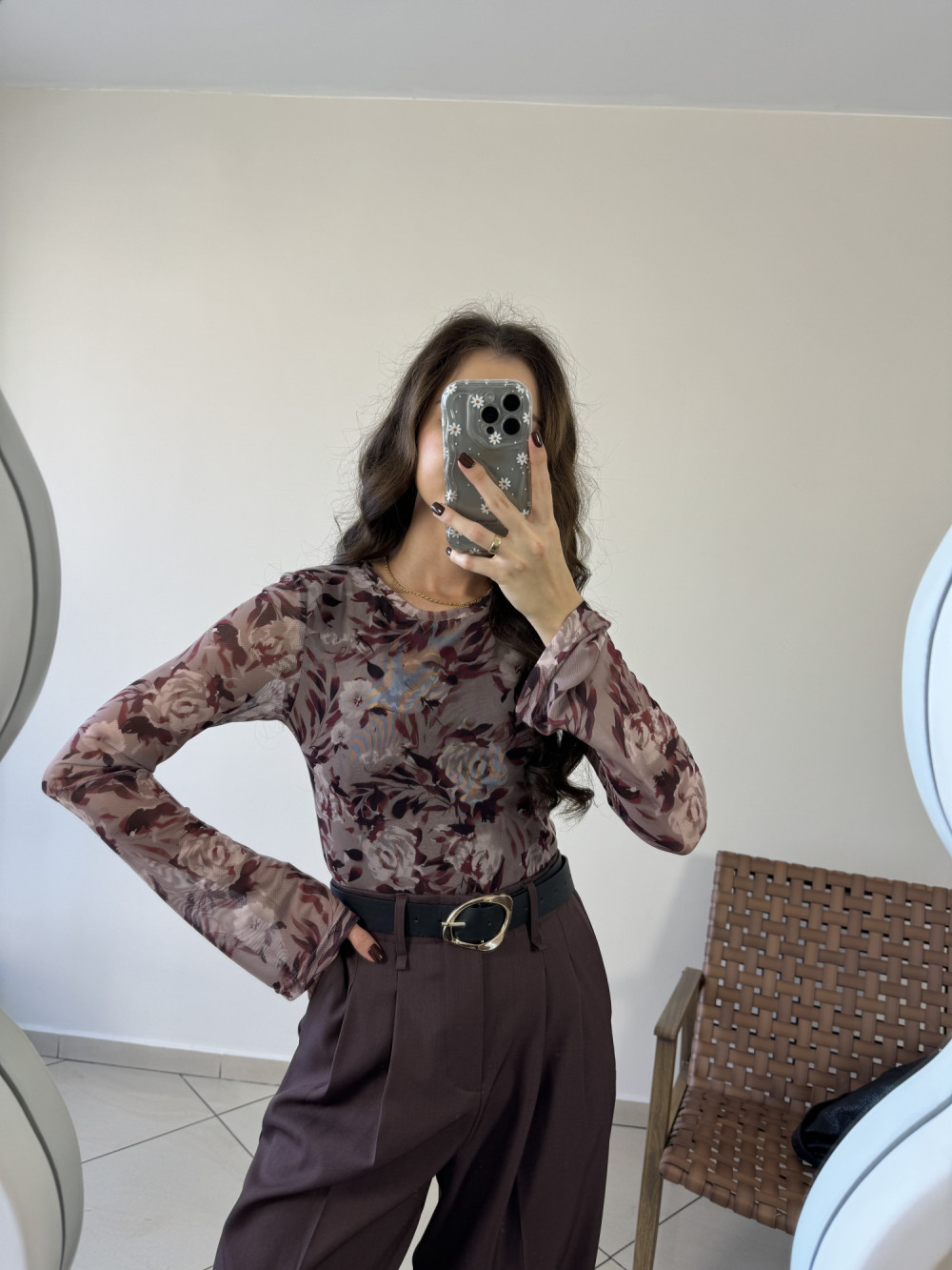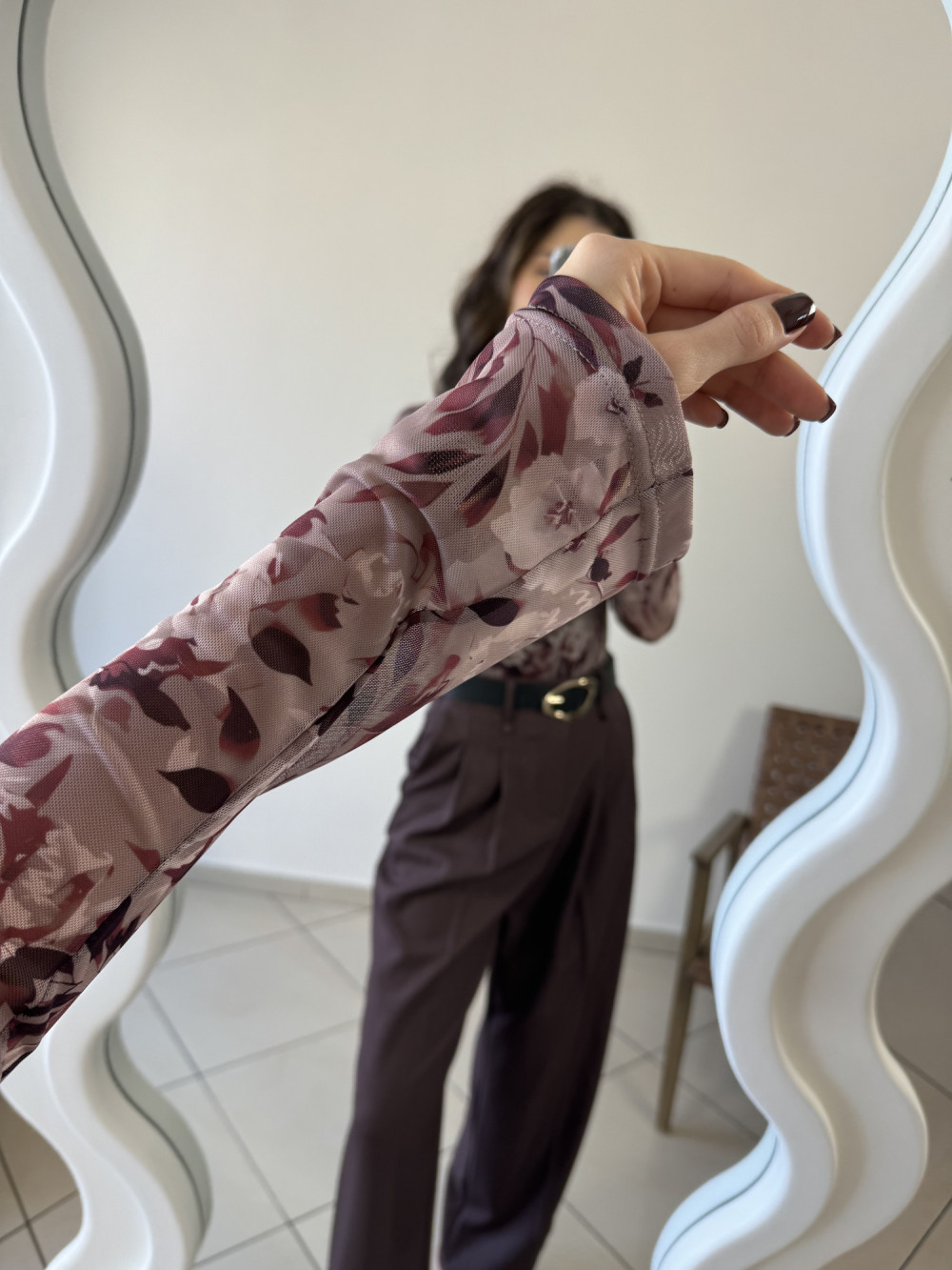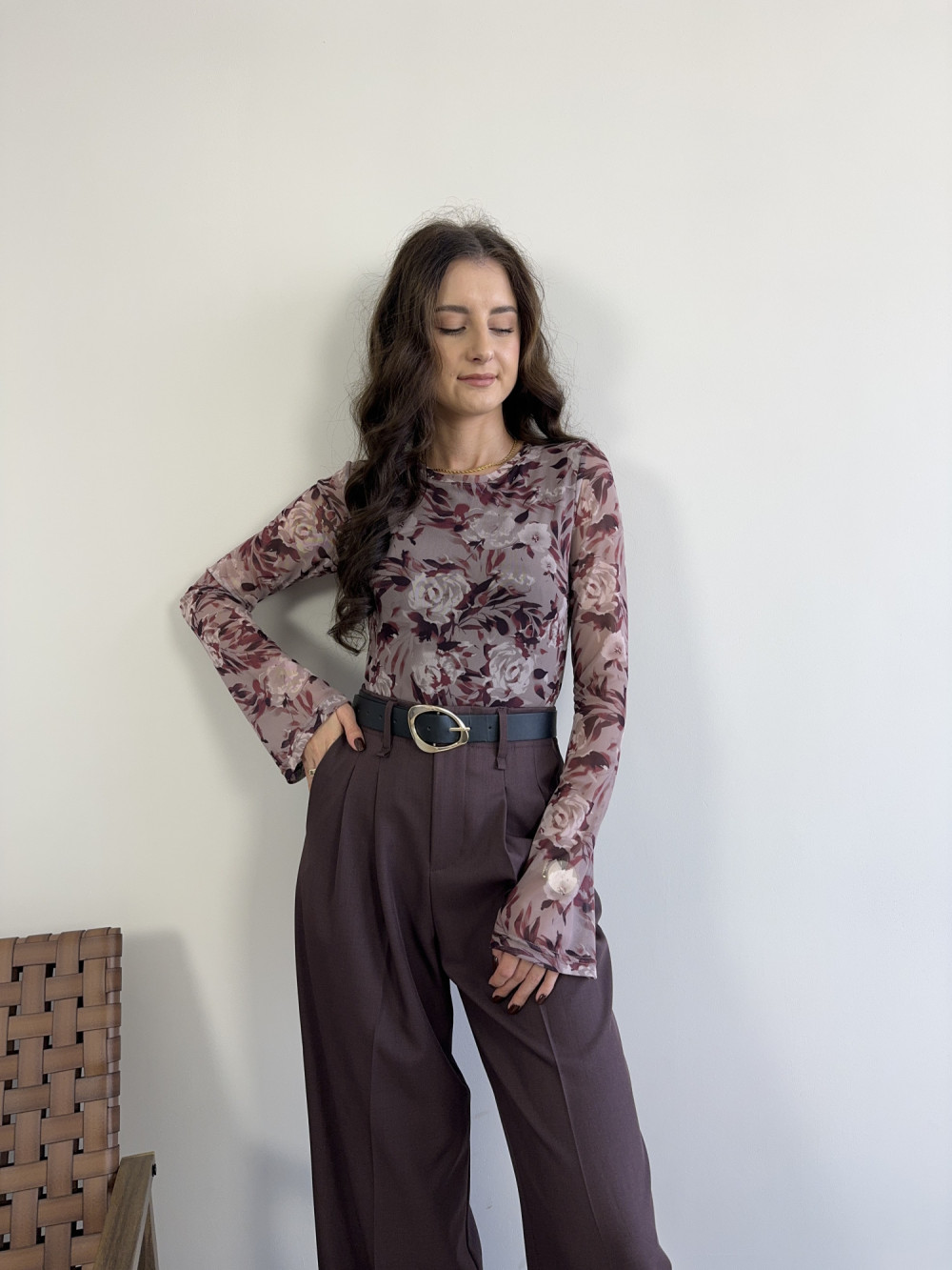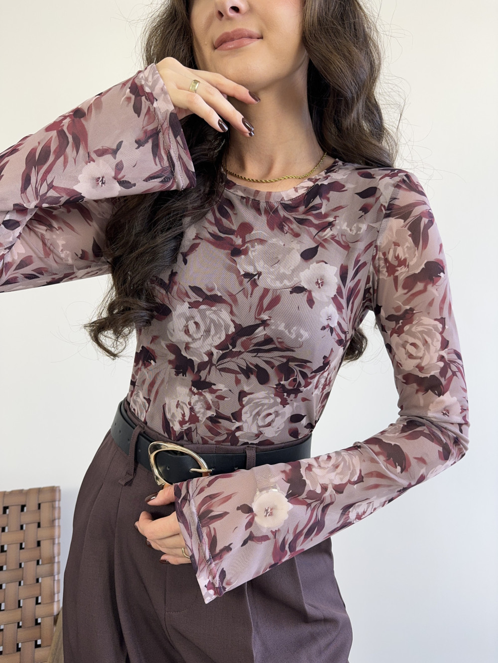 Bluzka wykonana z lekkiej, elastycznej siateczki, która doskonale dopasowuje się do ciała. Dzięki podszewce na biuście nie prześwituje, zachowując komfort i swobodę noszenia. Rozkloszowane rękawy nadają całości lekkości i romantycznego charakteru, a kwiatowy motyw pięknie ożywia każdą stylizację.