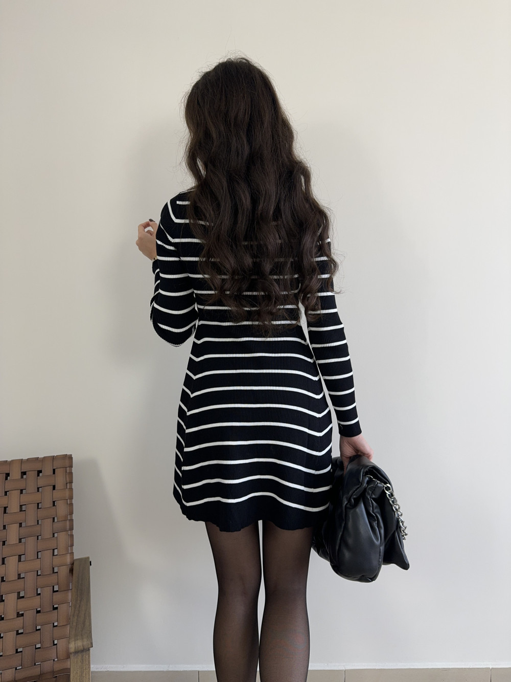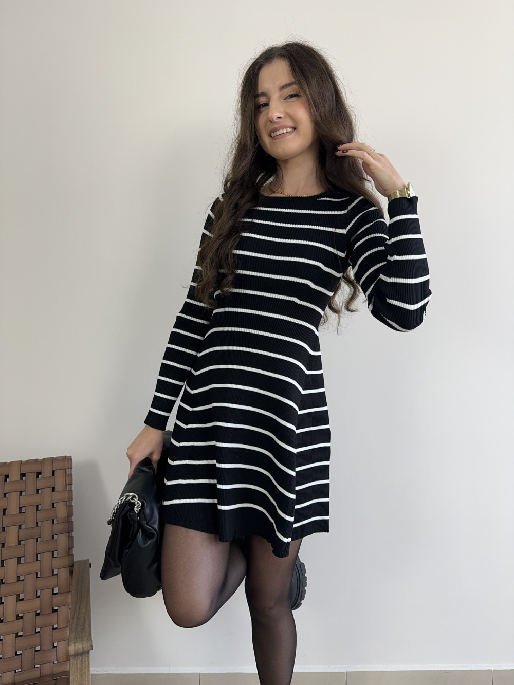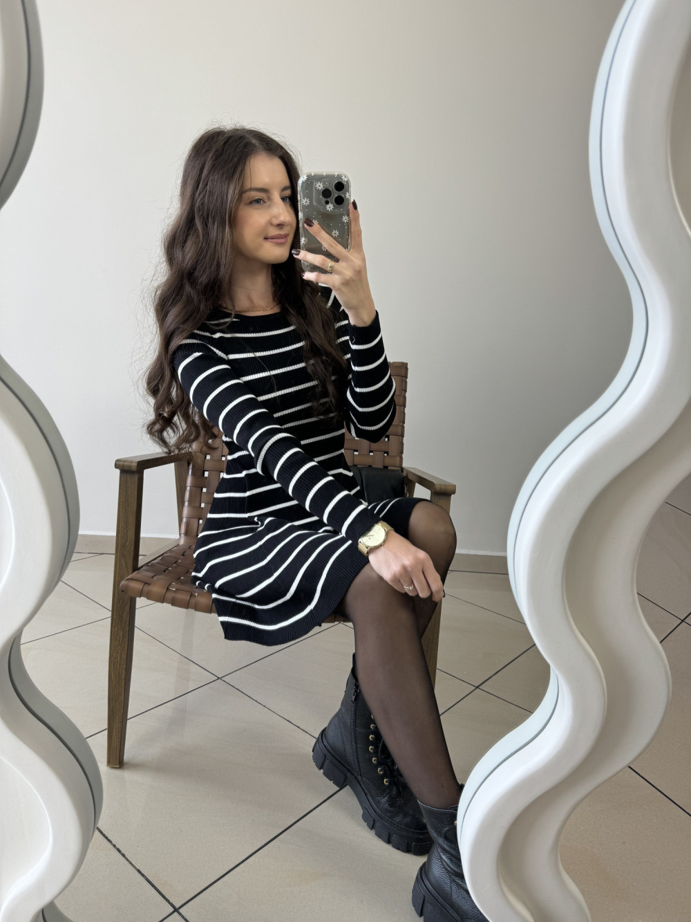 Prążkowana sukienka w paski o kobiecym kroju, który delikatnie dopasowuje się do sylwetki dzięki elastycznemu materiałowi. Uszyta głównie z miękkiej wiskozy, jest przyjemna dla ciała i bardzo wygodna w noszeniu. Klasyczny, lekko rozkloszowany fason nadaje jej dziewczęcego uroku. Świetna zarówno na co dzień, jak i na spotkania ze znajomymi.