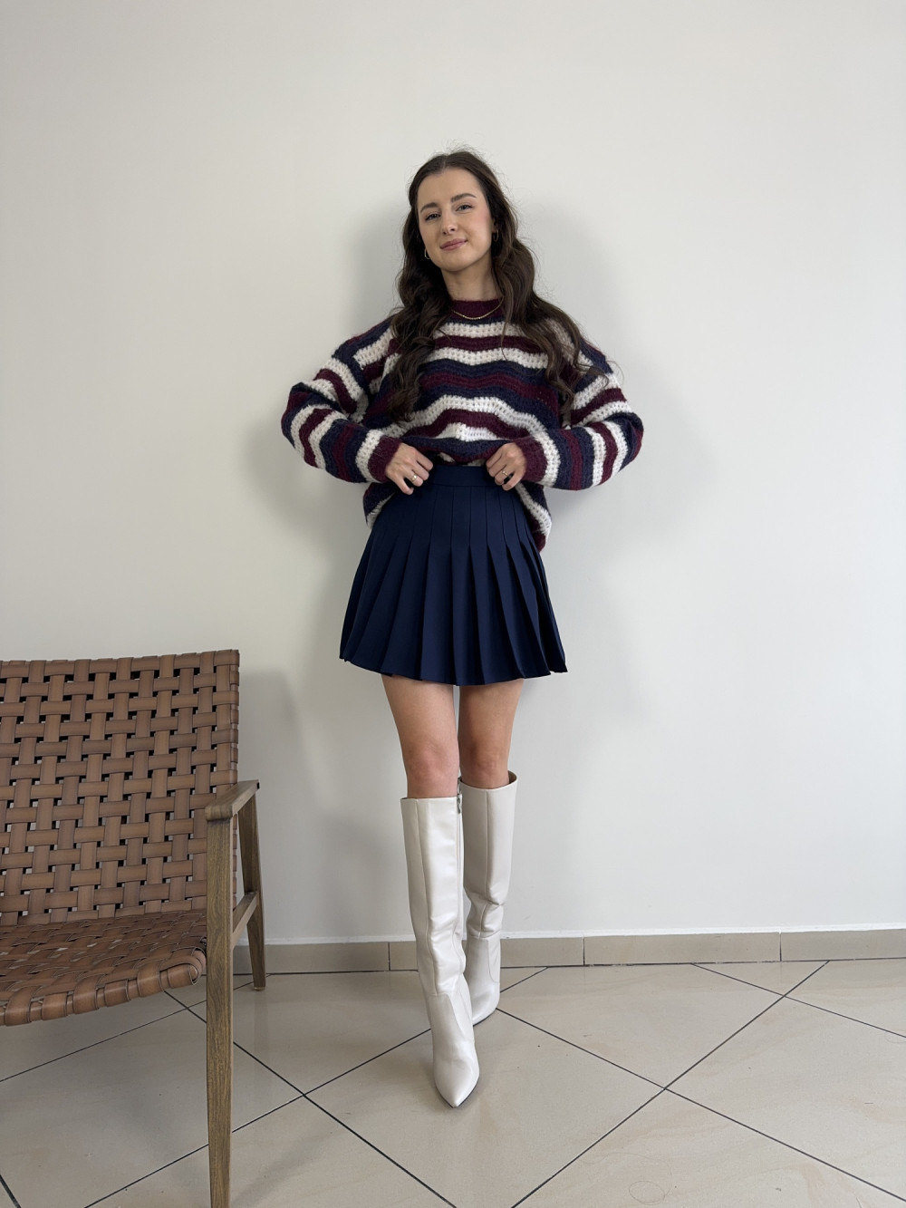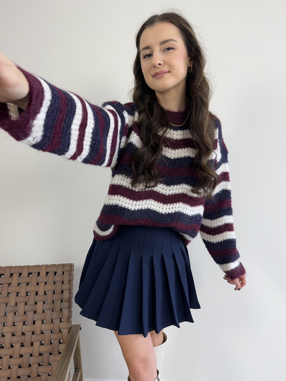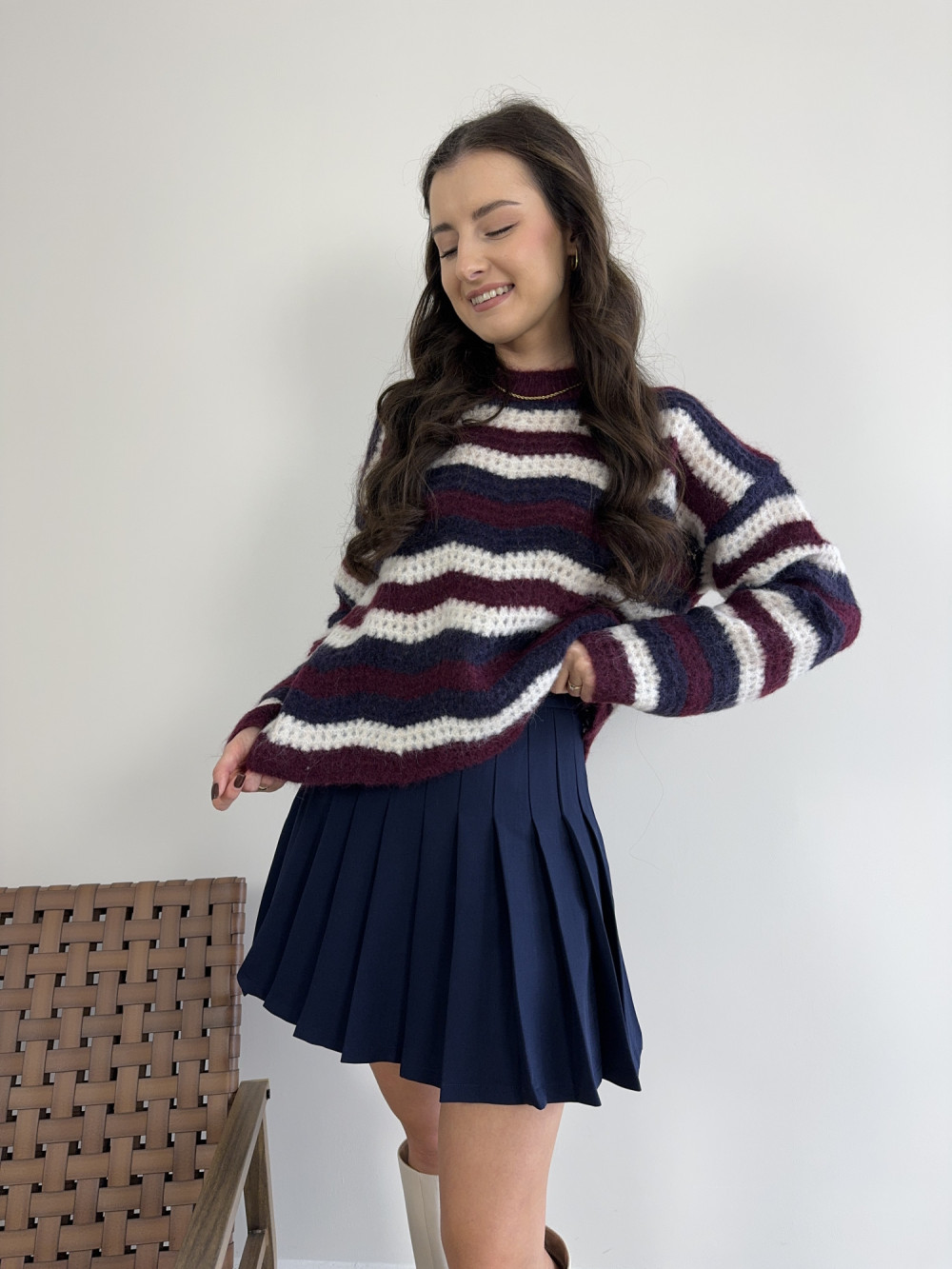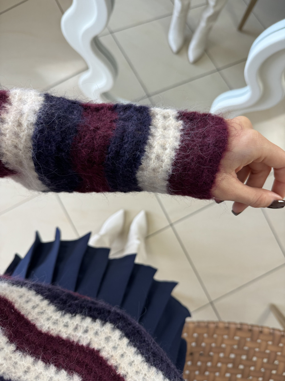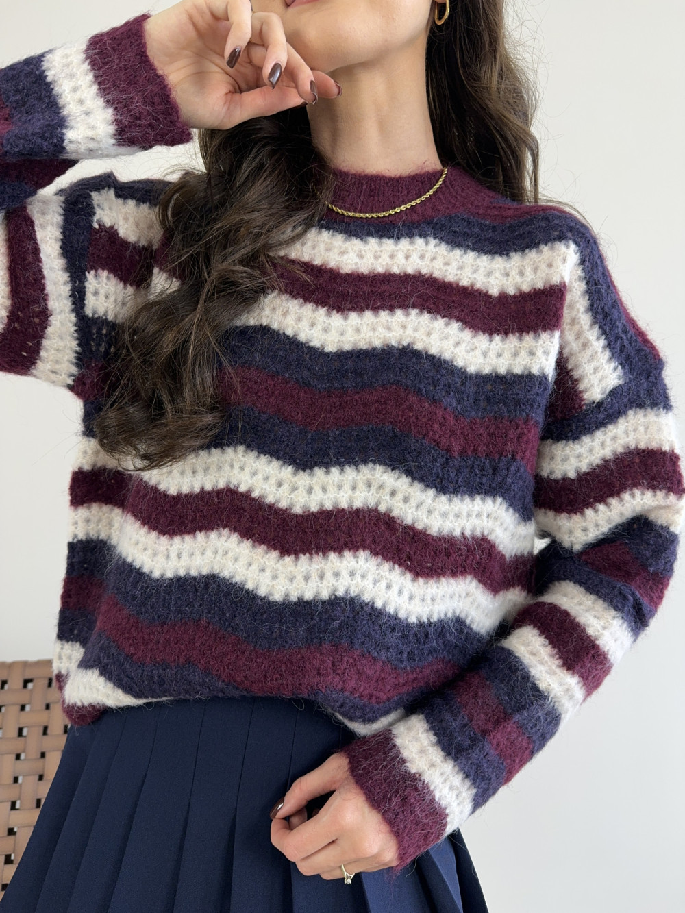 Sweter w granatowo-bordowe paski ażurowy AMARI