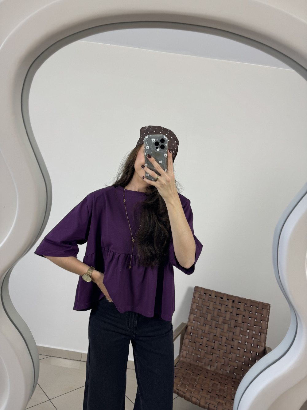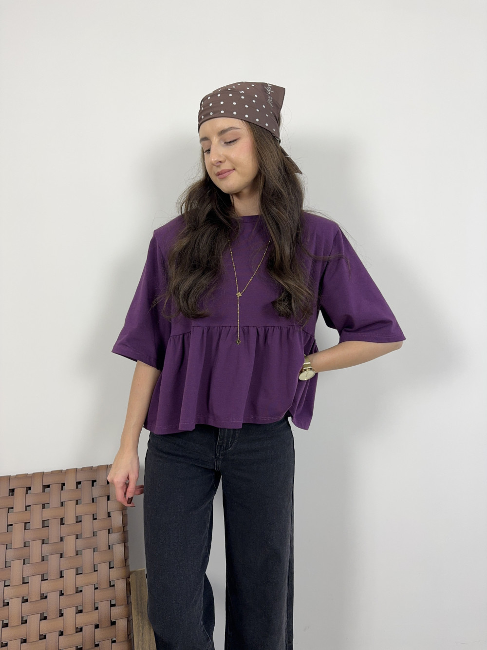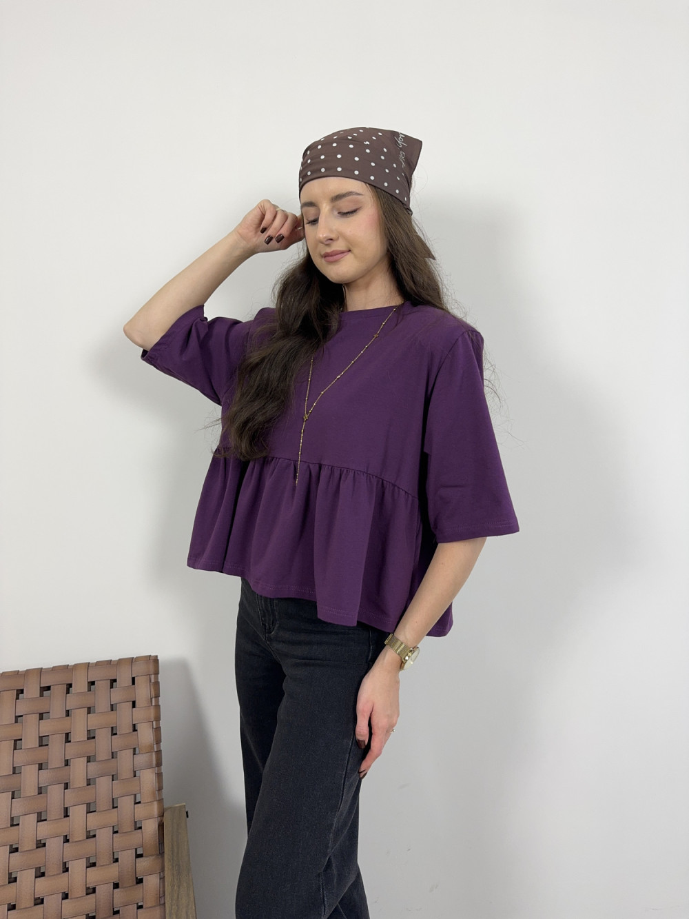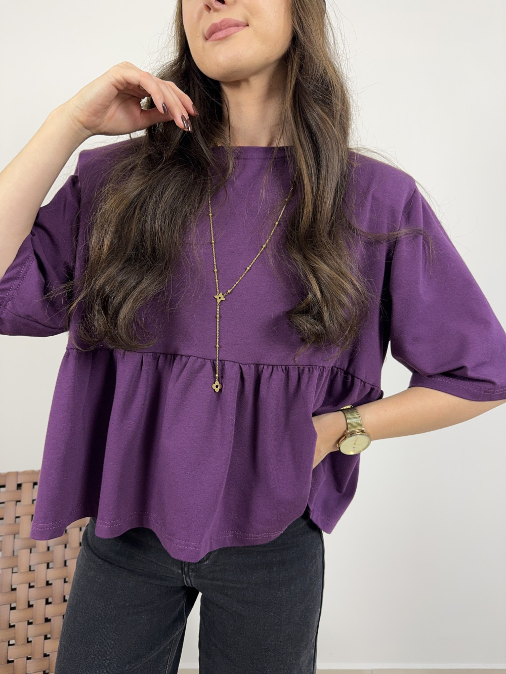 Bluzka bawełniana z baskinką i poduszkami śliwkowa MIRA