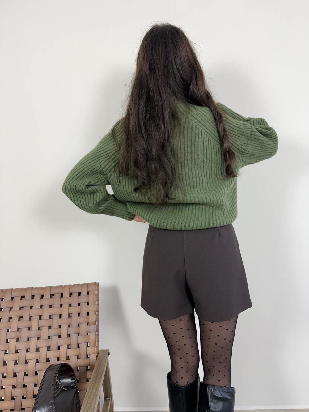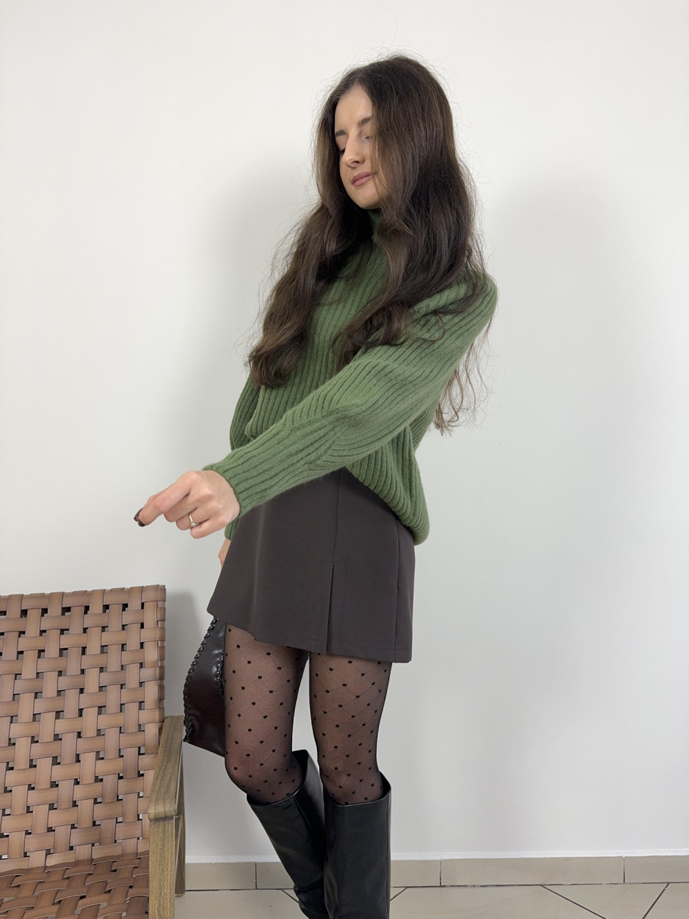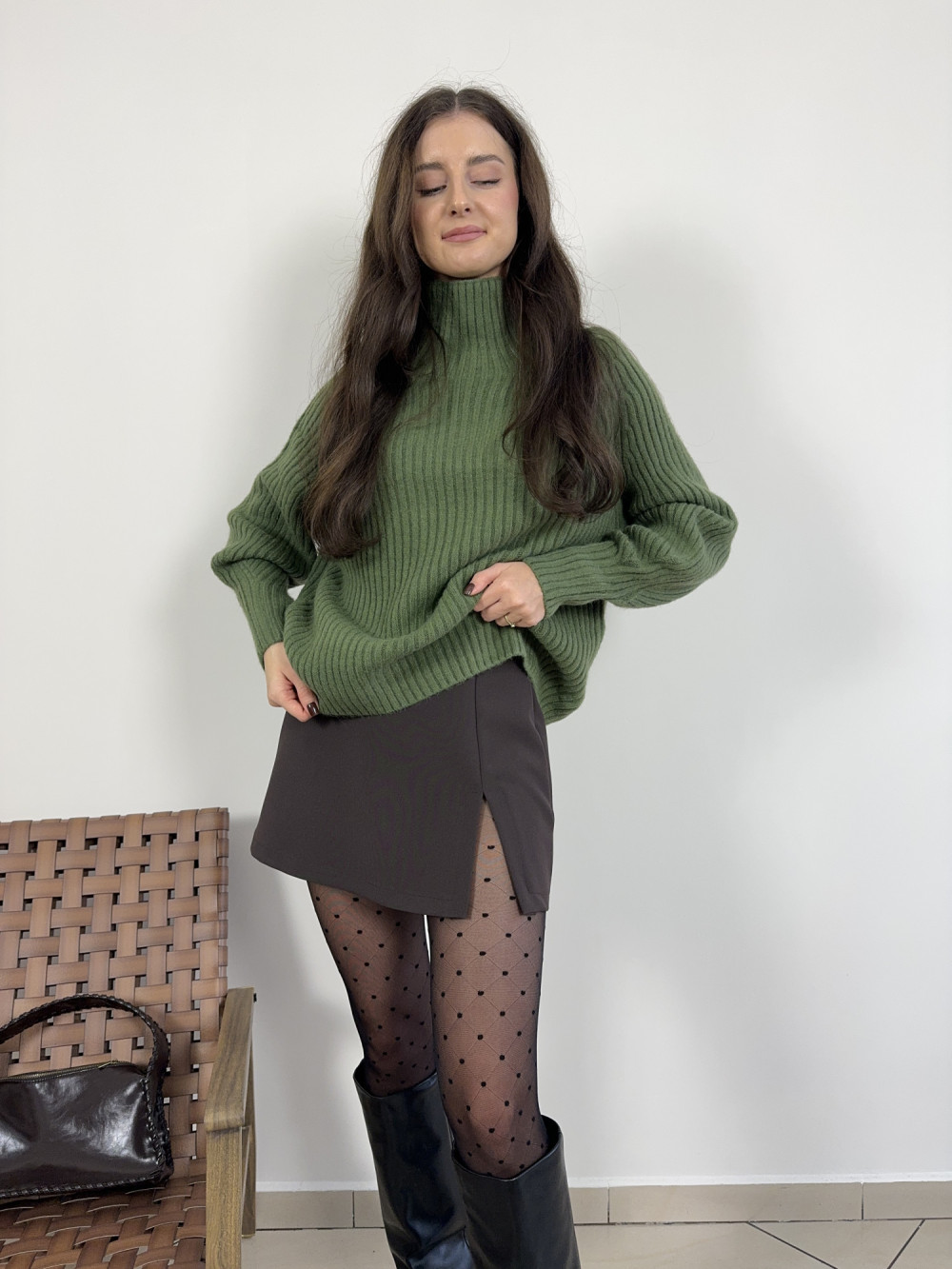 Mięsisty, ciepły sweter Green o luźnym, oversize’owym kroju. Wykonany w 50% z wiskozy, jest przyjemny w dotyku, nie gryzie i pięknie układa się na sylwetce. Ma modny golf i obniżoną linię ramion, dzięki czemu wygląda stylowo zarówno w codziennych, jak i eleganckich stylizacjach.