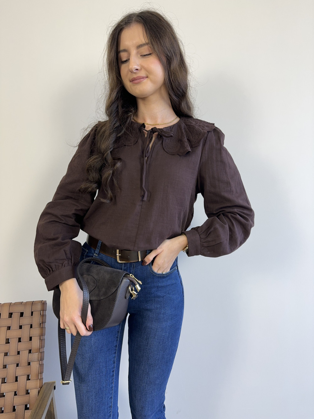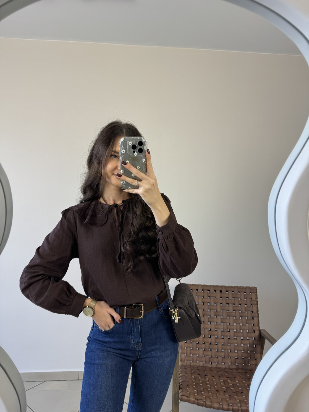 Bluzka z ozdobnym kołnierzem 100% bawełna czekoladowa MAURA