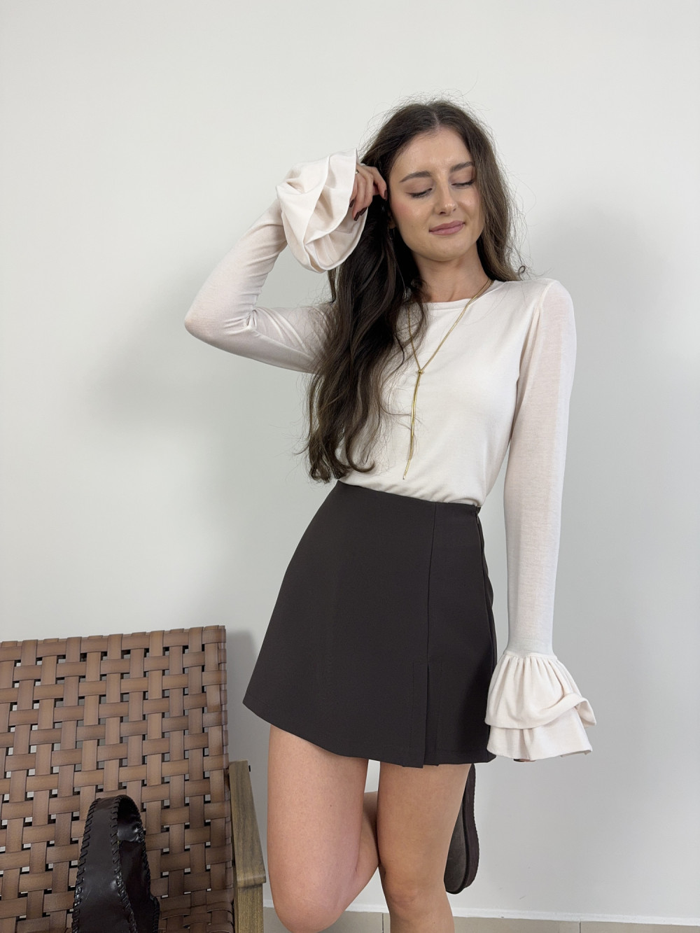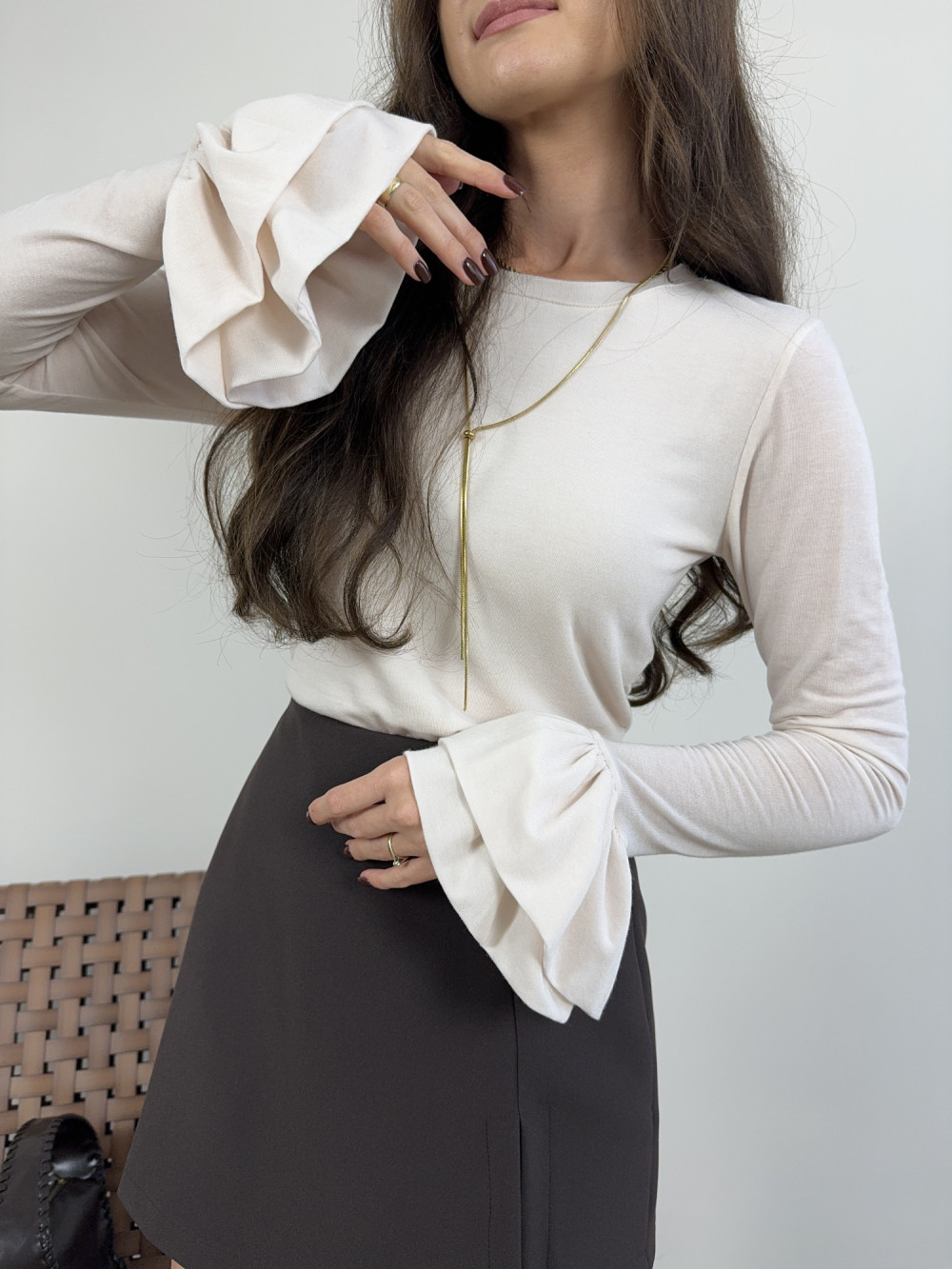 Bluzka o dopasowanym kroju z rękawami typu dzwonek beżowa FLARE