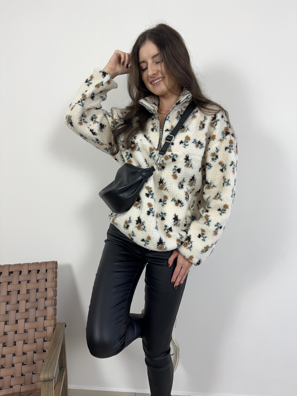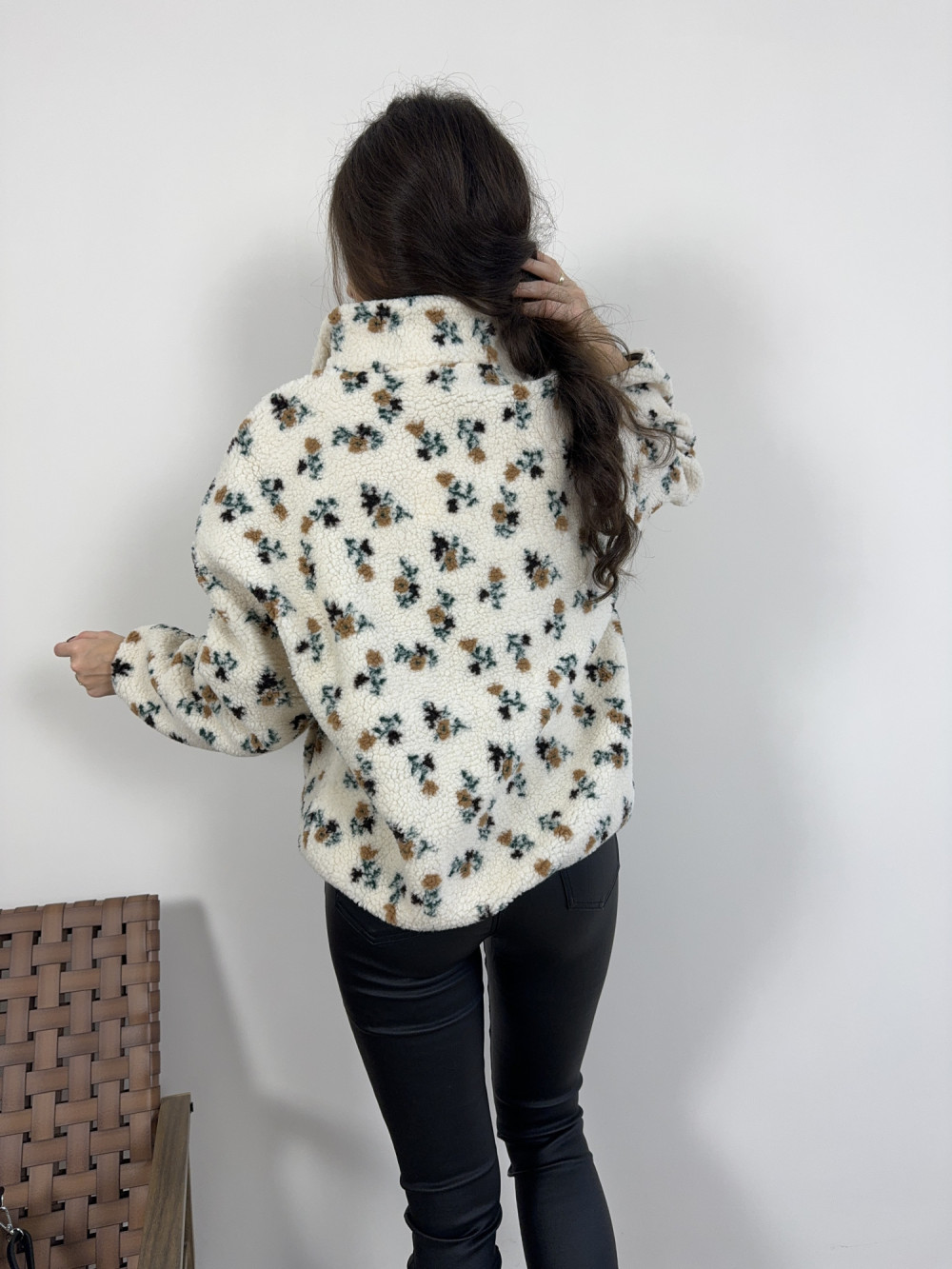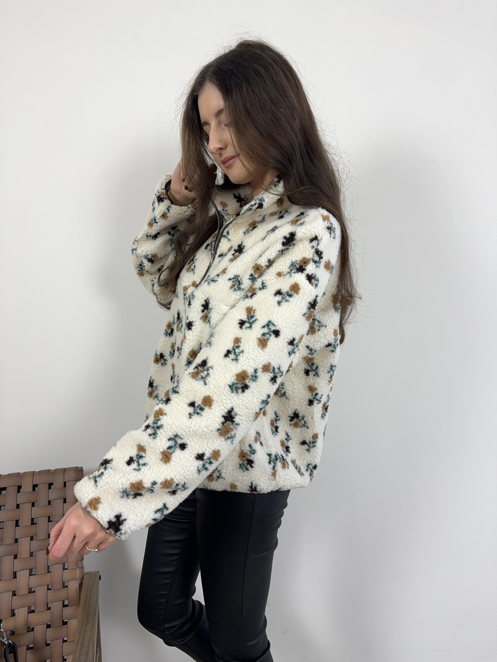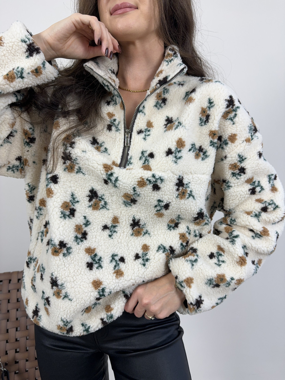 Uroczy polar Daisy w drobne kwiatki to idealny wybór na chłodne dni. Nie posiada podszewki, ale dzięki miękkiej, puszystej tkaninie jest bardzo ciepły i komfortowy w noszeniu. Ma krótki suwak przy szyi i lekko oversize’owy krój, co dodaje mu sportowego luzu i uroku.