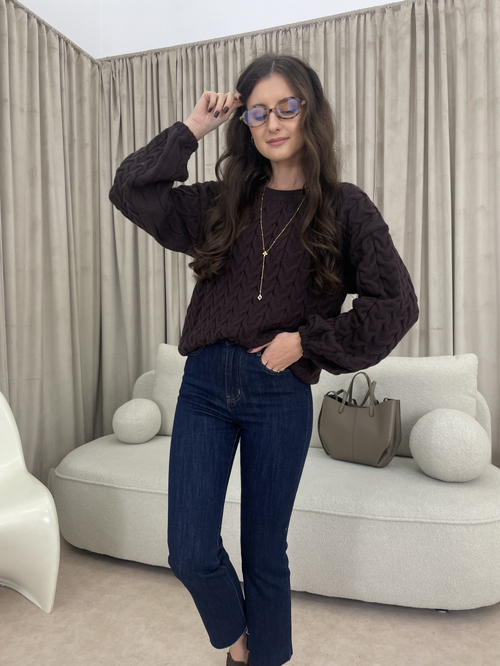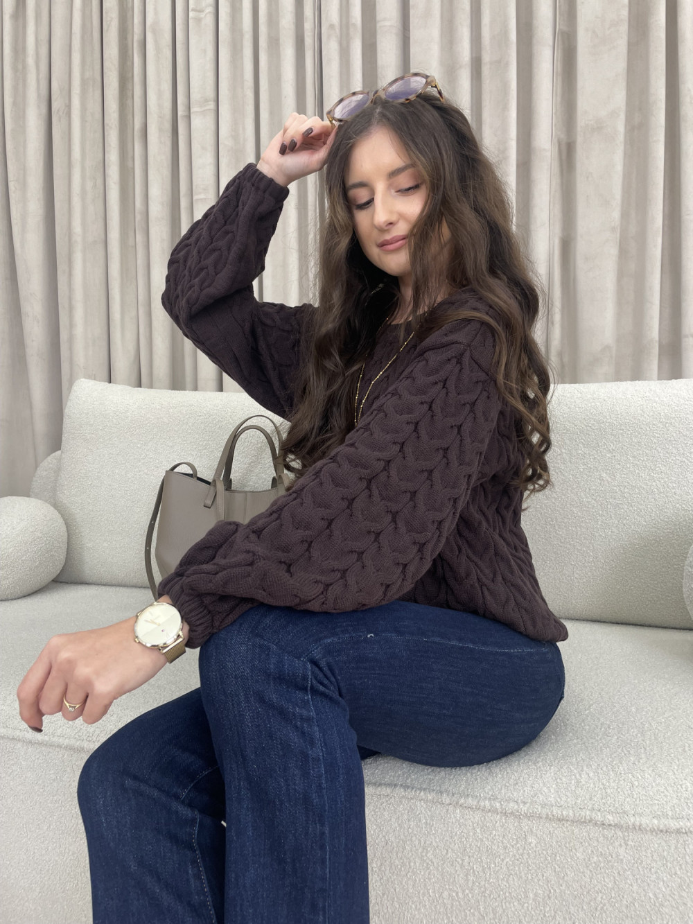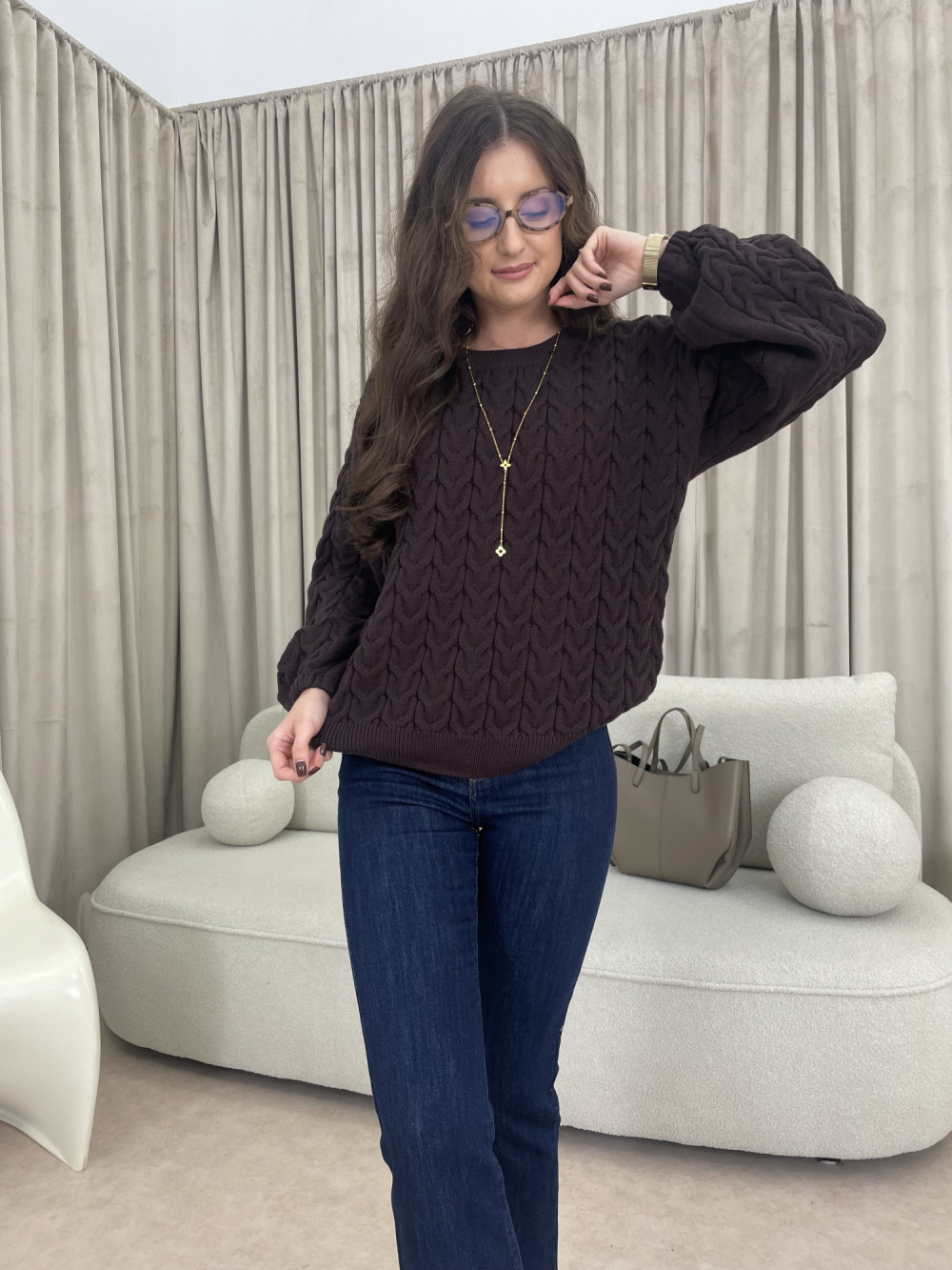 Sweter o warkoczykowym splocie czekoladowy JERRY
