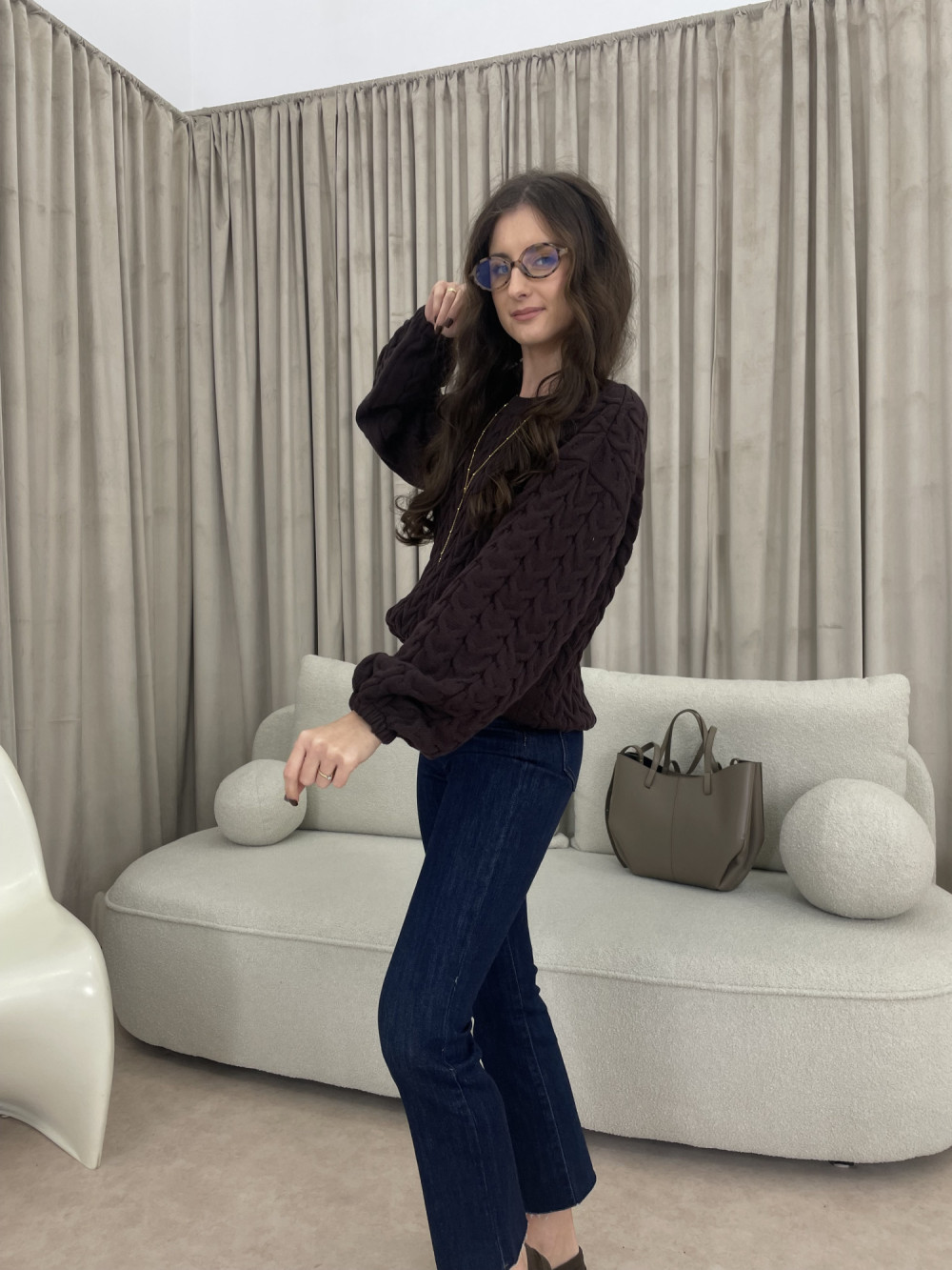 Czekoladowy sweter o klasycznym warkoczowym splocie, niezwykle miękki i przyjemny w dotyku. Uszyty z mieszanki wiskozy i kaszmiru, dzięki czemu jest ciepły i przyjemny w noszeniu. Idealny na chłodniejsze dni – sprawdzi się w połączeniu z jeansami, spódniczką czy pod marynarką. Polska produkcja, dopracowana w każdym detalu.