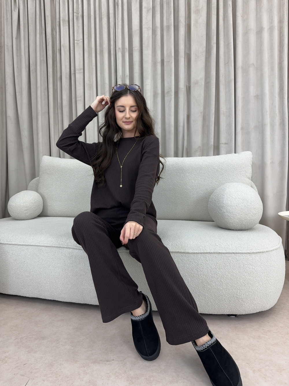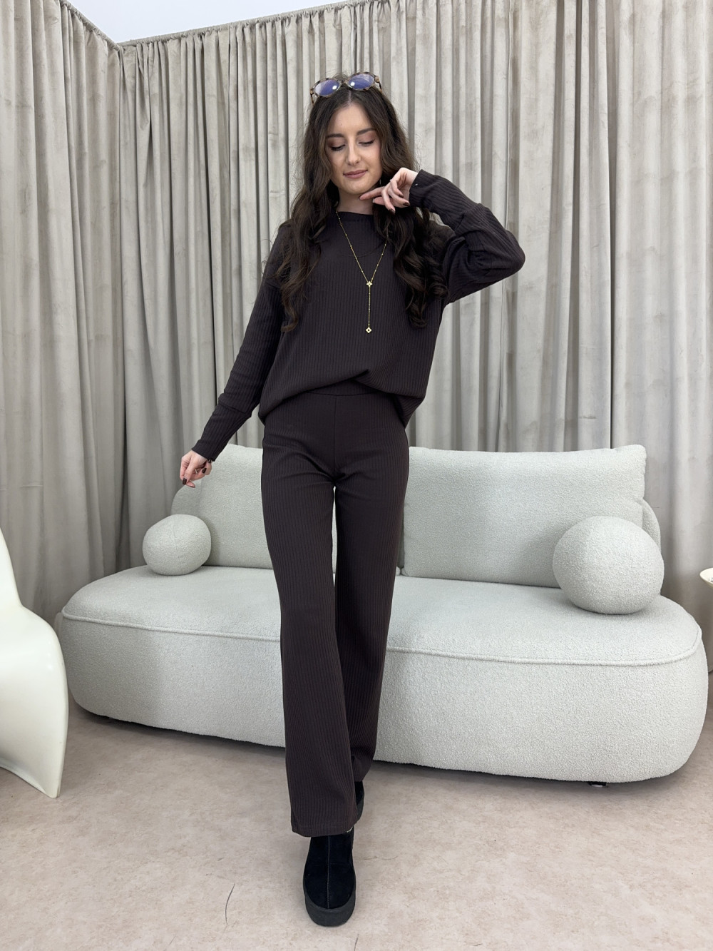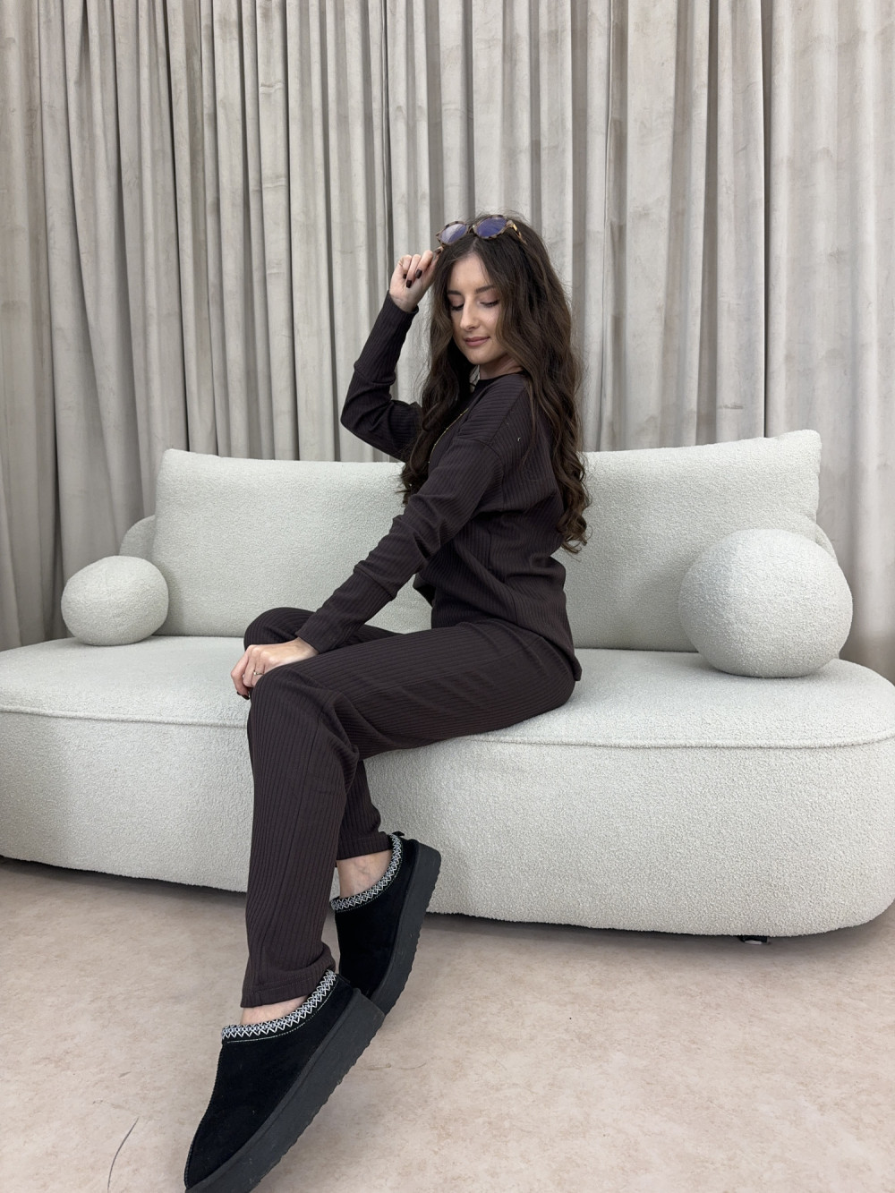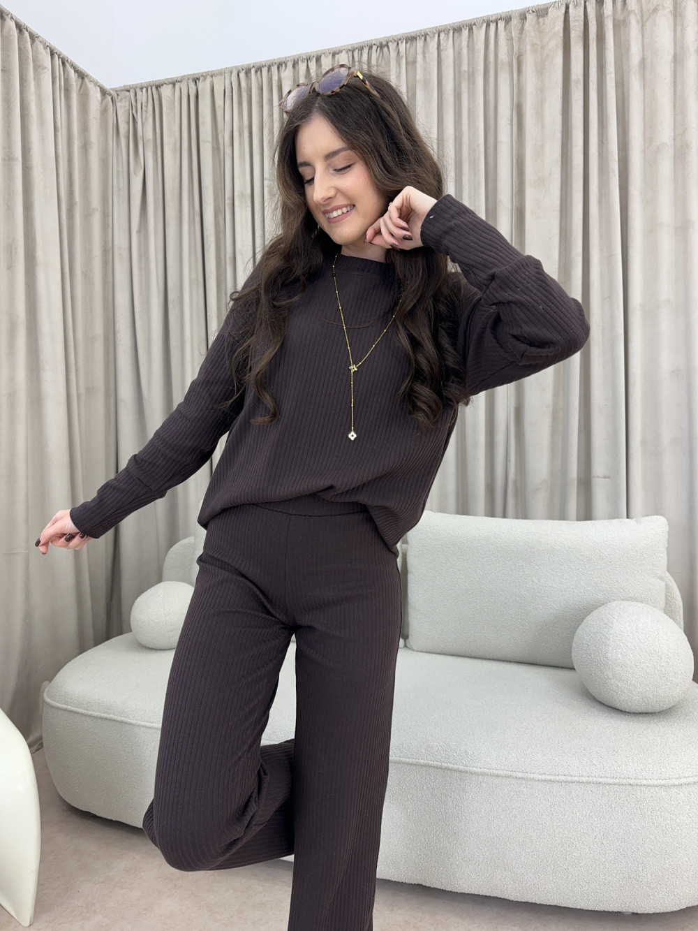 Bawełniany komplet z prążkowanej dzianiny – składa się z oversize’owej bluzy i spodni o lekko rozszerzanych nogawkach. Materiał jest miękki, elastyczny i przyjemny w dotyku, a jednocześnie zachowuje kształt przez cały dzień. Bluza ma luźny krój i obniżoną linię ramion, spodnie wygodną talię z elastyczną gumką. To idealne połączenie wygody i minimalistycznej elegancji.