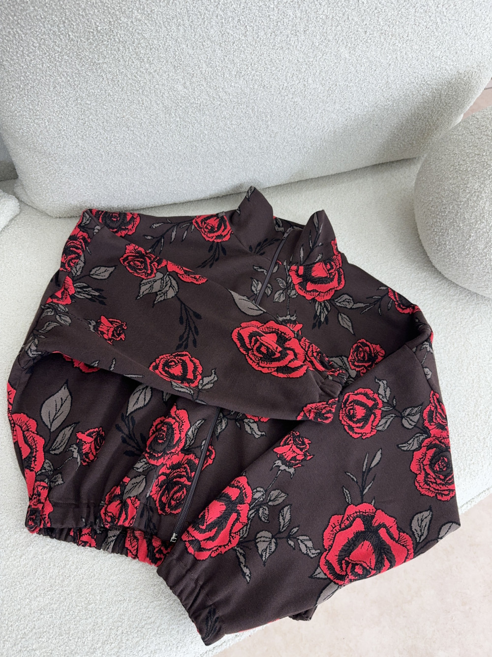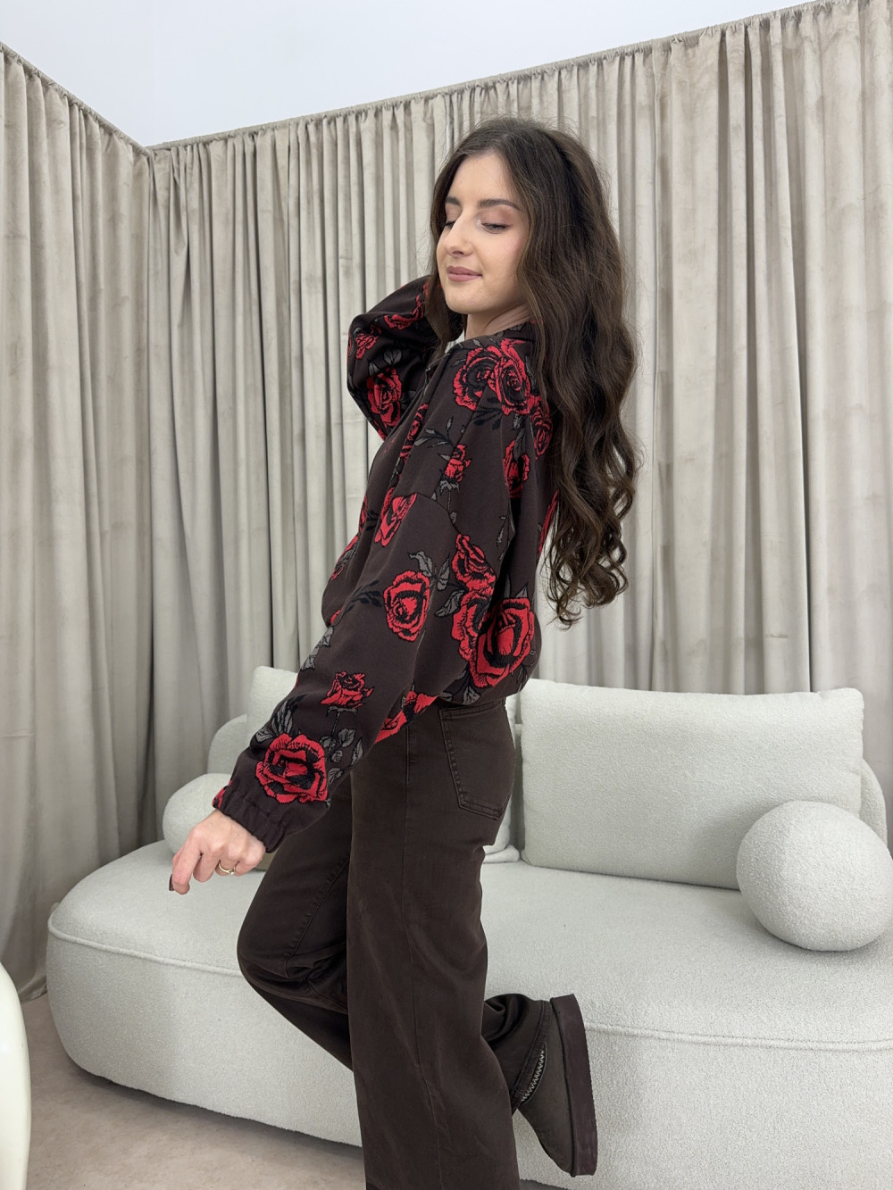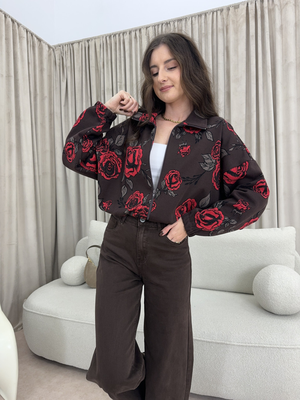 Rozpinana bluza w kwiatowy wzór, wykonana w Polsce z wysokiej jakości bawełny. Ma prosty, lekko oversize’owy krój i wyraźny kołnierzyk, który dodaje jej charakteru. Intensywny, czerwony motyw róż na czekoladowym tle przyciąga wzrok, a miękka tkanina zapewnia pełen komfort noszenia. Model idealny na co dzień – lekki, ale wyrazisty.
