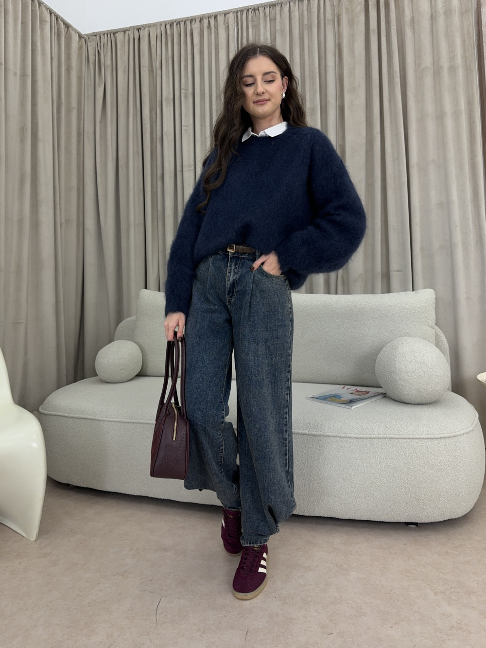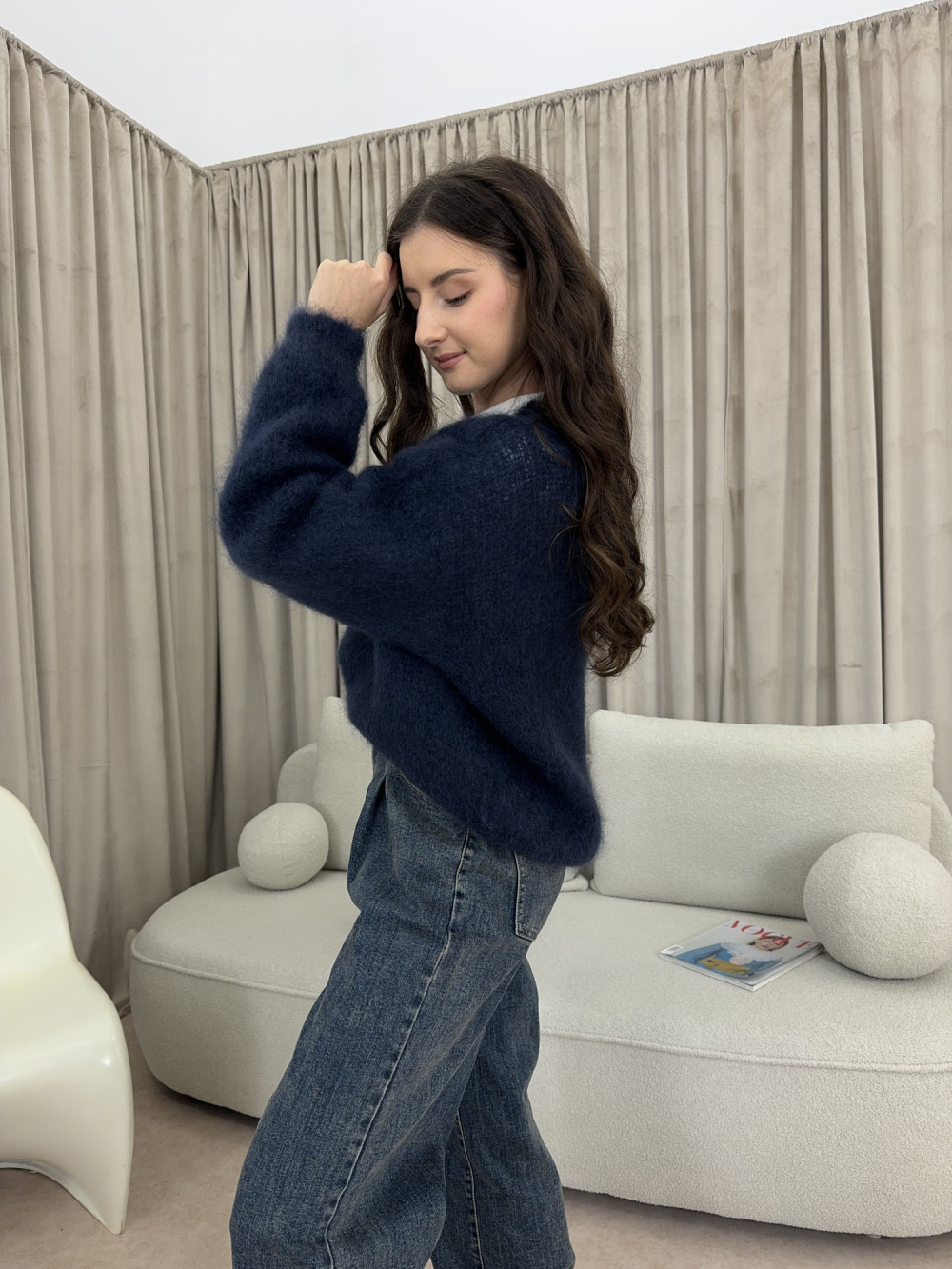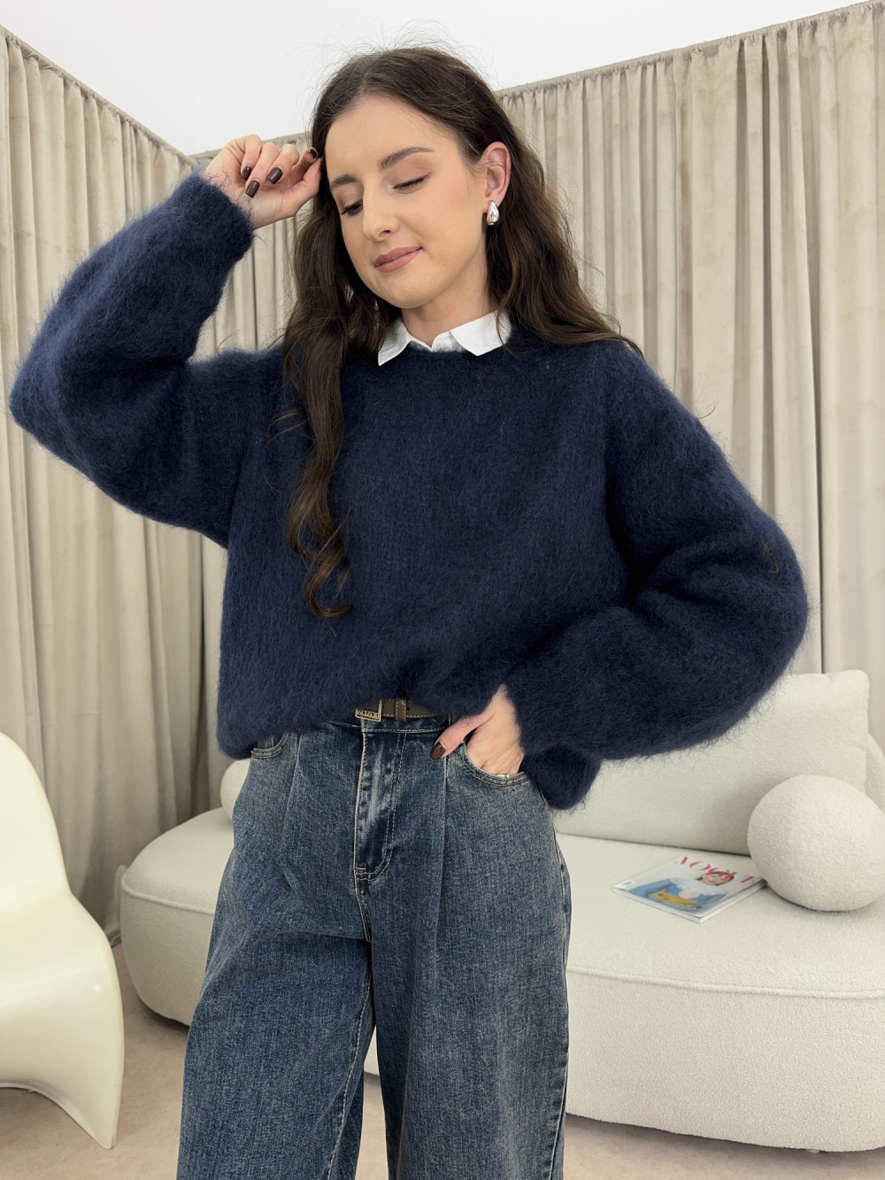 Granatowy sweter z kolekcji premium, wykonany w 80% z kid moheru. Lekki, puszysty i przyjemny w dotyku, zachwyca miękkością i subtelnym połyskiem włókien. Ma prosty krój z delikatnym obniżeniem ramion, dzięki czemu układa się naturalnie i swobodnie. To sweter, który łączy komfort z elegancją – idealny na chłodniejsze dni.