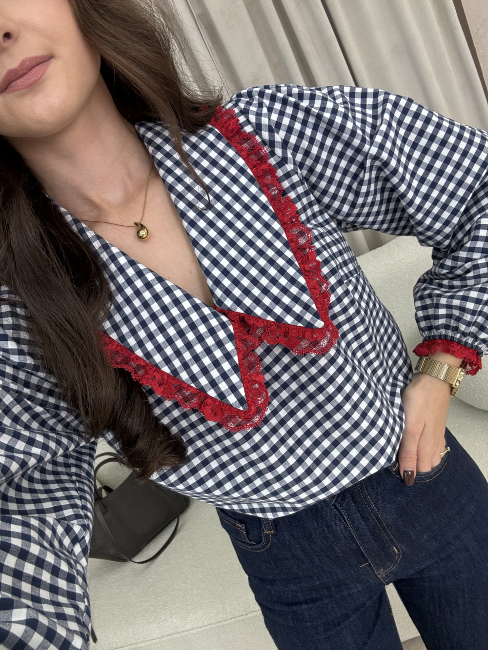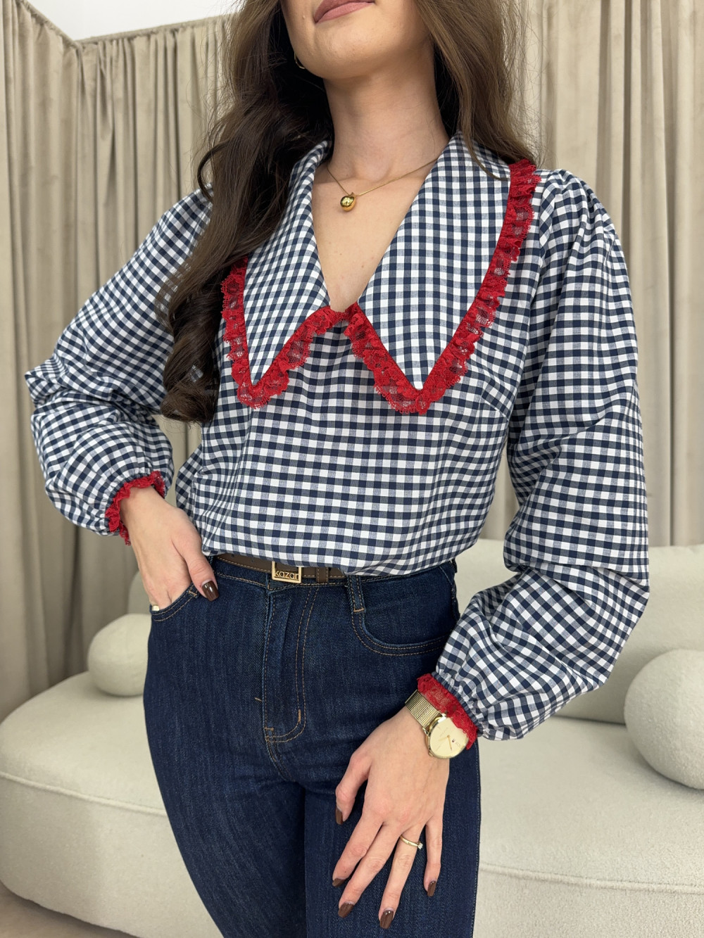 Bluzka w drobną kratkę zachwyca dużym kołnierzykiem wykończonym delikatną koronką. Uszyta w 70% z bawełny, jest przewiewna i bardzo komfortowa w noszeniu. Bufiaste rękawy z mankietami nadają jej romantycznego charakteru. To model, który przyciąga wzrok i idealnie wpisuje się w trend retro. Świetnie sprawdzi się w połączeniu z jeansami lub spódnicą z wysokim stanem.