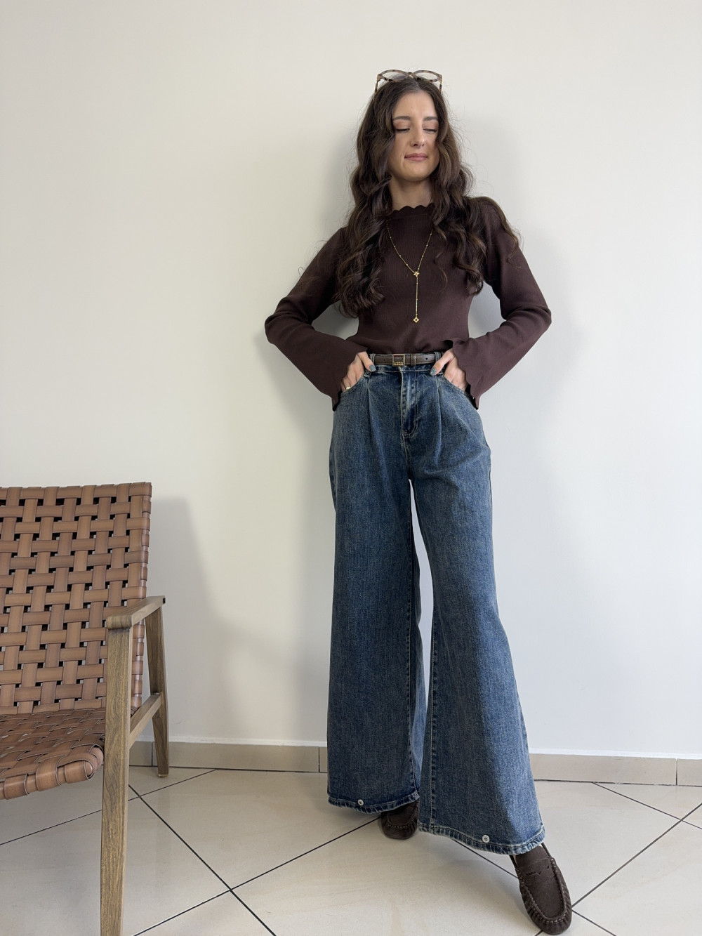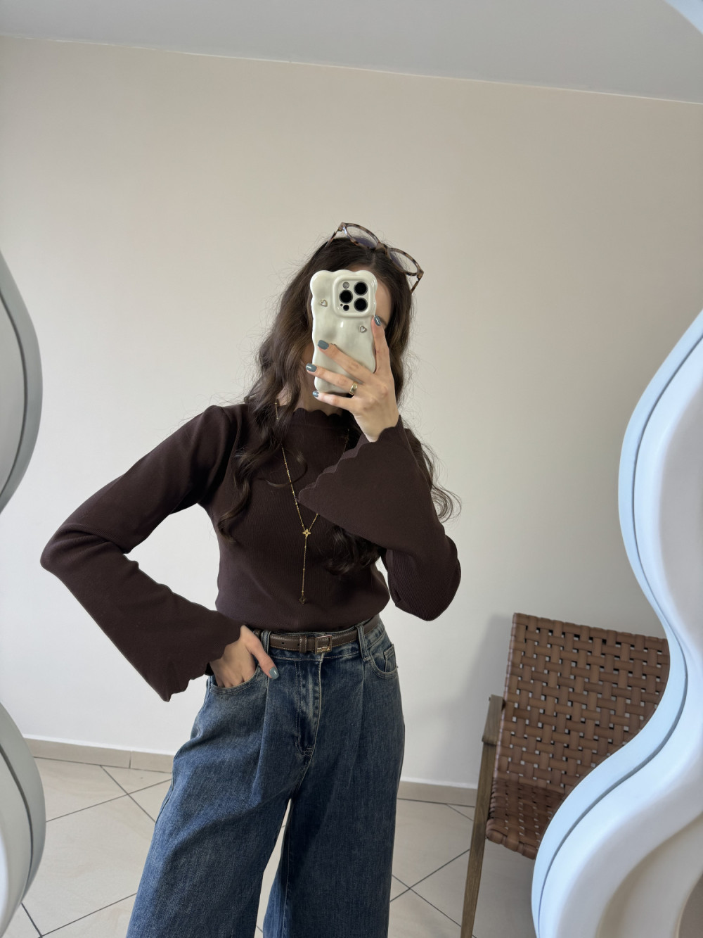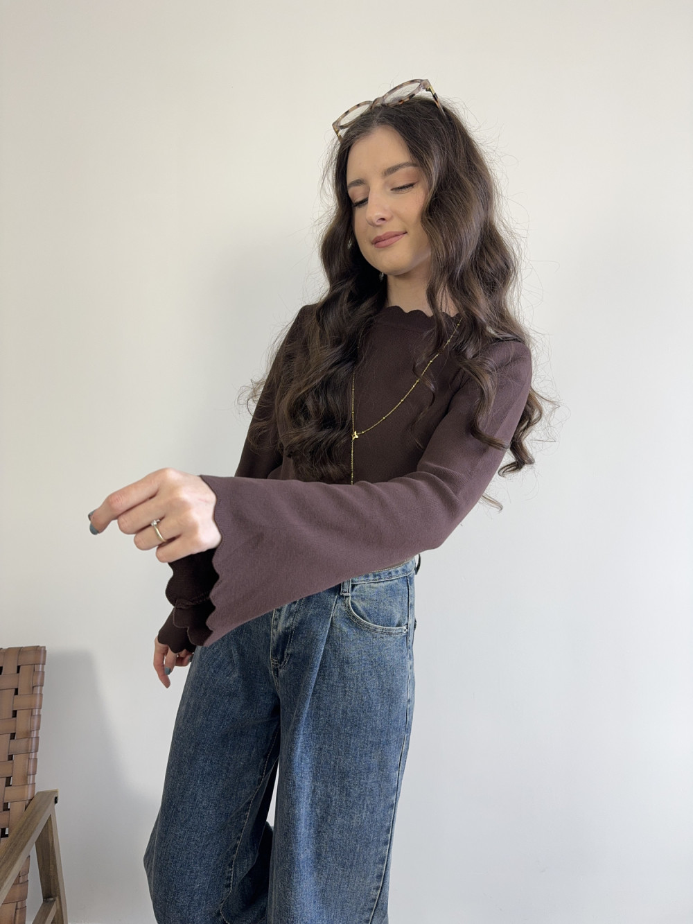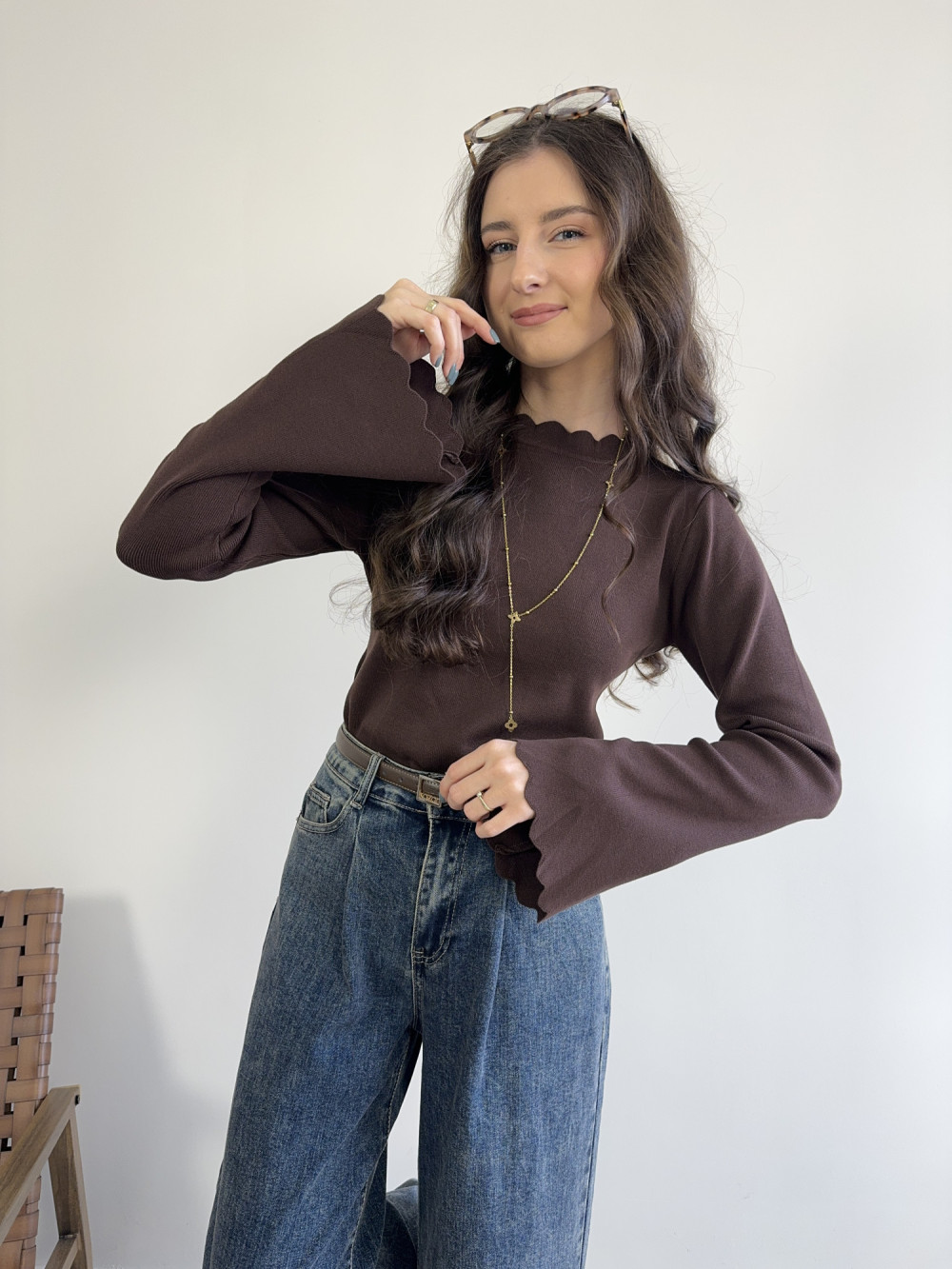 Czekoladowa bluzka z wyjątkowym wykończeniem — delikatnie pofalowany dekolt i rękawy tworzą efekt subtelnej falbanki. Materiał jest elastyczny, miękki i ładnie dopasowuje się do sylwetki, a dłuższe rękawy z lekkim rozszerzeniem nadają jej kobiecego charakteru. Idealna baza pod eleganckie stylizacje i codzienne outfity.