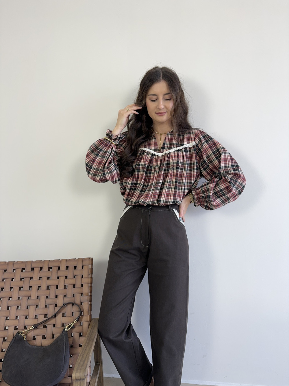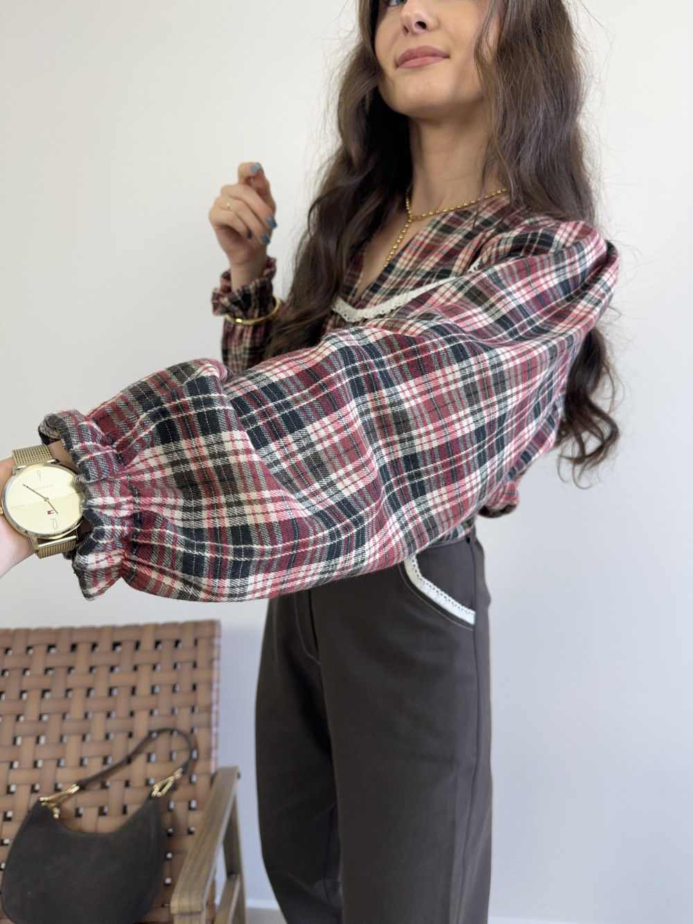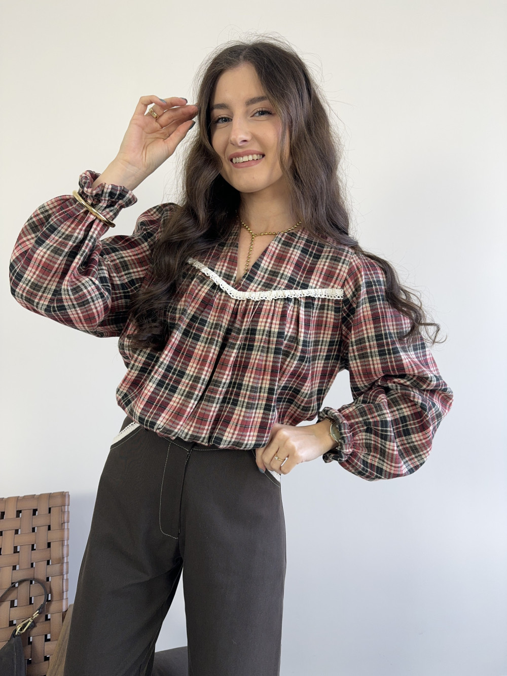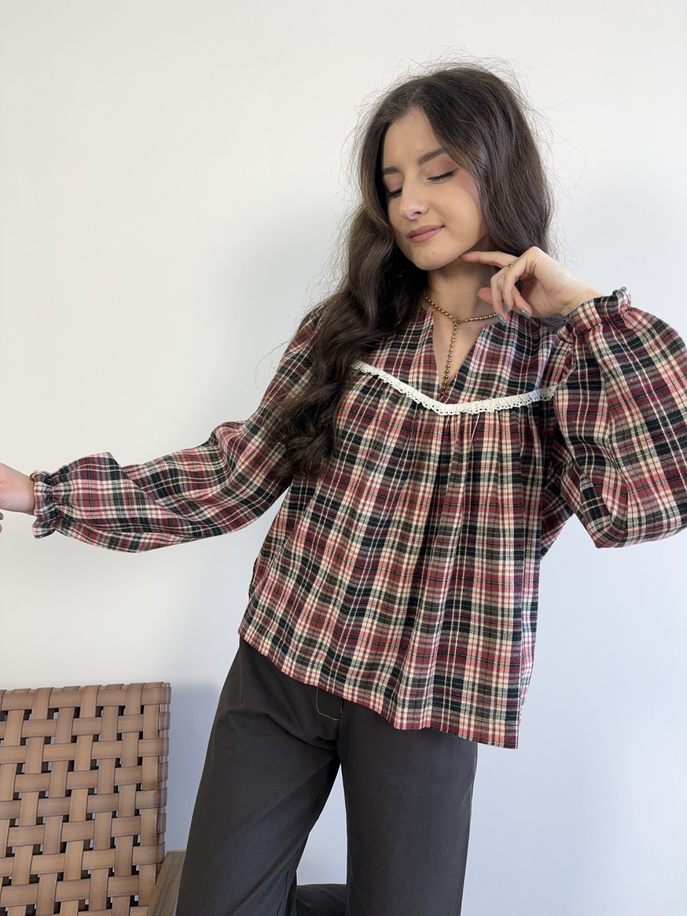 Bluzka w kratę z koronką czerwona MILAGRO