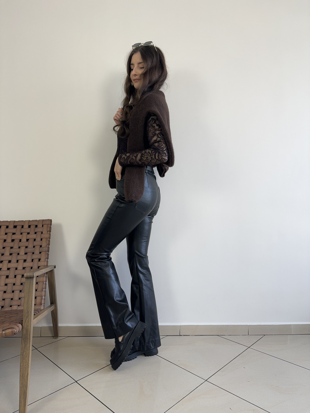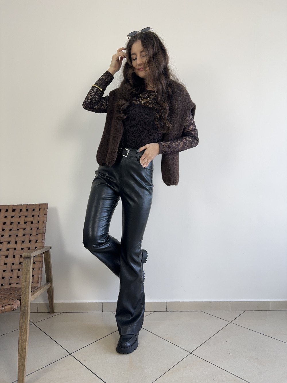 Spodnie z eko-skóry o lekko rozszerzanej nogawce i wysokim stanie. W zestawie pasek z tej samej tkaniny, który pięknie podkreśla talię. Uszyte z miękkiego, elastycznego materiału, który dopasowuje się do sylwetki, nie ograniczając ruchów .Pod spodem ma meszek. Idealne połączenie elegancji i wygody — pasują zarówno do koszul, jak i swetrów oversize.