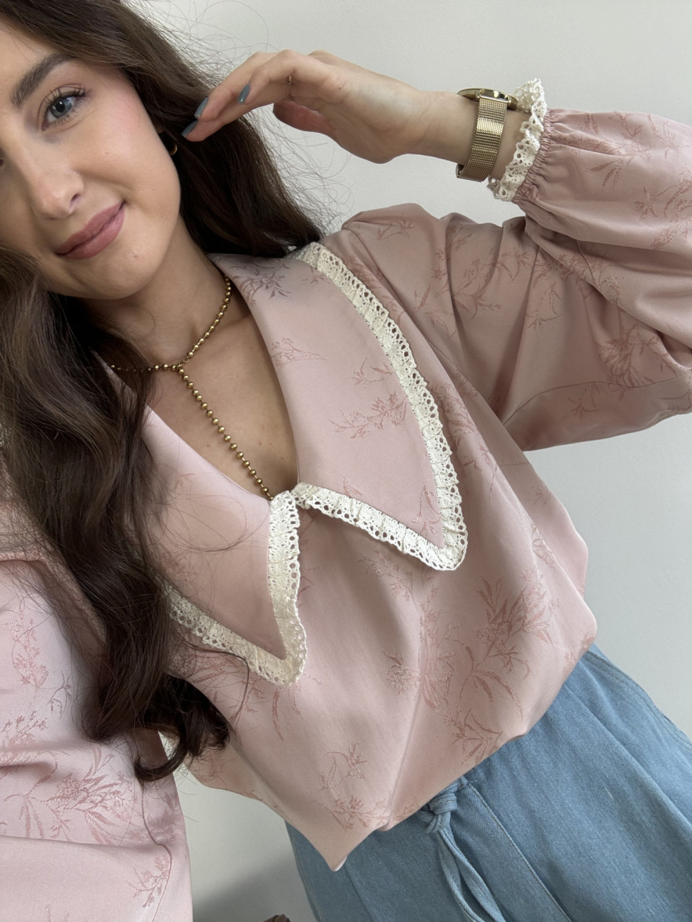 Bluzka z szerokim, ozdobnym kołnierzem wykończonym koronką. Uszyta w 100% z wiskozy — lekka, przewiewna i bardzo przyjemna w dotyku. Ma delikatny, kwiatowy wzór w materiale i bufiaste rękawy zakończone mankietem. Polska produkcja — widać to w dopracowaniu detali i pięknym wykończeniu.