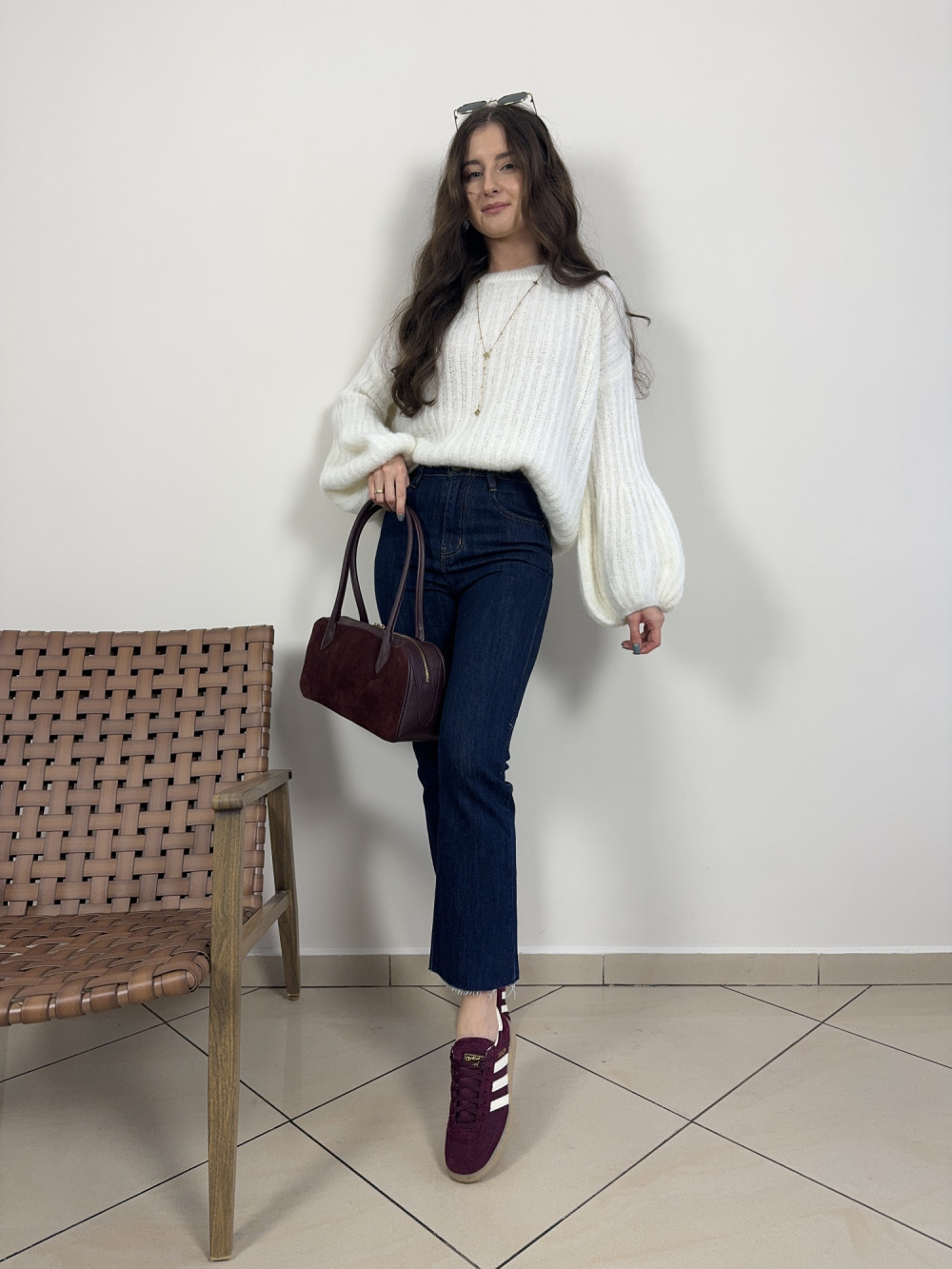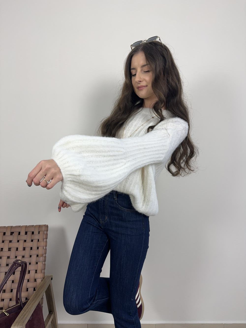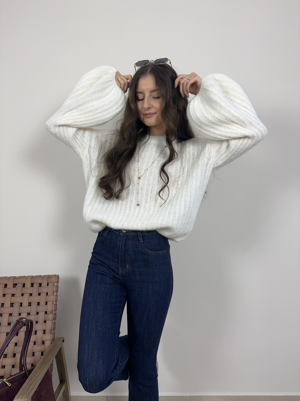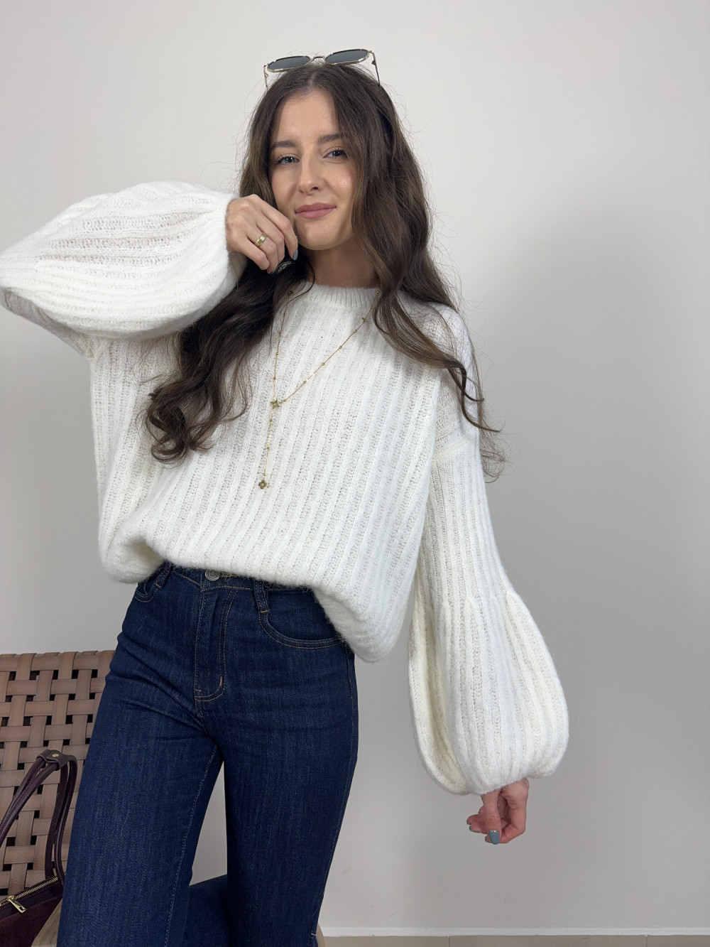 Miękki, luksusowy sweter o luźnym kroju i pięknie bufiastych rękawach. Wykonany z mieszanki włókien premium — 33% alpaki super fine i 8% wełny — otula ciepłem, ale nie gryzie. Materiał jest wyjątkowo lekki, a jednocześnie mięsisty, dzięki czemu sweter wygląda elegancko i stylowo. Idealny do jeansów lub spódnicy, dodaje klasy każdej stylizacji. To model, który zachwyca prostotą i jakością wykończenia.