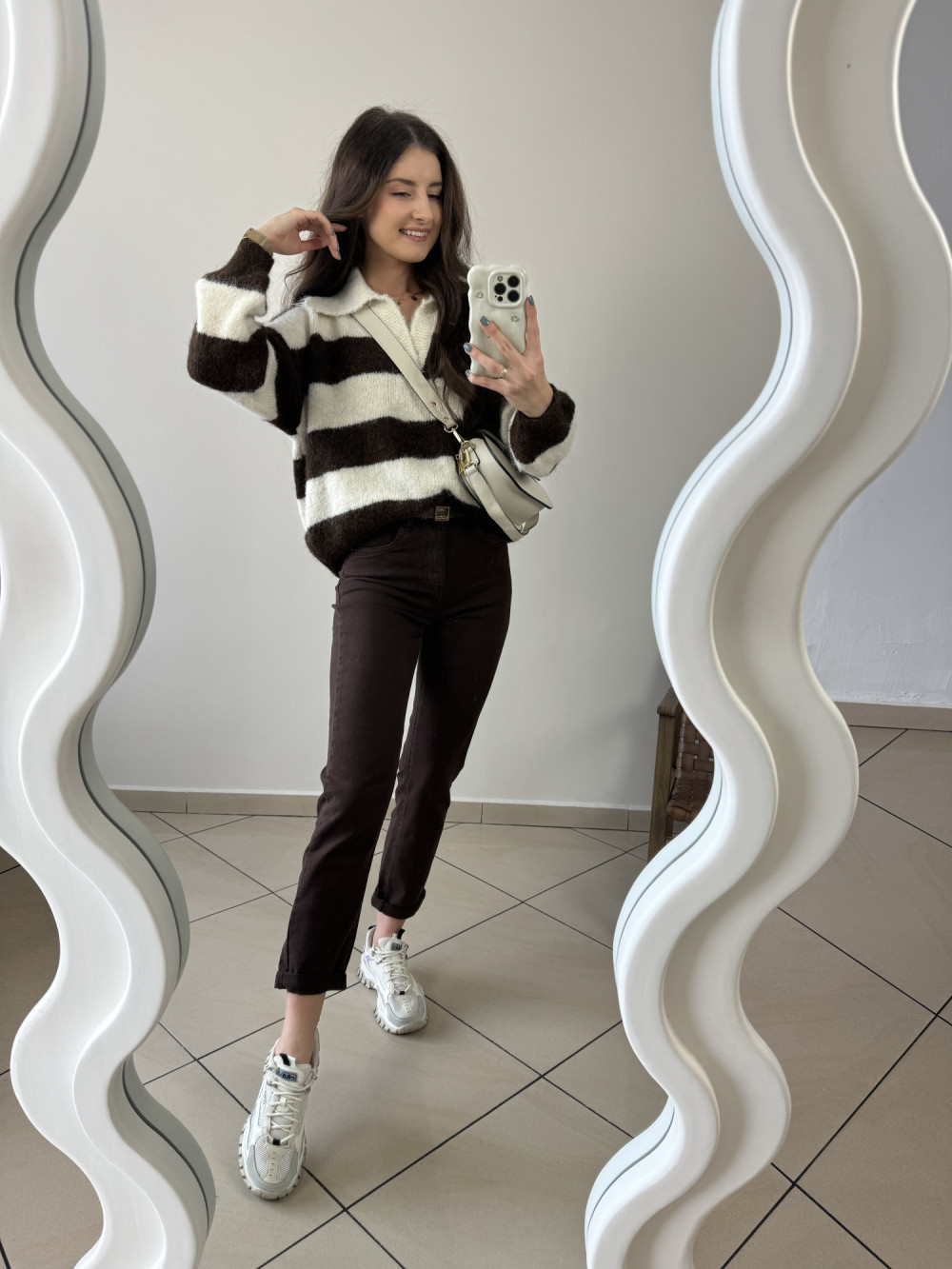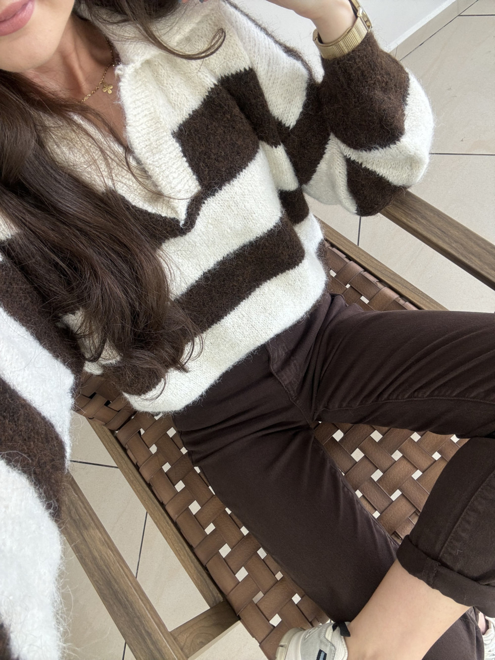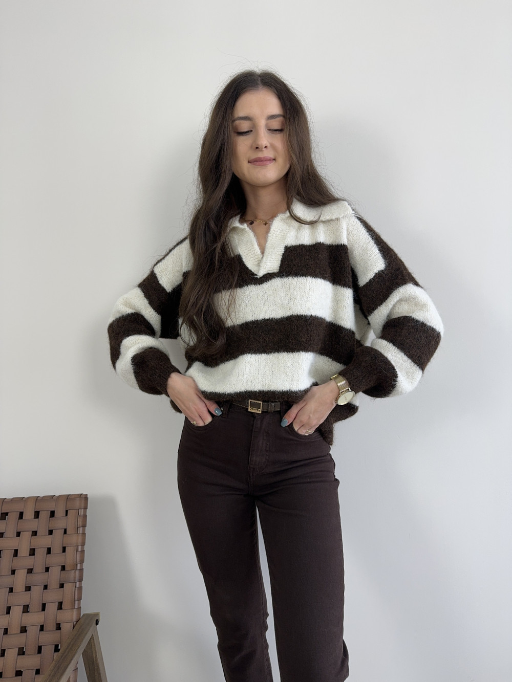 Miękki sweter z kołnierzykiem typu polo i szerokimi paskami to kwintesencja stylu. W składzie znajdziesz m.in. domieszkę wełny — nie gryzie i przyjemnie otula ciało. Jego fason jest lekko oversize, dzięki czemu świetnie układa się na sylwetce. To model, który wygląda równie dobrze z jeansami, jak i z eleganckimi spodniami.