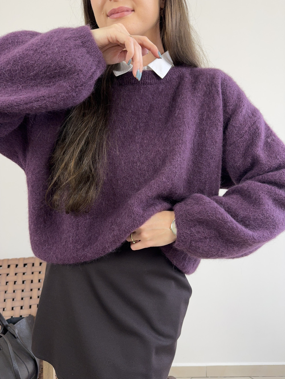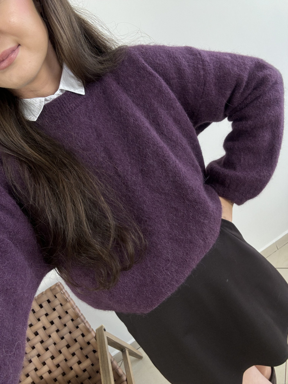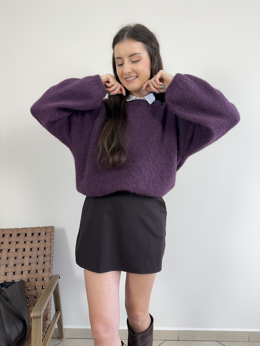 Miękki jak chmurka sweter premium — w składzie 52% baby alpaki i 13% wełny. Delikatny, niegryzący i niezwykle przyjemny w dotyku. Ma klasyczny krój z lekko obniżonym ramieniem i delikatnie bufiastymi rękawami. Doskonale łączy się z jeansami, eleganckimi spodniami lub spódnicą. Dostępny również w kolorze śliwkowym.
