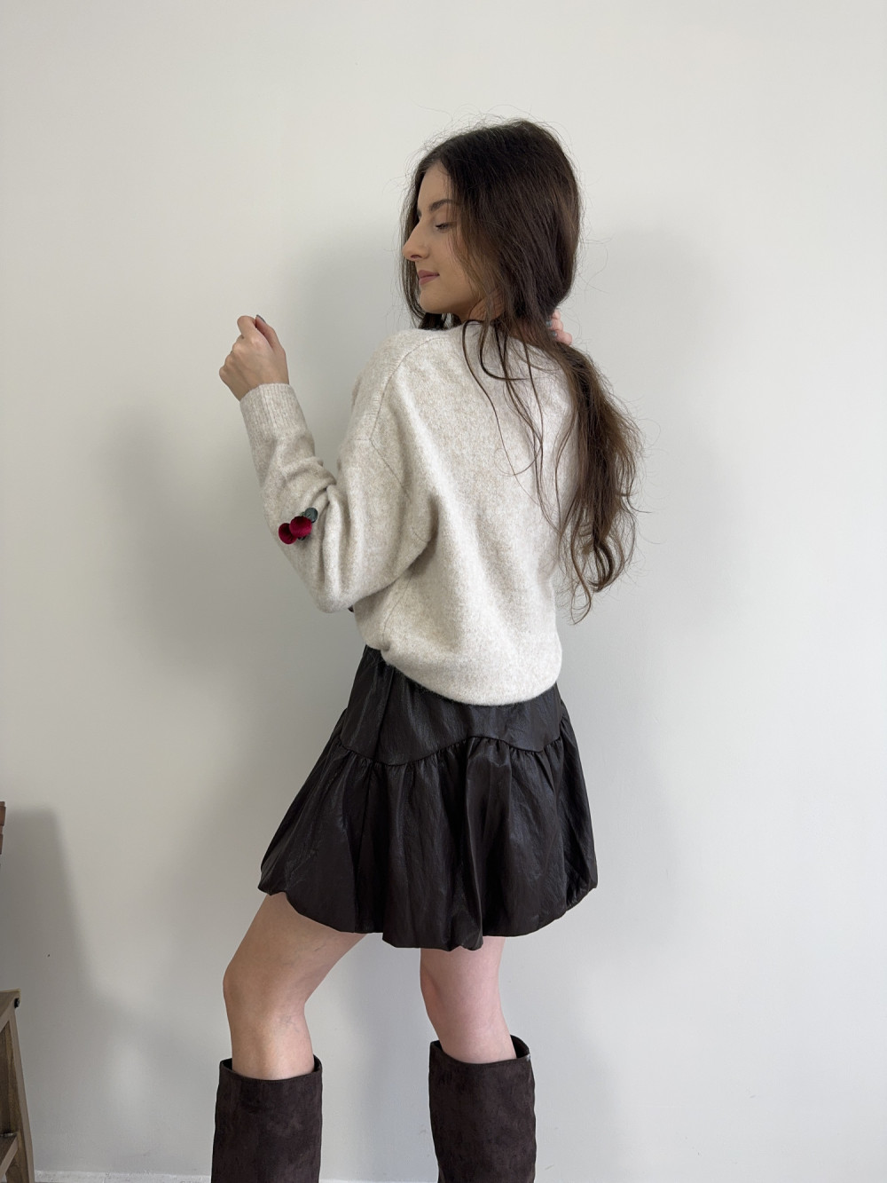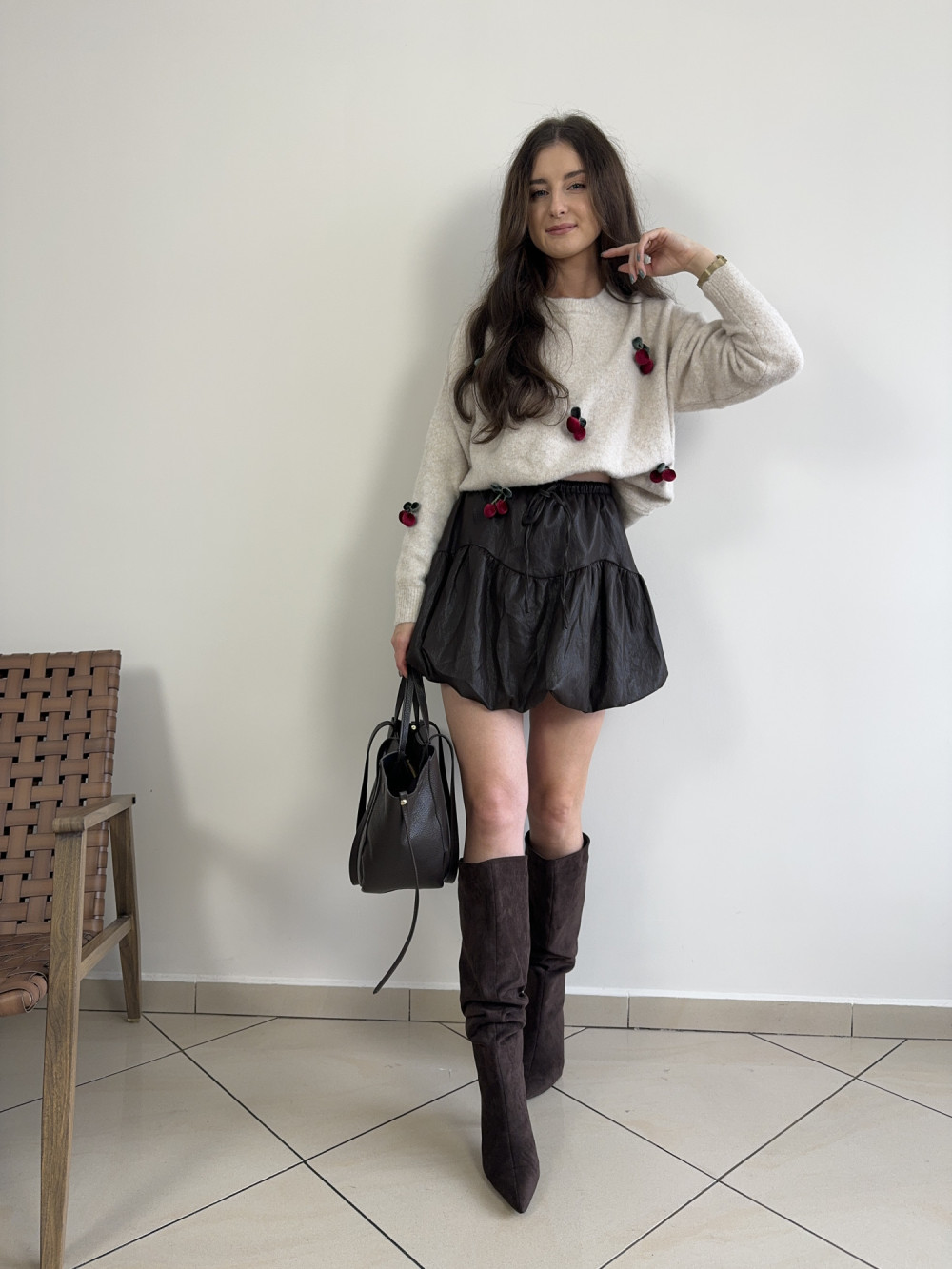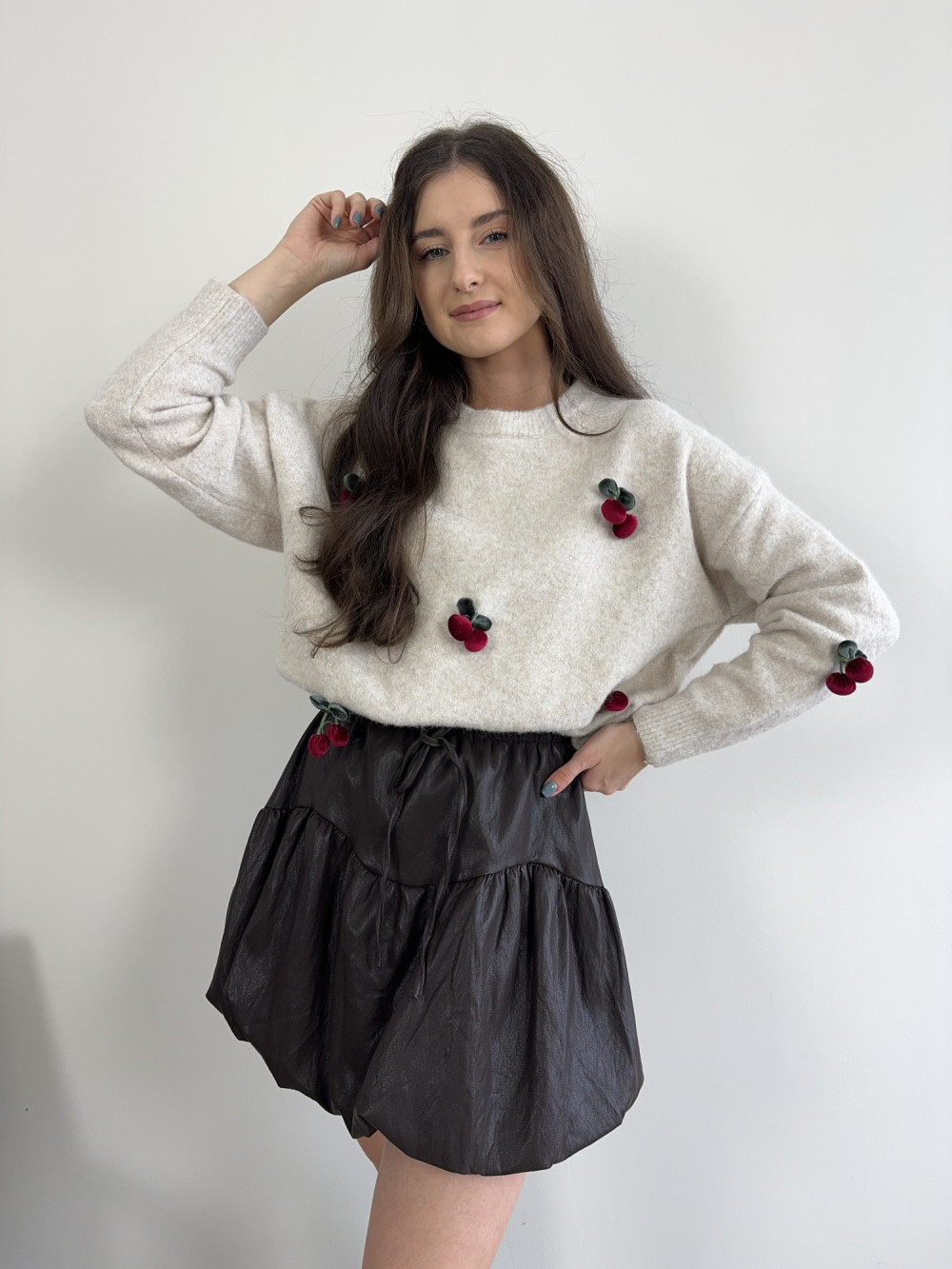 Miękki, puszysty sweterek z aplikacjami 3D w kształcie wisienek — totalny hit dla miłośniczek nieoczywistych detali. W składzie m.in. wiskoza i wełna, dzięki czemu jest przyjemny w dotyku i nie gryzie. Krój klasyczny z delikatnie obniżoną linią ramion, co dodaje mu luzu i dziewczęcego uroku. Pięknie łączy się z jeansami, spódnicą lub spodniami z wysokim stanem. Idealny wybór na chłodniejsze dni, gdy chcesz wyglądać wyjątkowo i czuć się komfortowo.
