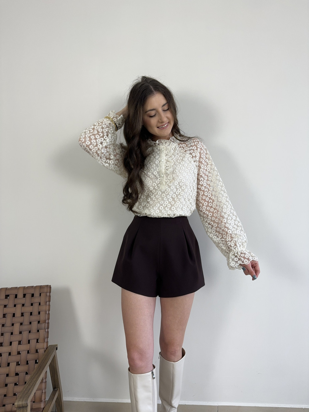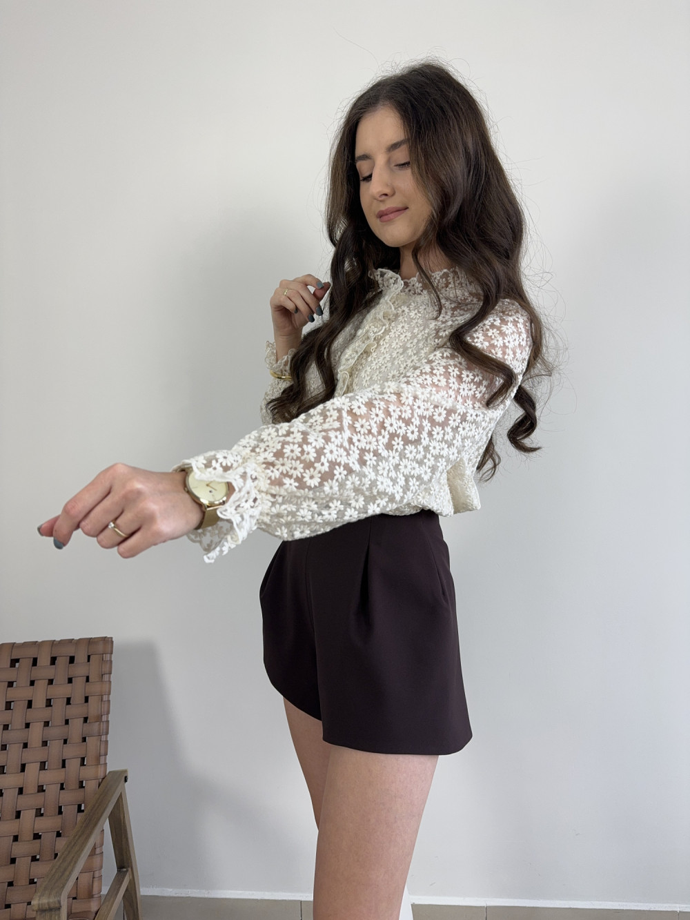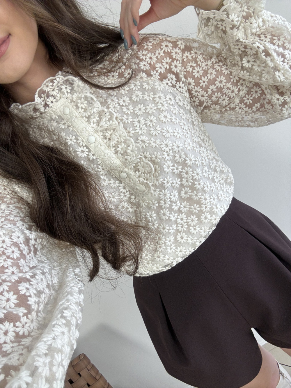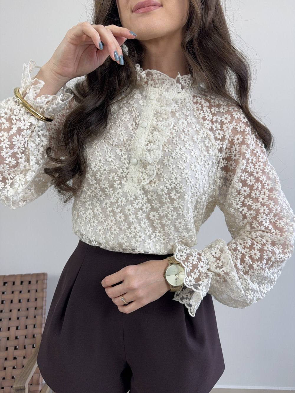 Subtelna, kobieca koszula z koronkowym wzorem w drobne kwiaty. Rękawy są delikatnie prześwitujące, a część na tułowiu ma miękką, bawełnianą podszewkę — nic nie prześwituje. Przy szyi znajduje się lekka stójka i ozdobne marszczenie, które dodaje romantycznego charakteru. Idealna do eleganckich spodni, spódnicy lub krótkich szortów. Stylowa propozycja na co dzień i wyjątkowe okazje.