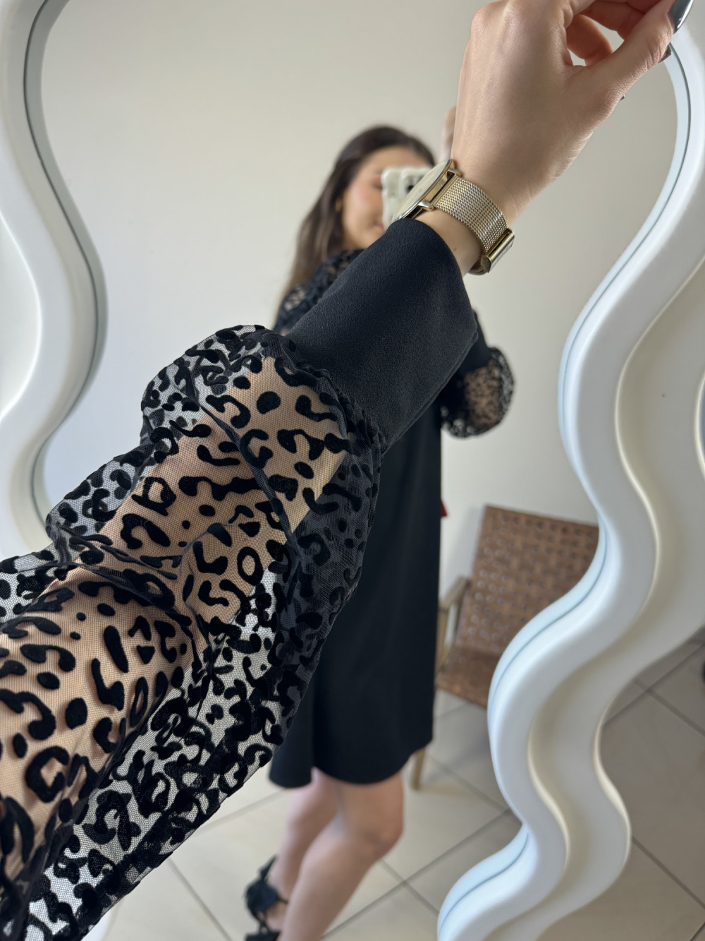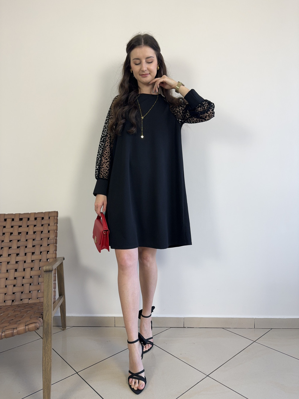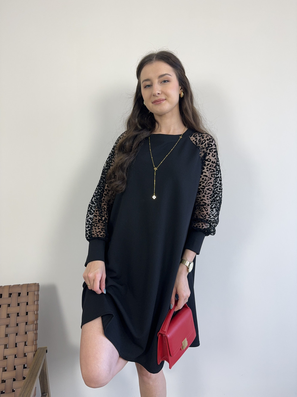 Luźna sukienka o prostym, swobodnym kroju z tiulowymi rękawami w zwierzęcy print — korpus wykonany z lekkiego materiału, rękawy z lekkiego, prześwitującego tiulu. Rękawy mają subtelne marszczenie przy mankiecie, które dodaje objętości, a cały fason nie opinając sylwetki daje pełen komfort ruchu. Brak zapięć — model wkładany przez głowę, gotowy od razu do noszenia.