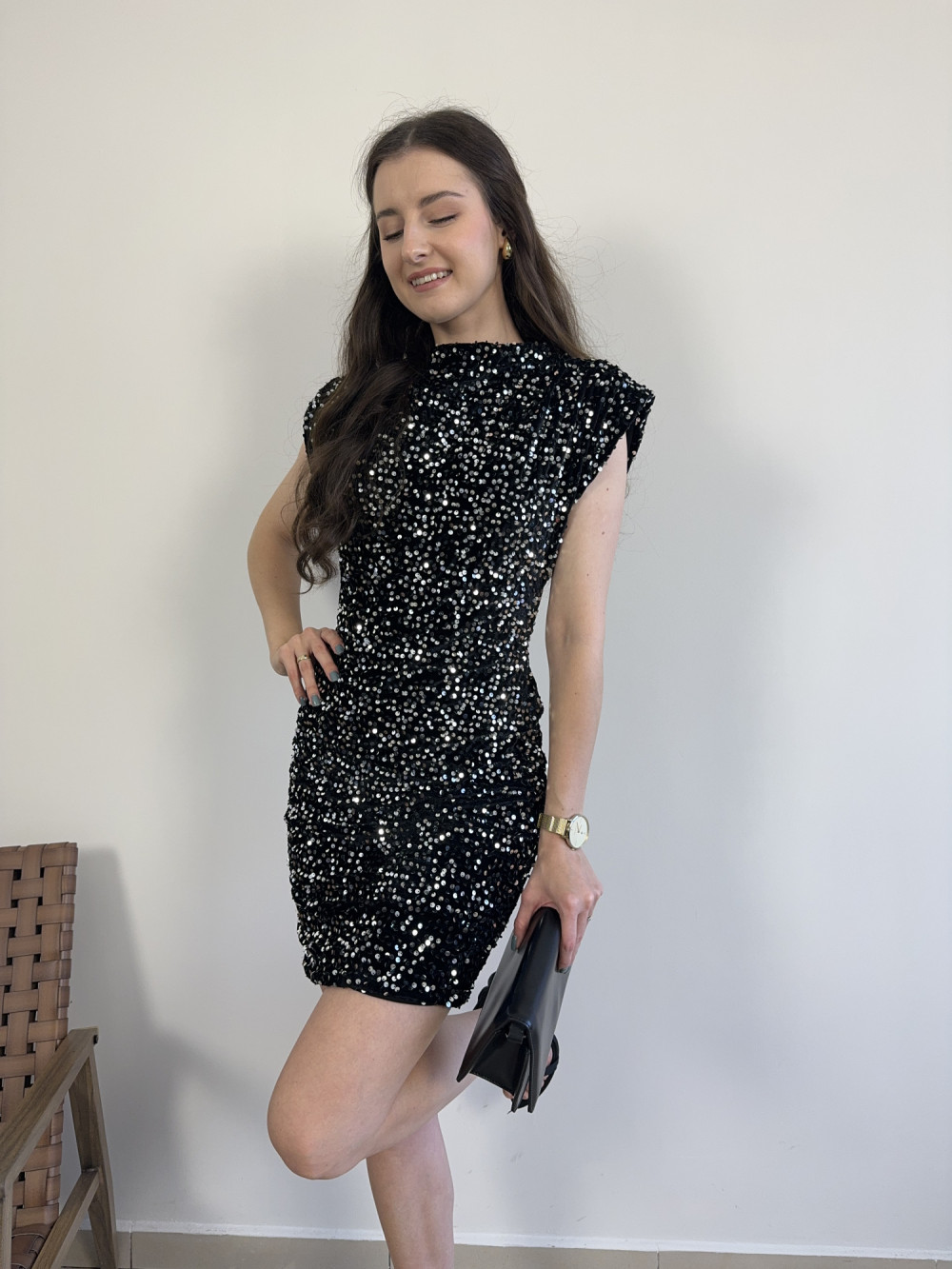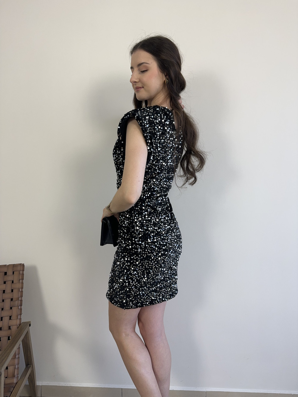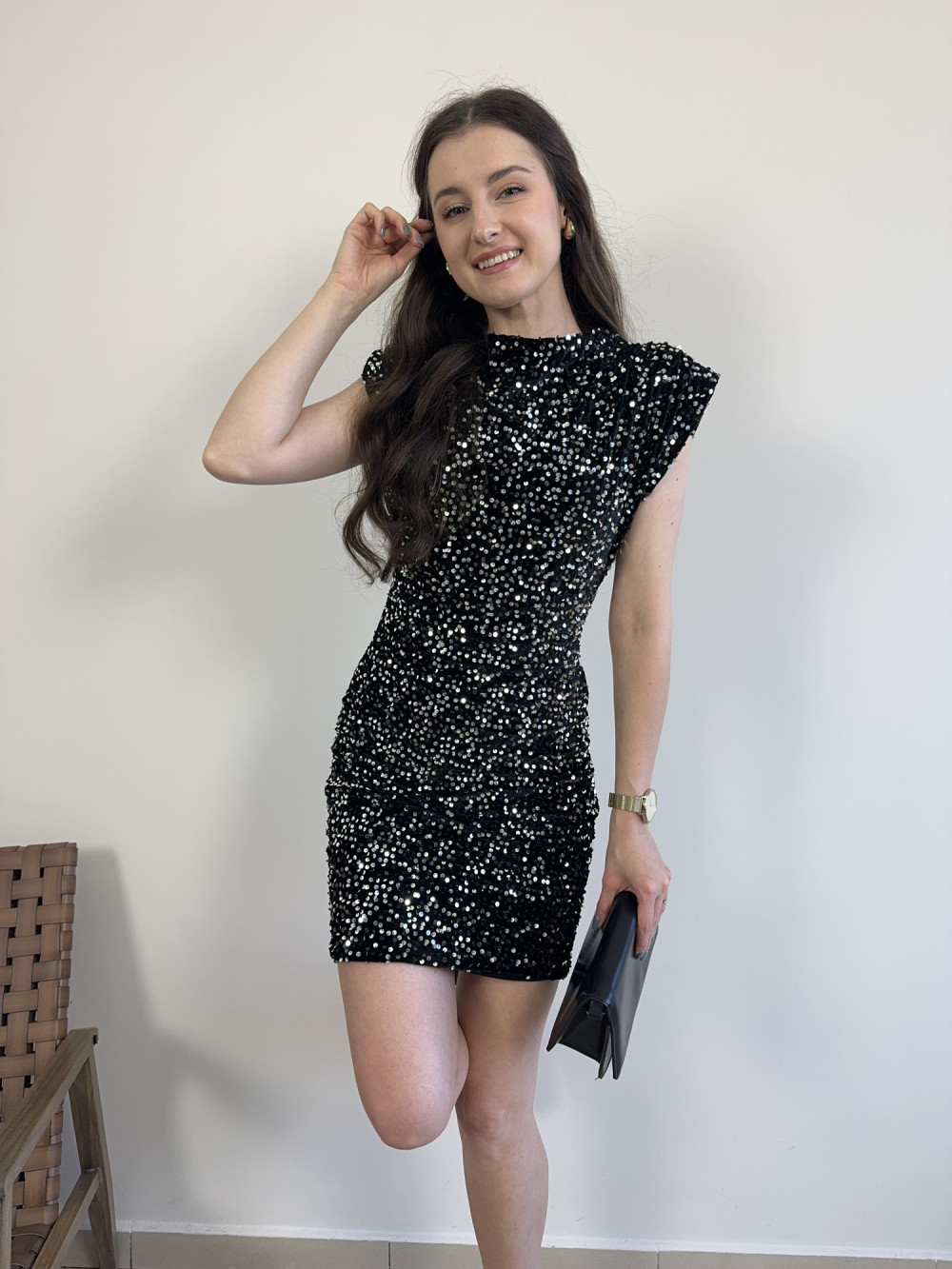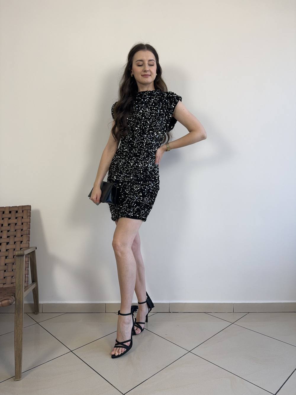 Elastyczna sukienka zdobiona cekinami na miękkim, welurowym tle — materiał lekko pracuje, dzięki czemu dopasowuje się do sylwetki, a cekiny układają się bez efektu sztywności. Wewnątrz podszewka zapewnia komfort i brak prześwitu, a ramiona mają delikatne poduszki modelujące linię. Fason przylegający, długość mini — prosty, efektowny krój wieczorowy.