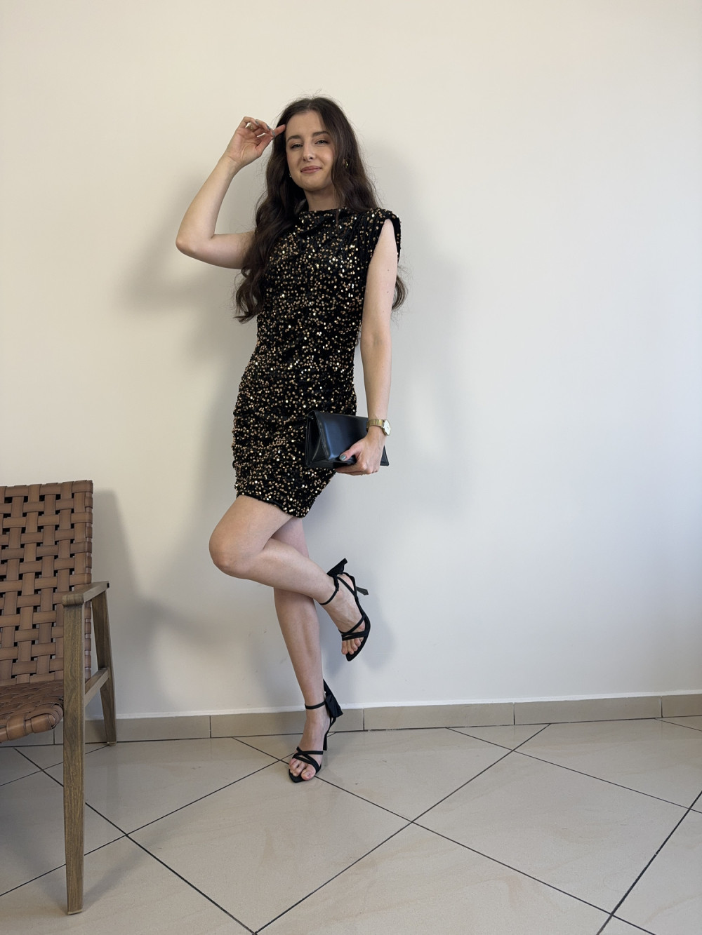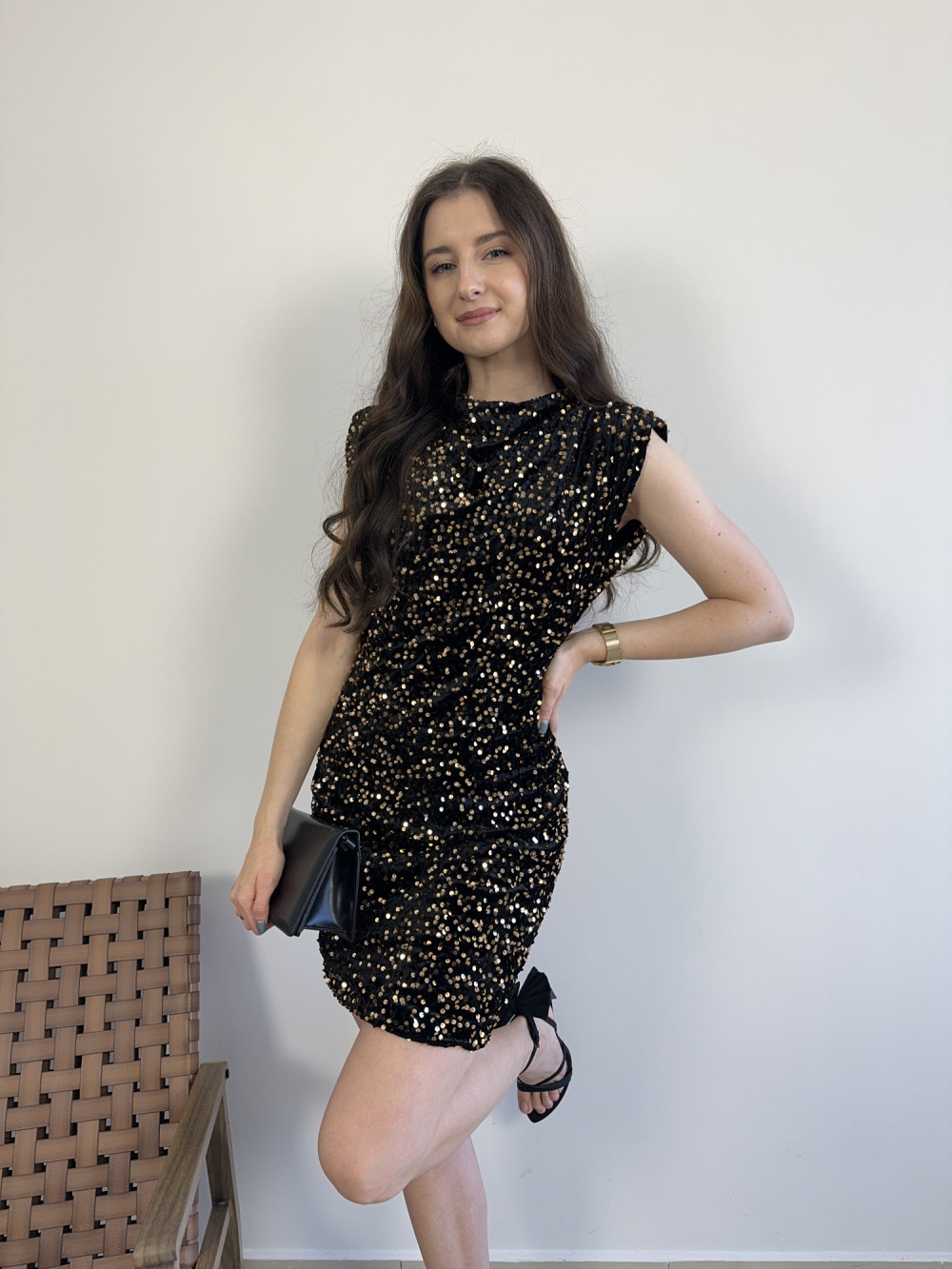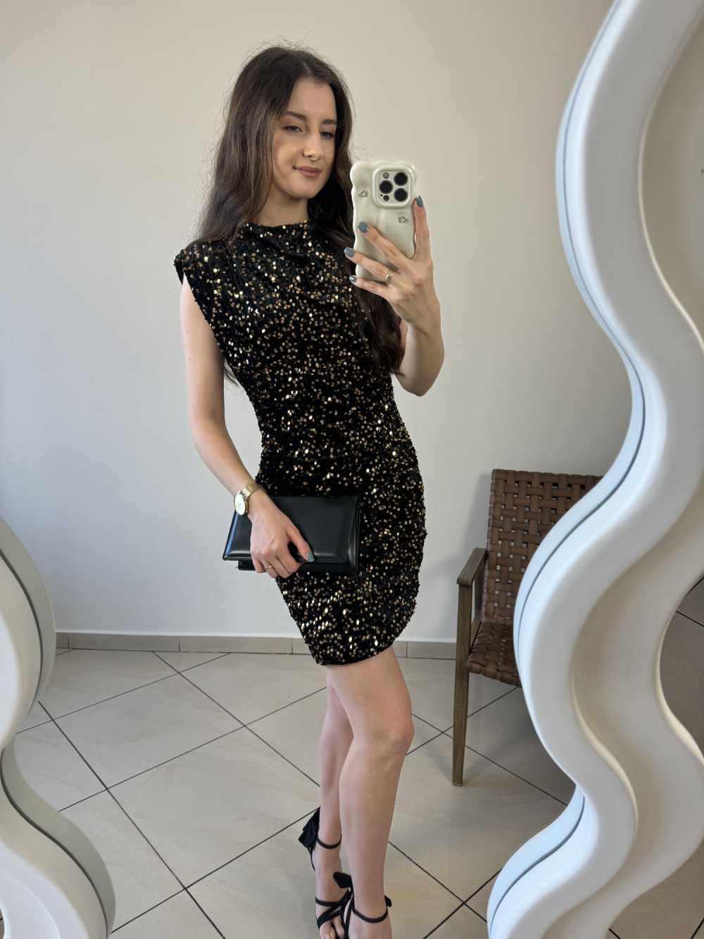 Elastyczna sukienka zdobiona cekinami na miękkim, welurowym tle — materiał lekko pracuje, dzięki czemu dopasowuje się do sylwetki, a cekiny układają się bez efektu sztywności. Wewnątrz podszewka zapewnia komfort i brak prześwitu, a ramiona mają delikatne poduszki modelujące linię. Fason przylegający, długość mini — prosty, efektowny krój wieczorowy.