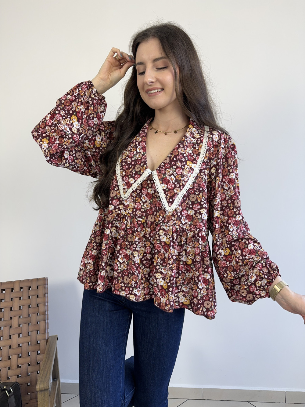 Romantyczna bluzka z szerokim, ozdobnym kołnierzem uszyta jest z przewiewnej wiskozy, która delikatnie układa się na sylwetce. Kołnierz wykończony subtelną koronką nadaje jej dziewczęcego i unikalnego uroku. Bufiaste rękawy zakończone gumką dodają objętości i lekkości całej formie. Fason lekko rozszerzany ku dołowi sprawia, że bluzka jest wygodna, a jednocześnie niezwykle efektowna. To idealny wybór dla osób ceniących subtelne, ale wyraziste detale.