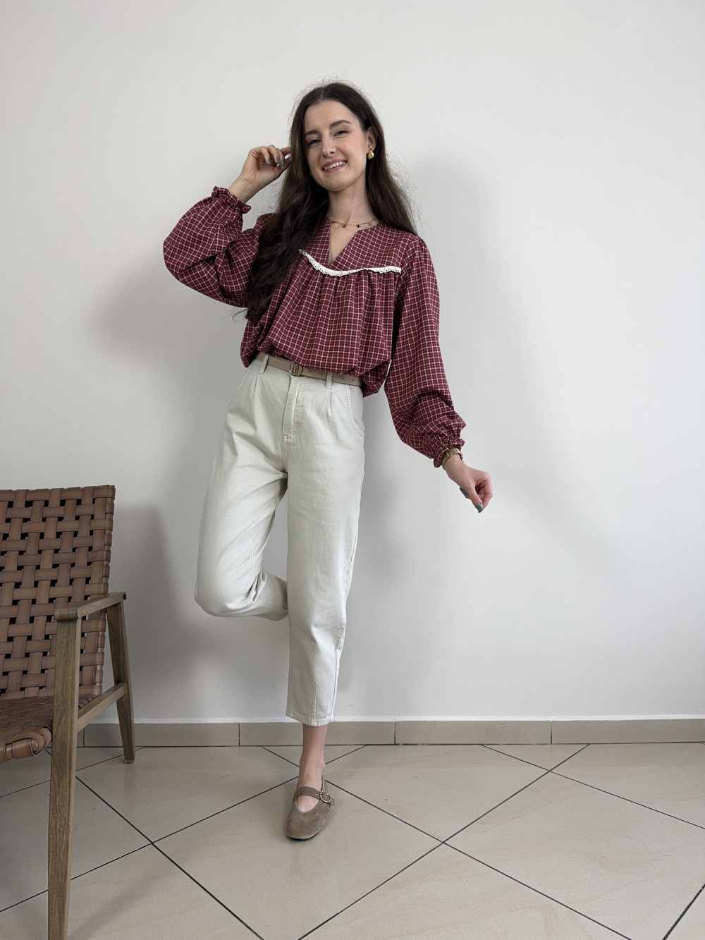 Bluzka o swobodnym kroju z delikatnym marszczeniem i ozdobną lamówką przy dekolcie. Wykonana w większości z wiskozy — przyjemna, oddychająca i komfortowa w noszeniu przez cały dzień. Ma lekko bufiaste rękawy zakończone mankietem, co dodaje jej dziewczęcego charakteru.