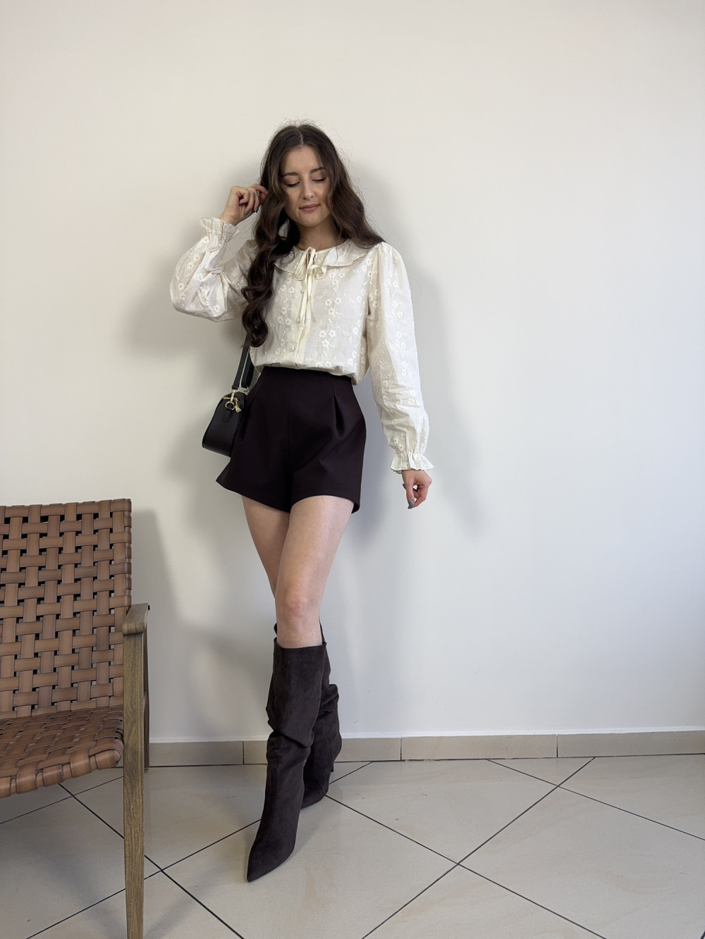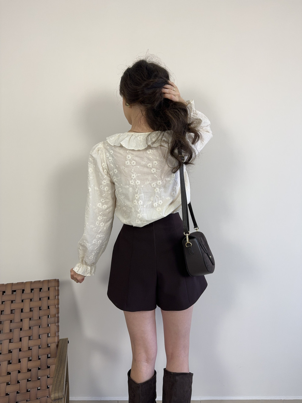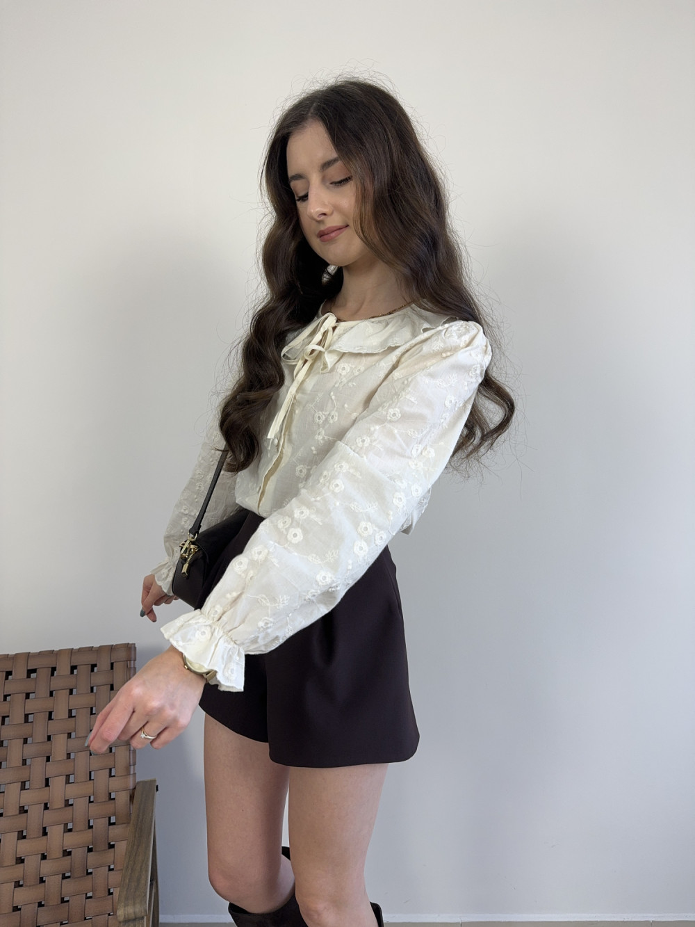 Klasyczna koszula z ozdobnym, zaokrąglonym kołnierzykiem, uszyta w 100% z bawełny — delikatny kwiatowy żakard tworzy subtelny wzór w tkaninie. Zapinana na drobne guziki, z mankietami wykończonymi falbanką — drobne detale podkreślają rzemieślnicze wykończenie. Miękka, przewiewna tkanina świetnie sprawdzi się zarówno pod marynarkę, jak i solo.