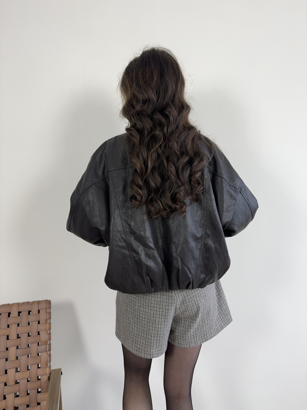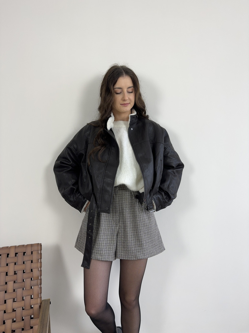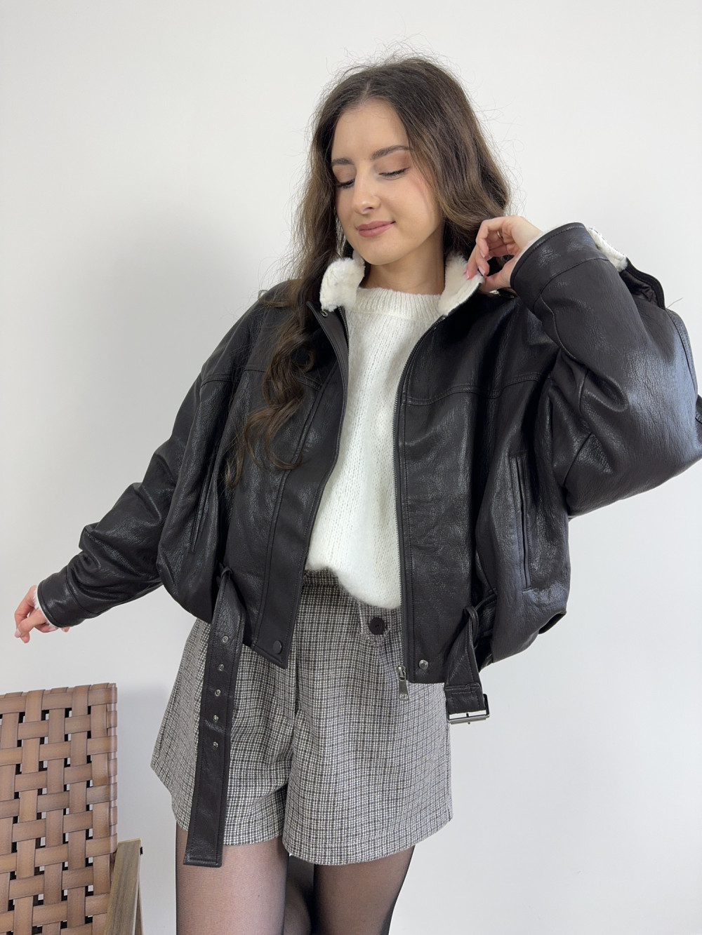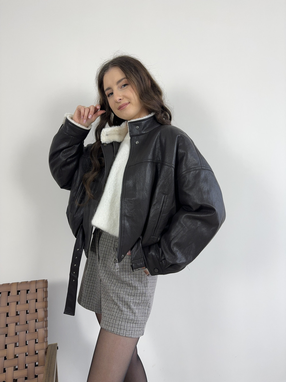 Kurtka z miękkiej ekoskóry o lekko oversize’owym kroju, wykończona wewnątrz podszyciem z „misiem”, które delikatnie wystaje przy stójce, tworząc efekt przytulnego ocieplenia. Skóra jest wyjątkowo miękka i plastyczna, dzięki czemu nie tworzy sztywnych załamań, tylko naturalnie układa się przy ciele. Wszyty pasek w dolnej części nie jest wyjmowany — pozwala subtelnie zebrać kurtkę w talii i dodać jej kształtu. Rękawy mają lekkie bufki, które nadają modowy charakter i lekki oversize. Idealna na chłodniejsze dni dzięki miękkiej, ciepłej podszewce.