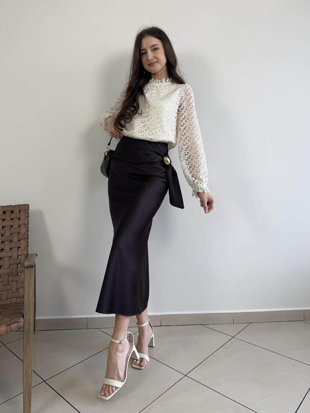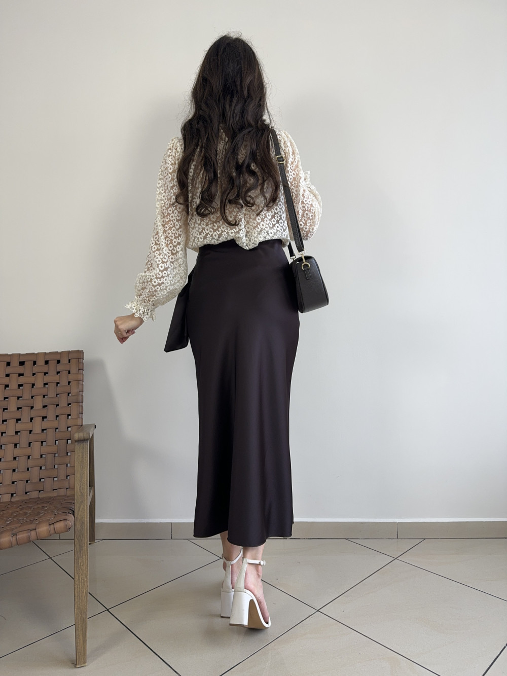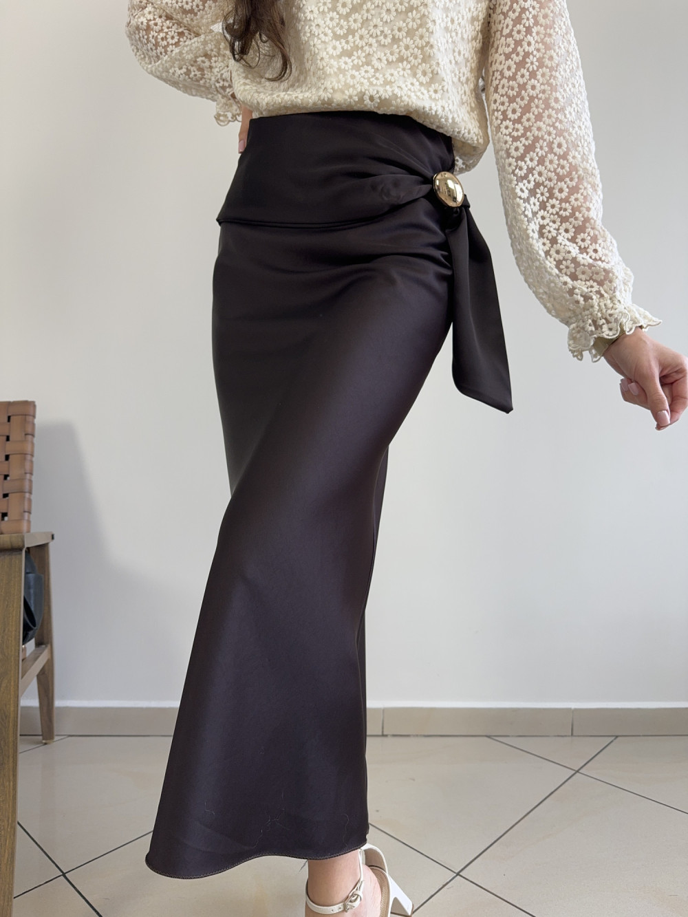 Spódnica midi satynowa ze złotym elementem czekoladowa SATINE