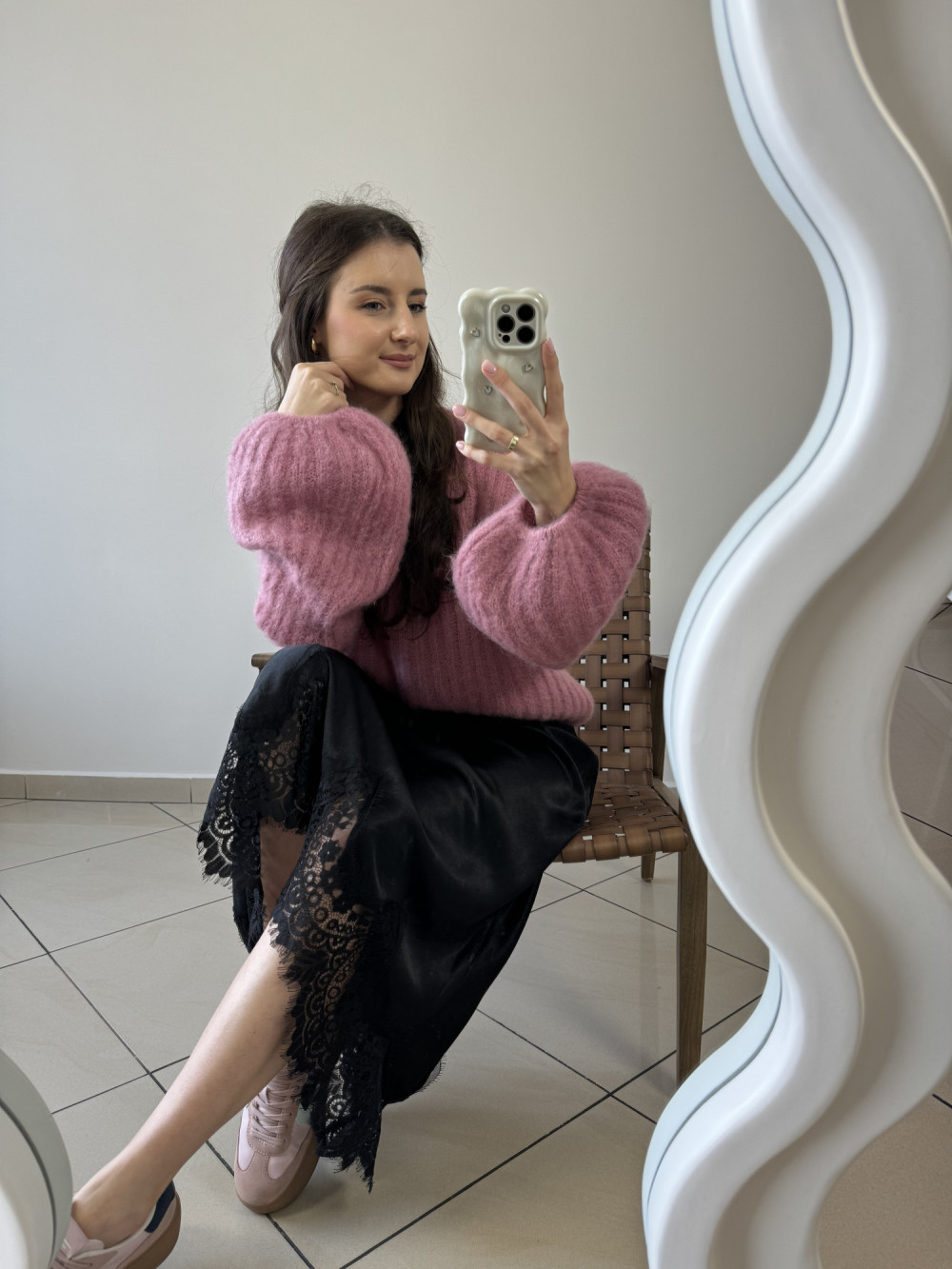 Miękki, luksusowy sweter o luźnym kroju i pięknie bufiastych rękawach. Wykonany z mieszanki włókien premium — 60% moheru i 15% wełny — otula ciepłem w zimne dni. Materiał jest wyjątkowo lekki, a jednocześnie mięsisty, dzięki czemu sweter wygląda elegancko i stylowo. Idealny do jeansów lub spódnicy, dodaje klasy każdej stylizacji. To model, który zachwyca prostotą i jakością wykończenia.