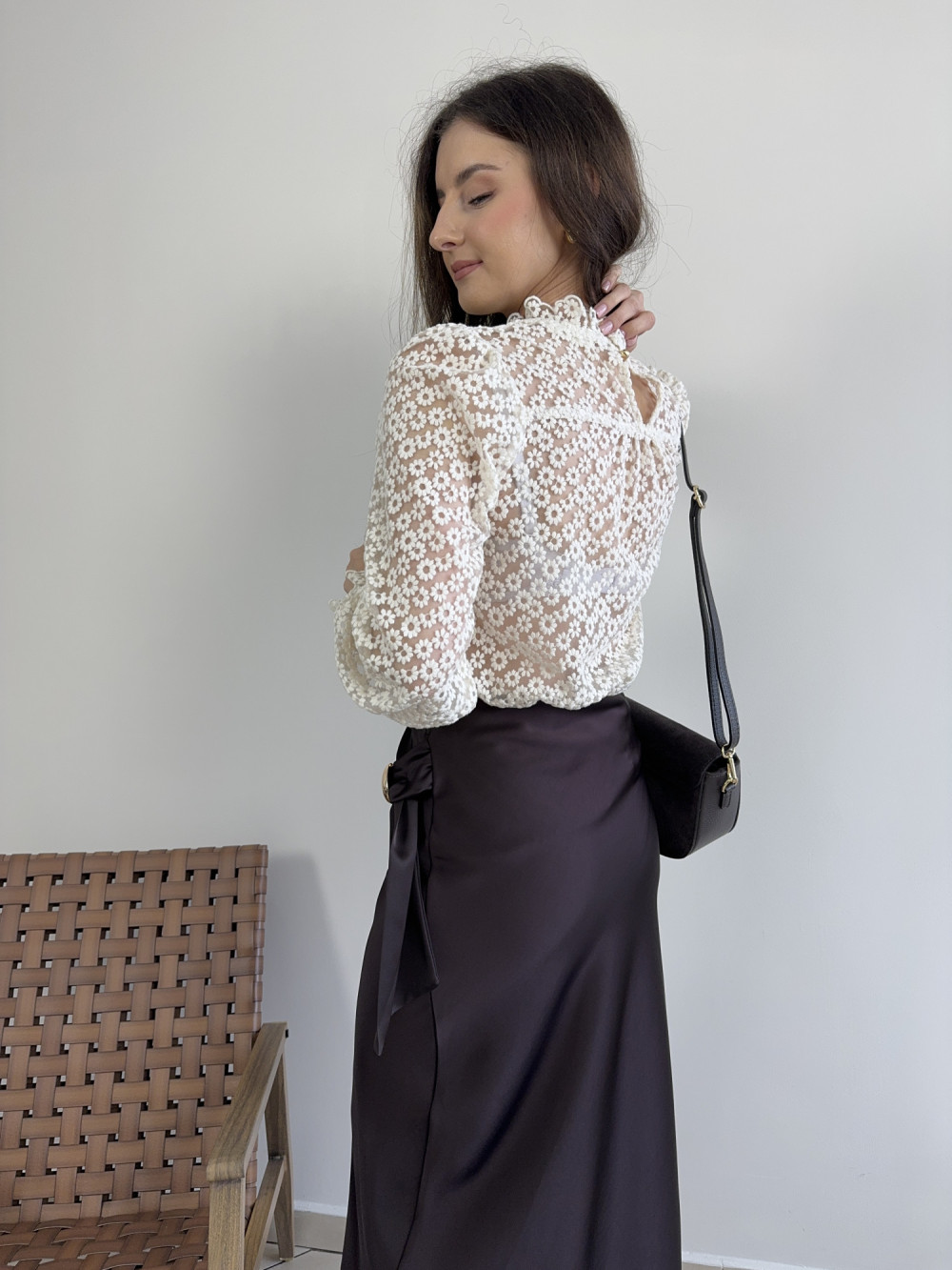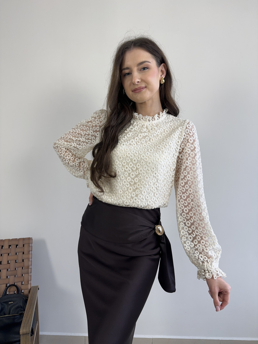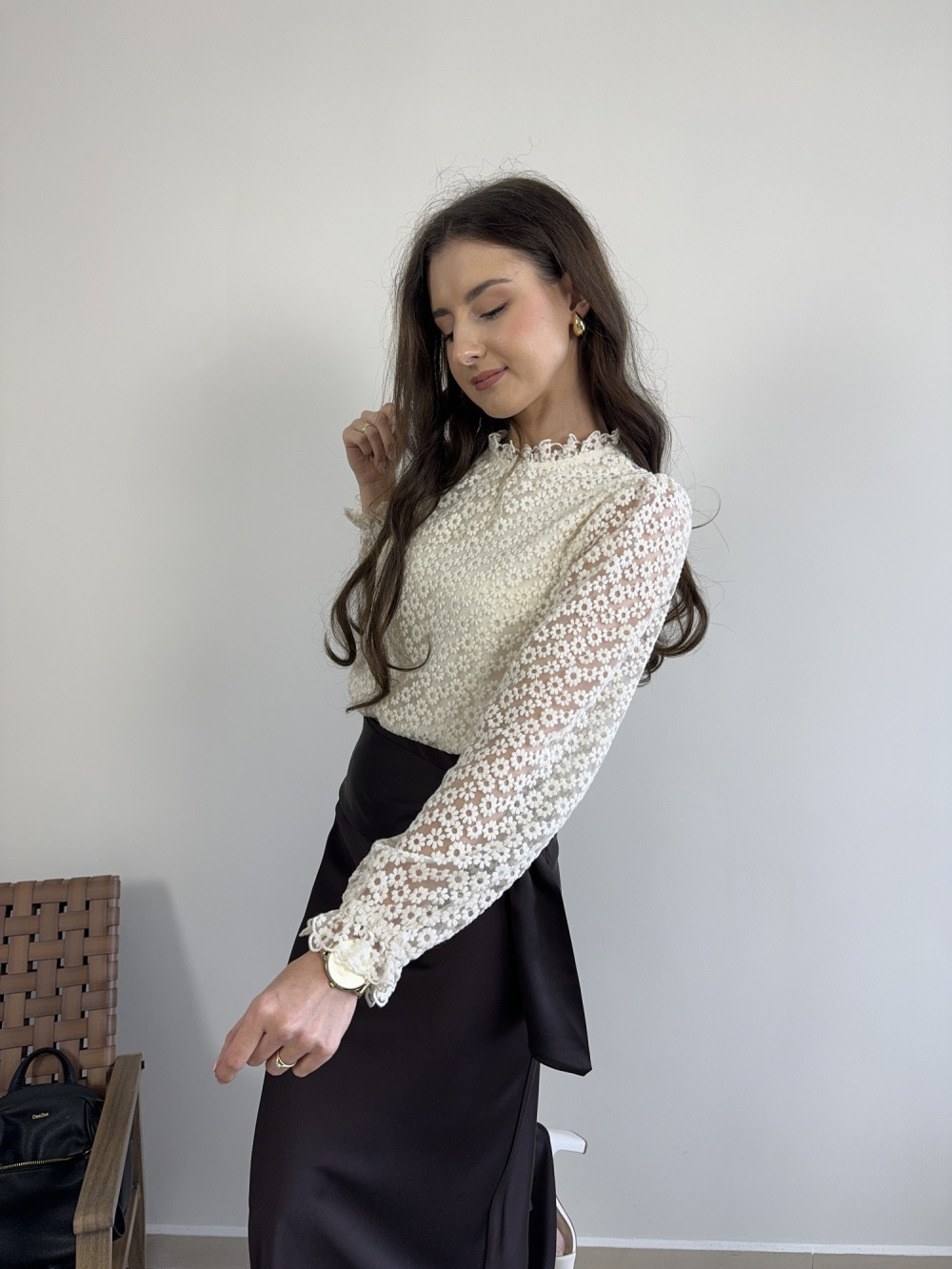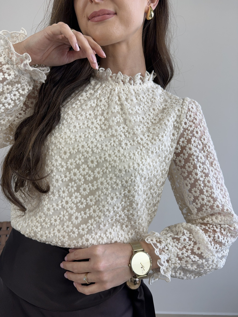 Romantyczna bluzka w odcieniu kremowego beżu, w całości pokryta misternym wzorem drobnych kwiatków. Przód został podszyty miękką podszewką, dzięki czemu bluzka nie prześwituje, natomiast tył pozostawiono bez podszewki, aby zachować lekkość i subtelność koronki. Zapinana z tyłu na jeden, mały guziczek. Delikatne falbanki przy szyi i mankietach dodają jej elegancji i kobiecego uroku.