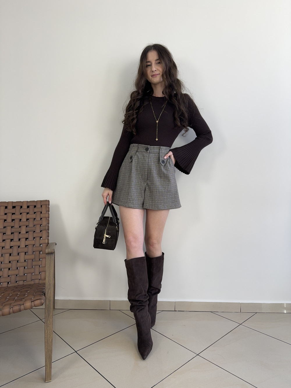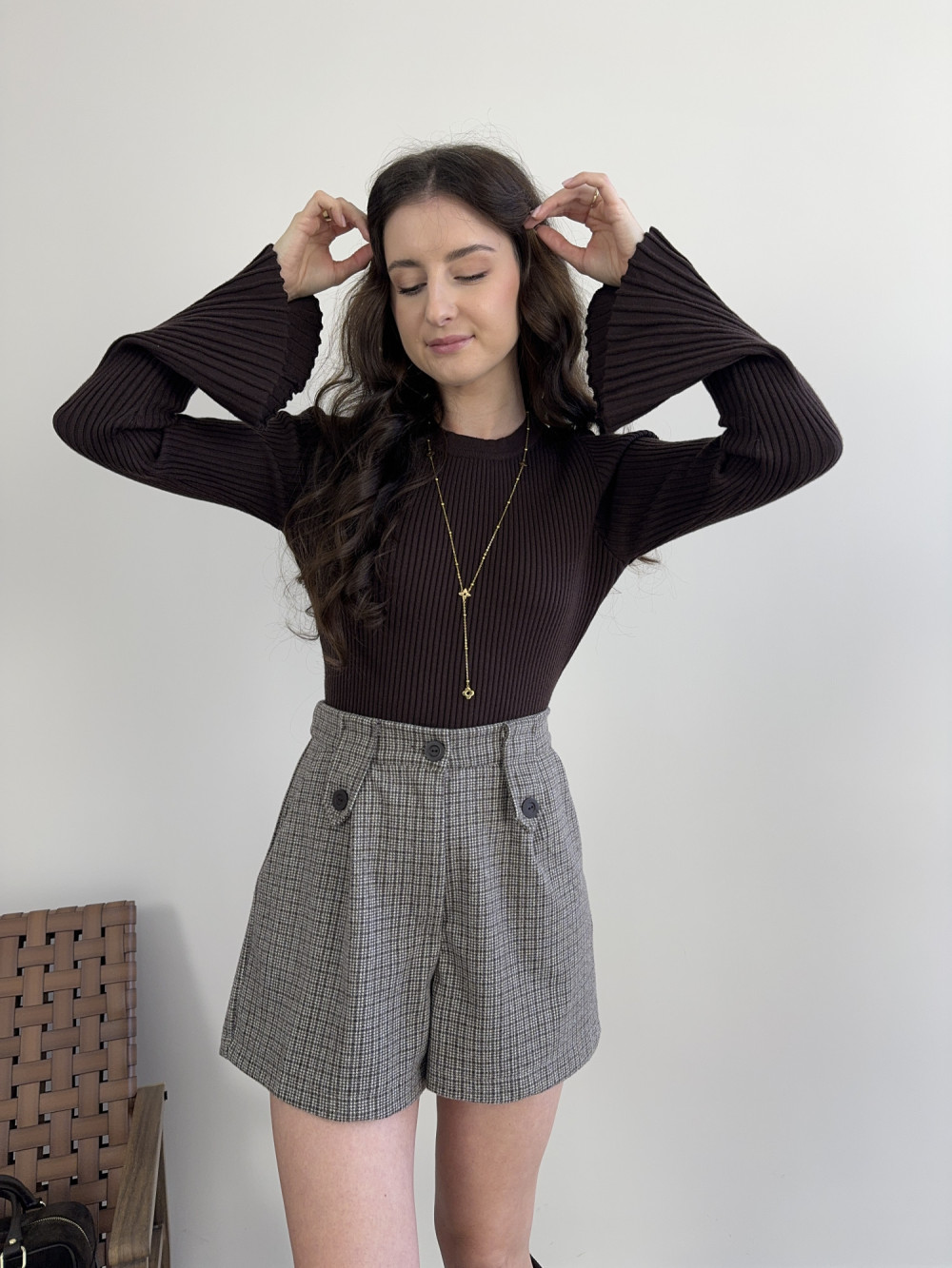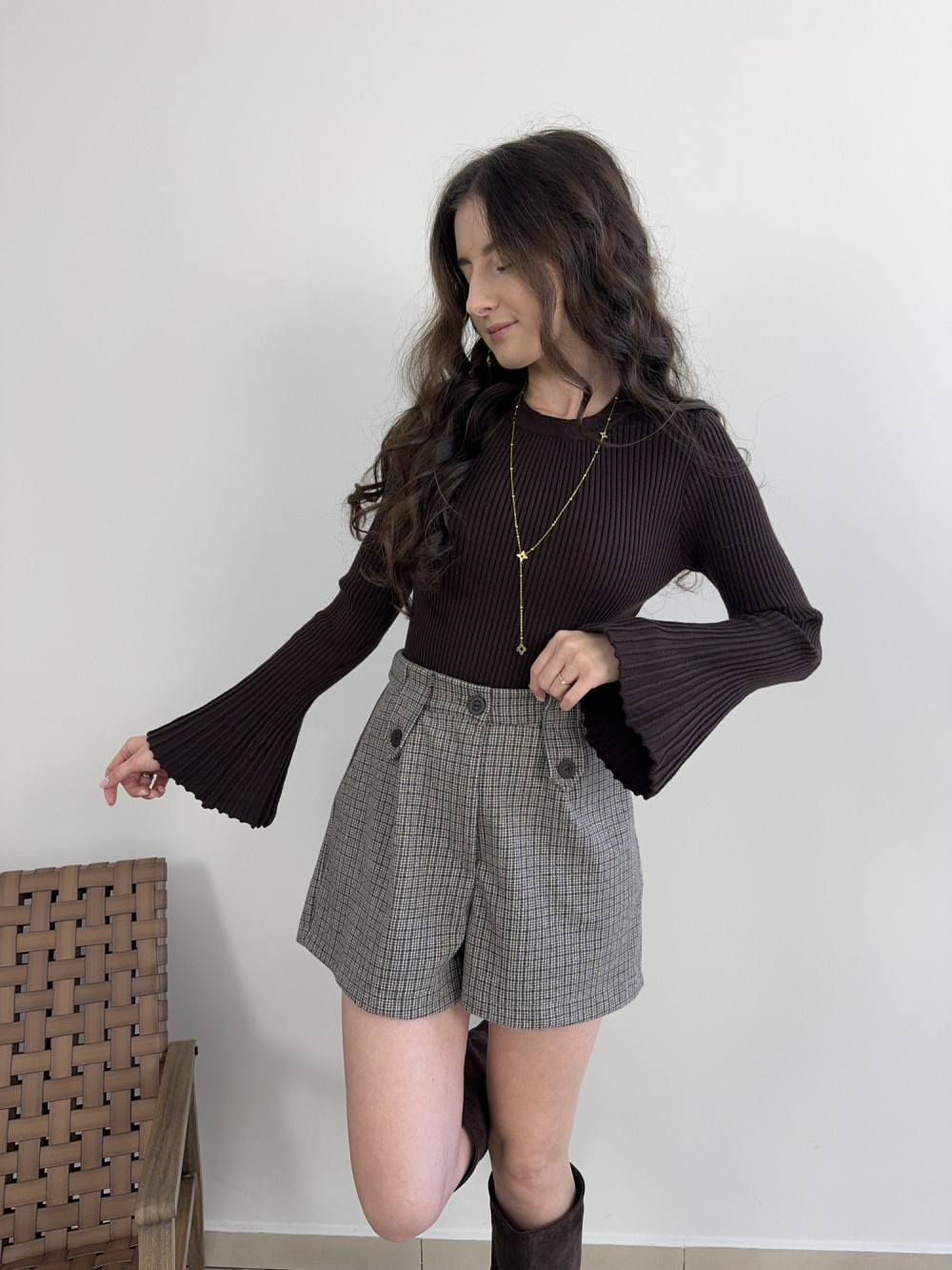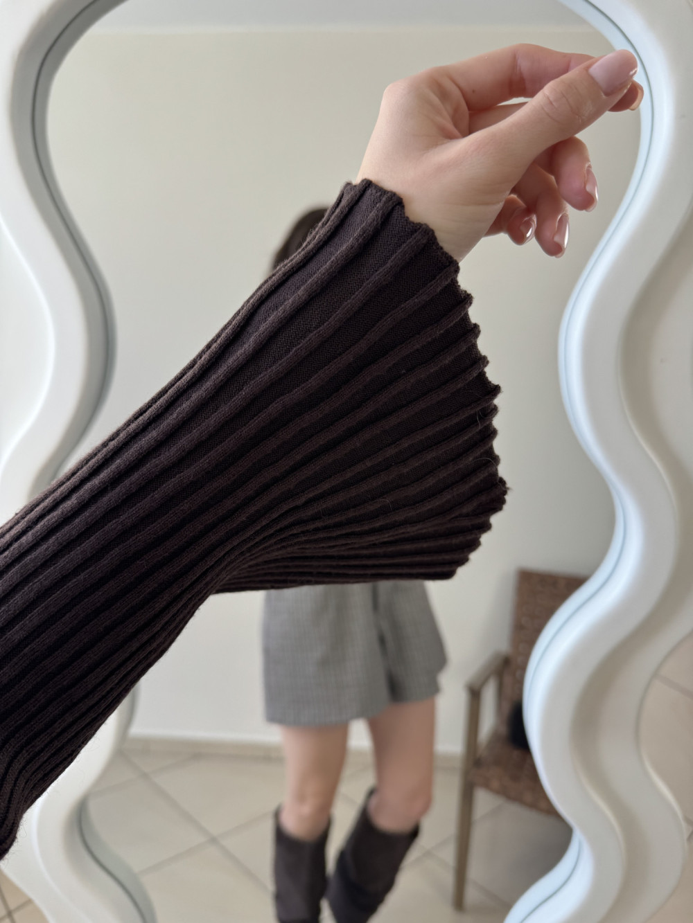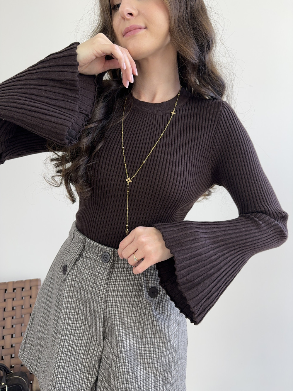 Bluzka z rozszerzanymi rękawami prążek czekoladowa AVENUE