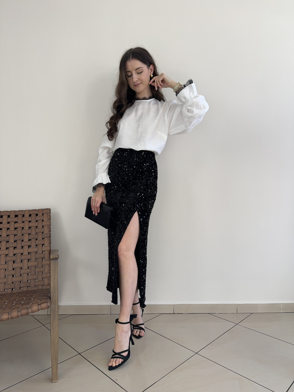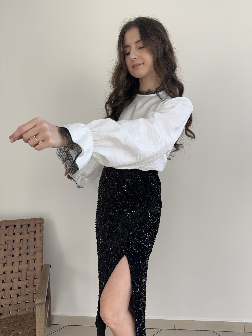 Bluzka została wykonana z delikatnego, lekko gniecionego, wiskozowego, który dodaje jej subtelnej struktury i wyjątkowego charakteru. Wykończenie przy szyi i mankietach wykonano z eleganckiej koronki, tworząc efektowne, misternie zdobione detale. Luźniejszy krój zapewnia swobodę ruchów, jednocześnie pięknie układając się na ciele. Tkanina jest lekka i komfortowa, sprawdzając się świetnie w stylizacjach dziennych i wieczorowych. To ponadczasowy model, który dodaje klasy każdemu lookowi.
