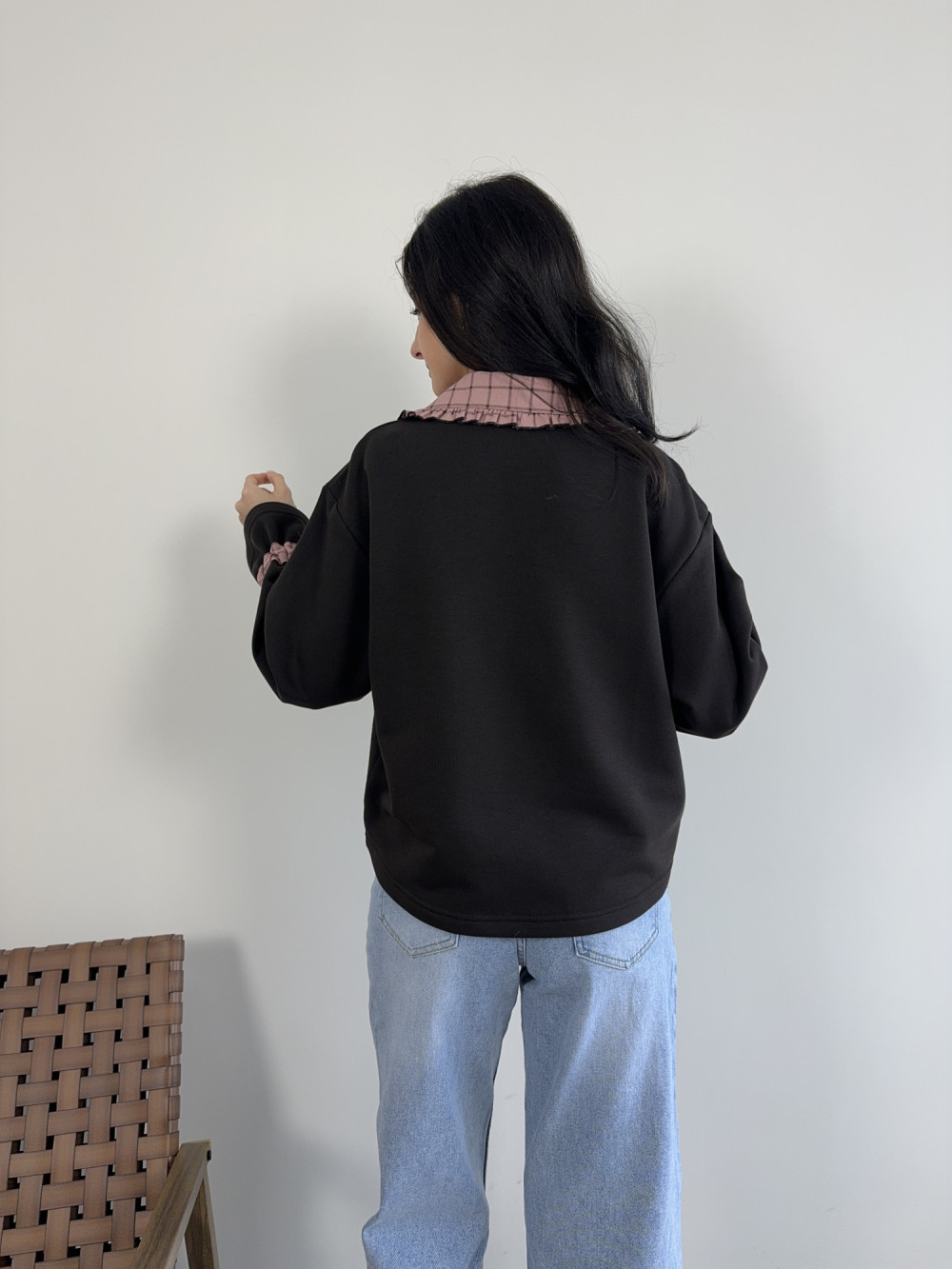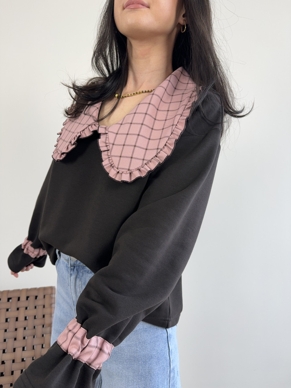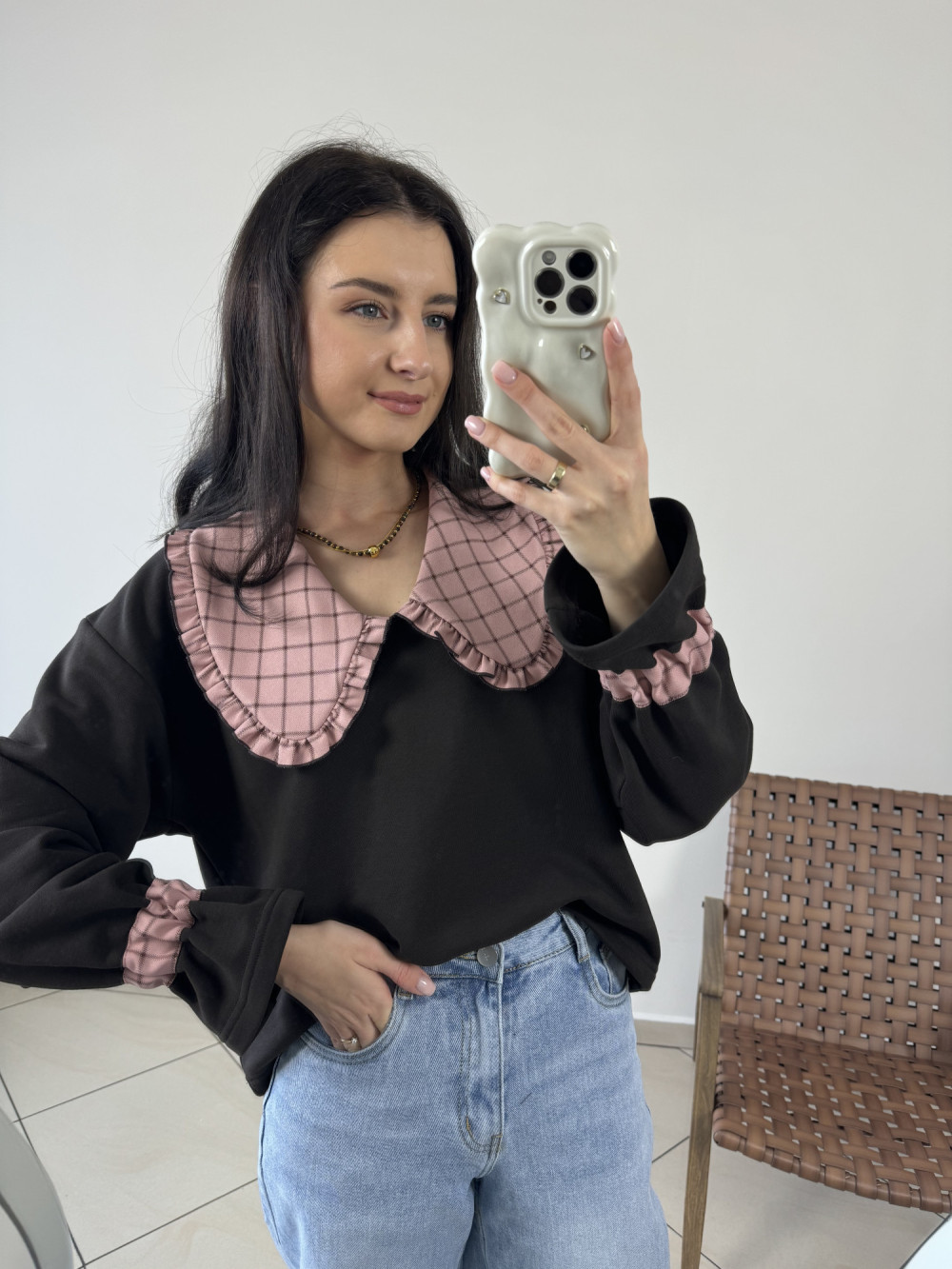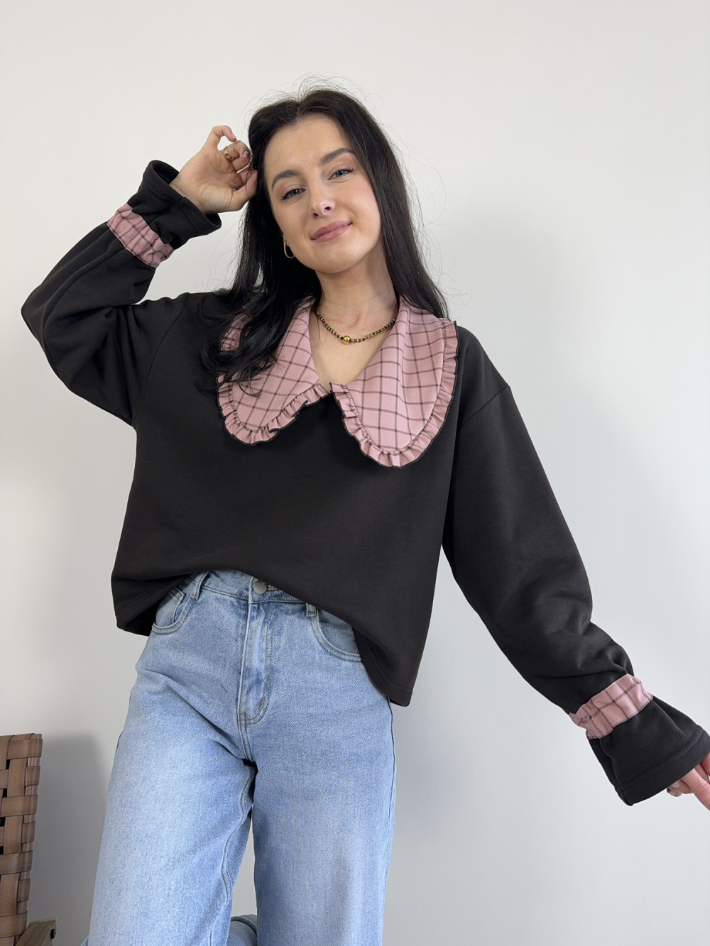 Bluza w pięknym, czekoladowym odcieniu, wykończona szerokim, dekoracyjnym kołnierzem w kratkę. Uszyta w 90% z bawełny, miękka i komfortowa, ale nieocieplana — idealna na cały rok. Rękaw dodatkowo zdobi pas materiału w tym samym wzorze co kołnierz. Połączenie swobody i stylu!