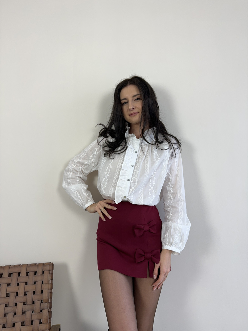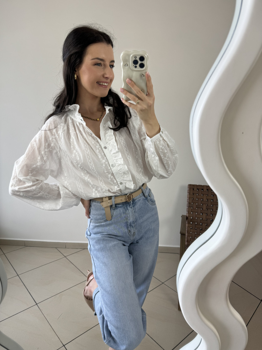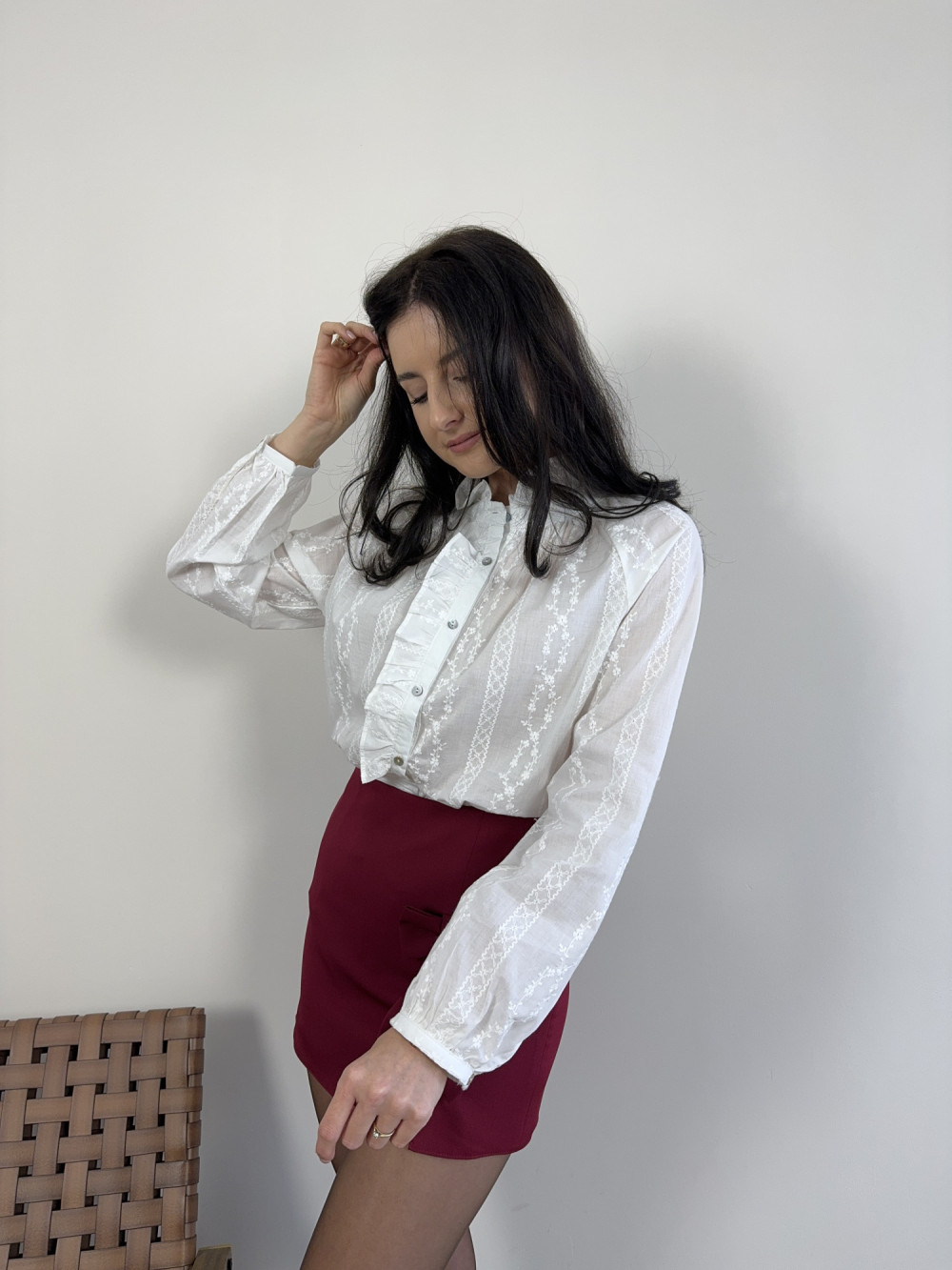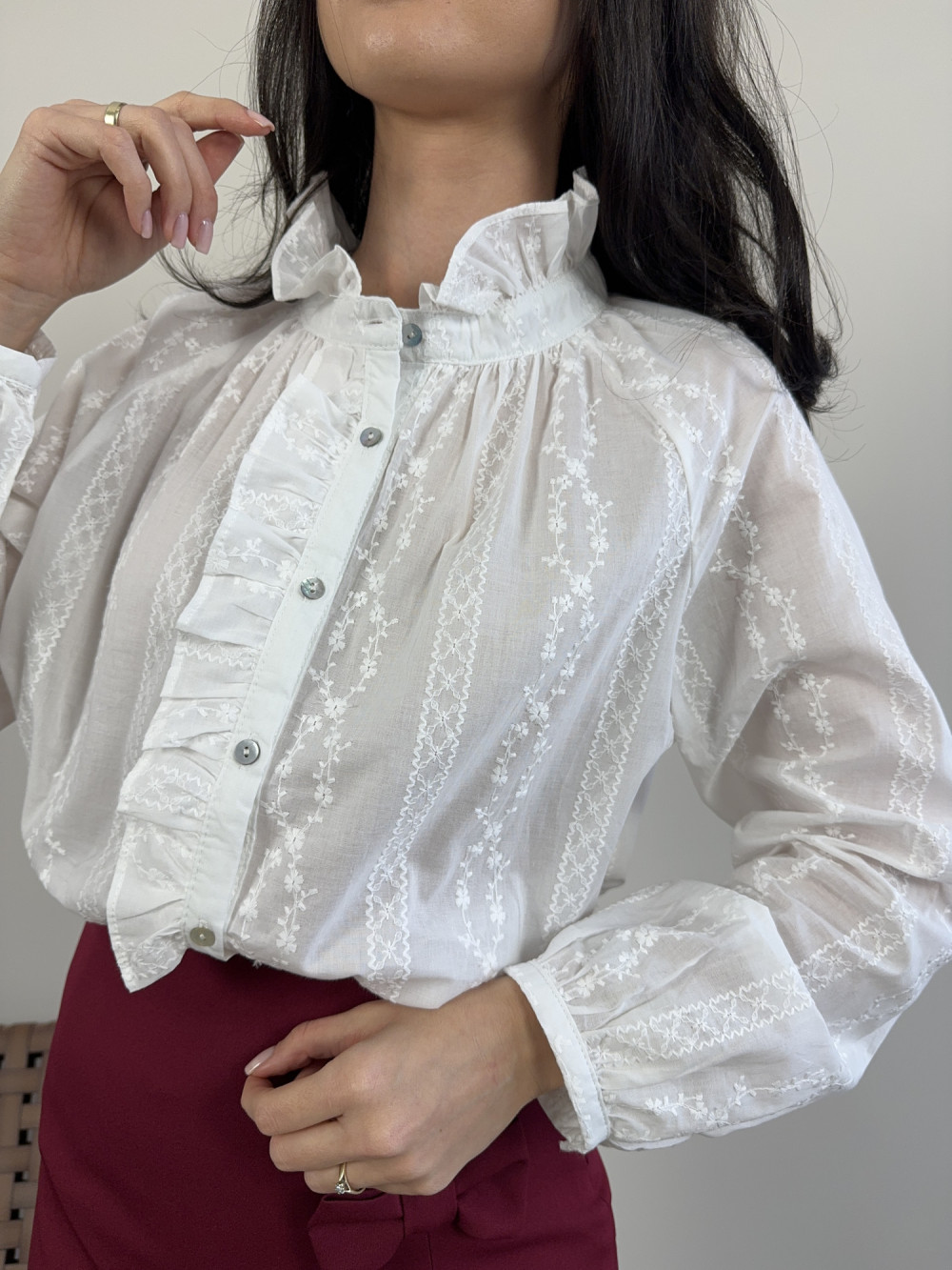 Delikatna koszula uszyta z bawełny, subtelnie prześwitująca, dzięki czemu wygląda niezwykle lekko i kobieco. Ma ozdobną stójkę i falbankę wzdłuż zapięcia, a na materiale widoczny jest drobny, elegancki wzór. Idealna do stylizacji zarówno eleganckich, jak i codziennych.