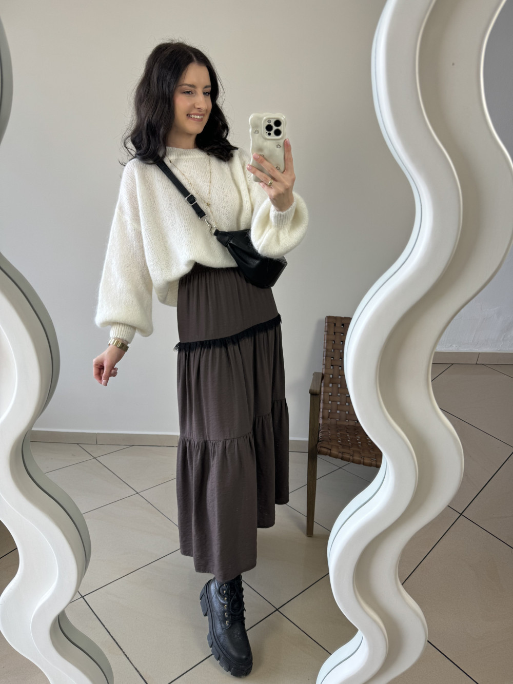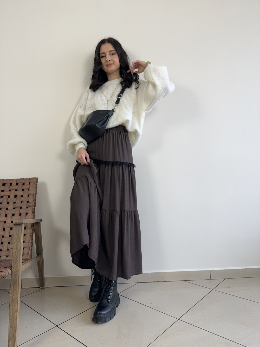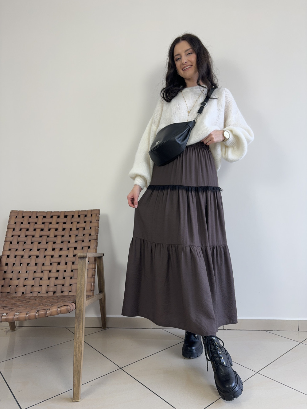 Czekoladowa spódnica maxi została wykonana w 100% z lekkiej, przyjemnej wiskozy, dzięki czemu pięknie układa się w ruchu. W talii posiada wygodną, elastyczną gumkę, która dopasowuje się do sylwetki i zapewnia pełen komfort przez cały dzień. Warstwowy krój nadaje jej zwiewności oraz kobiecego charakteru. To model idealny do swobodnych, ale stylowych stylizacji przez cały rok. Świetnie prezentuje się zarówno z botkami, jak i lekkimi sneakersami.