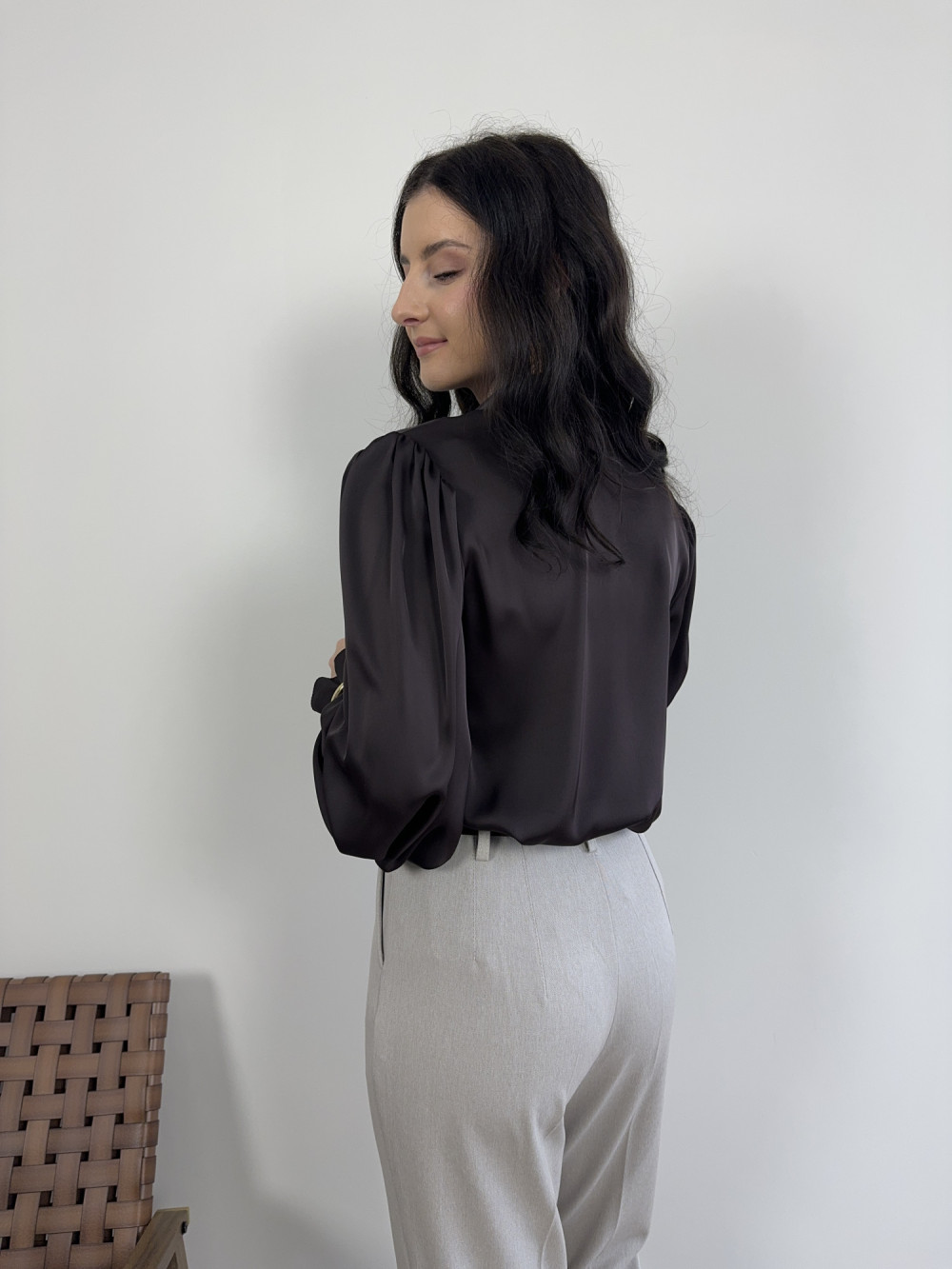 Koszula czekoladowa satynowa z bufiastymi rękawami IVORY