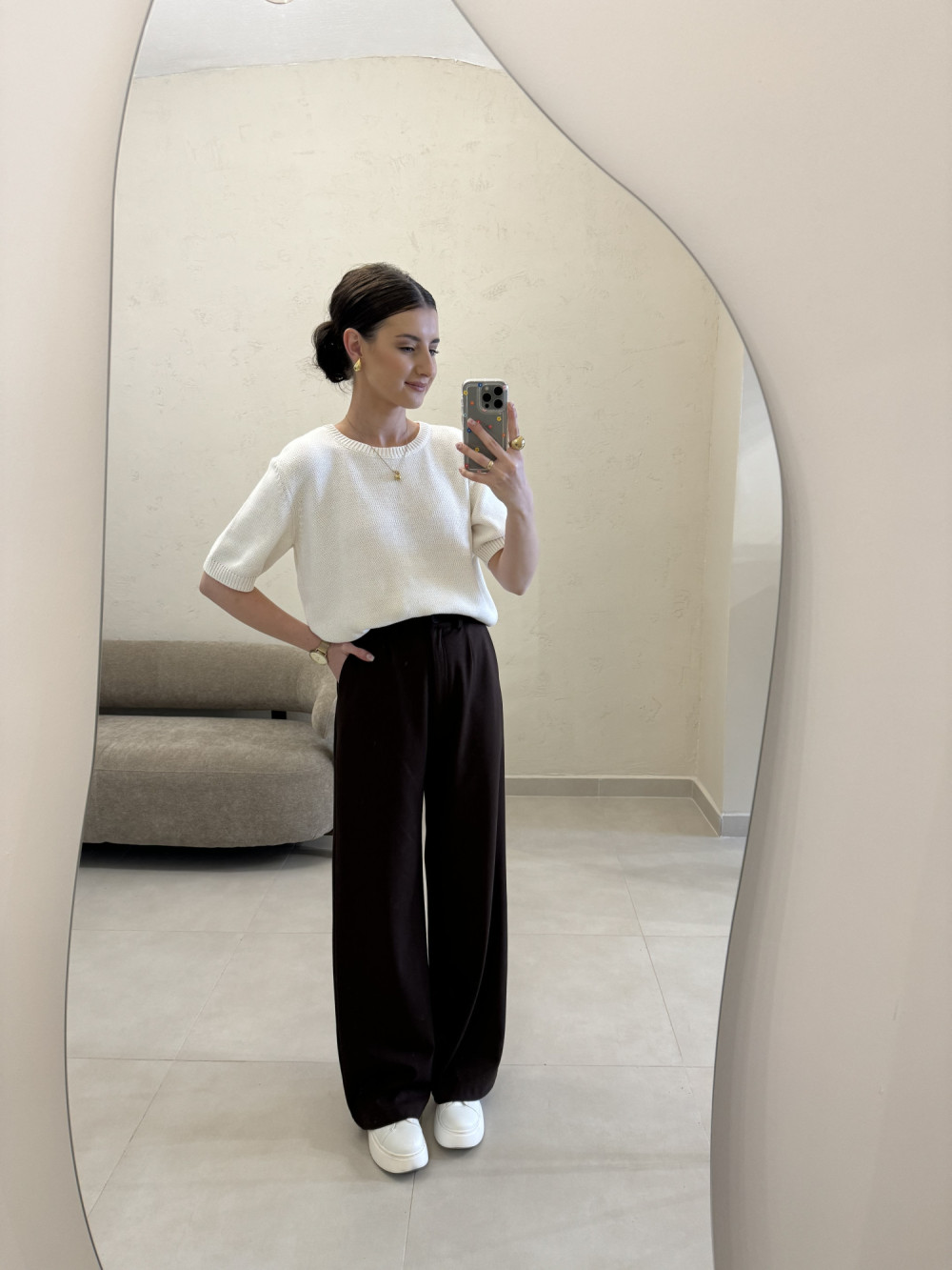 Spodnie Chiara mają wysoki stan, który pięknie podkreśla talię i wydłuża proporcje sylwetki. Uszyte w większości z bawełny, są jednocześnie wygodne, przewiewne i bardzo eleganckie. Szeroka nogawka dodaje im lekkości oraz nowoczesnego, modowego charakteru. Talia wykończona szerokim pasem i guzikiem sprawia, że spodnie prezentują się wyjątkowo szykownie. To idealny model do pracy, na wyjścia i do codziennych stylizacji — ponadczasowy, ale stylowy.