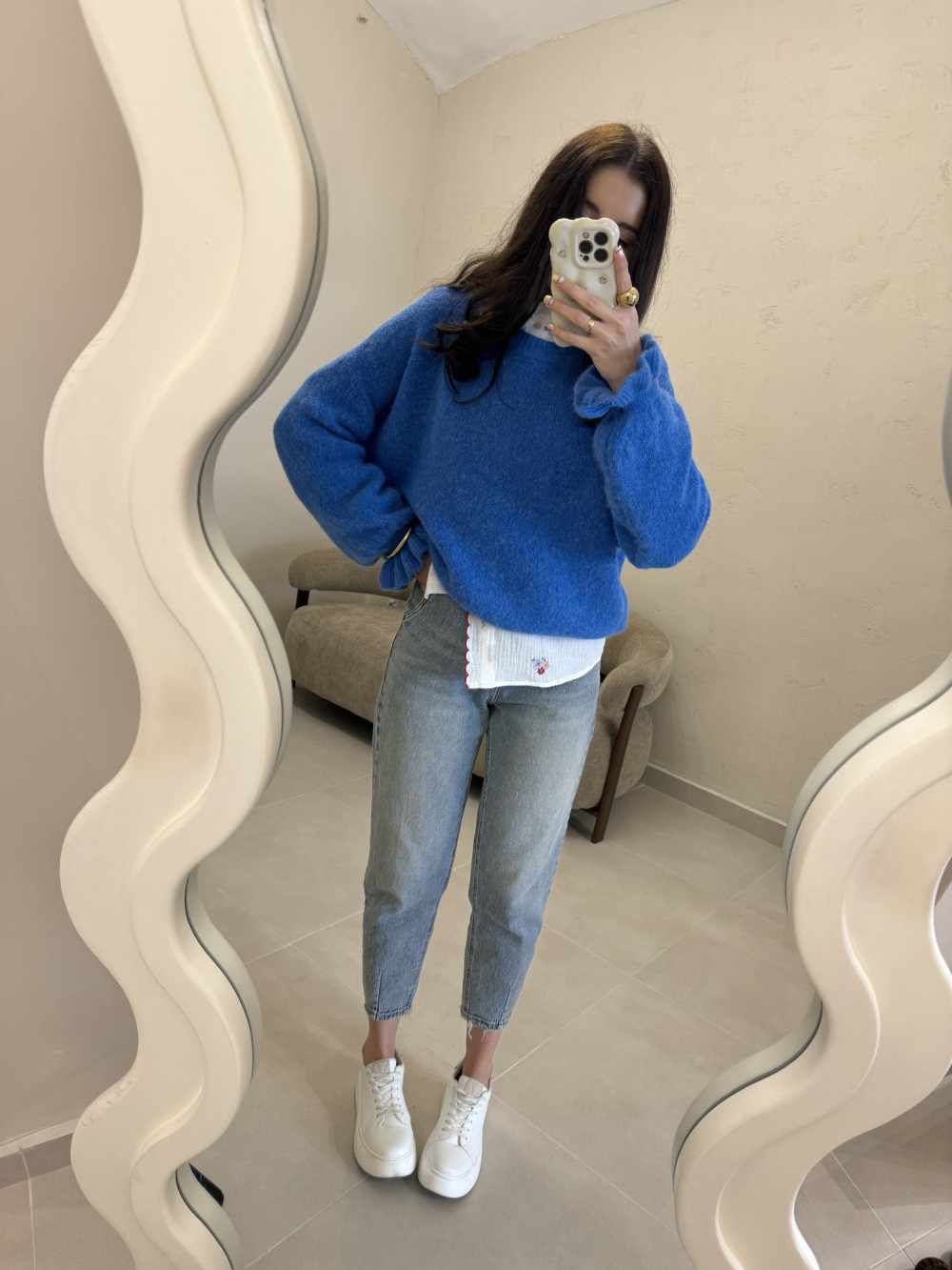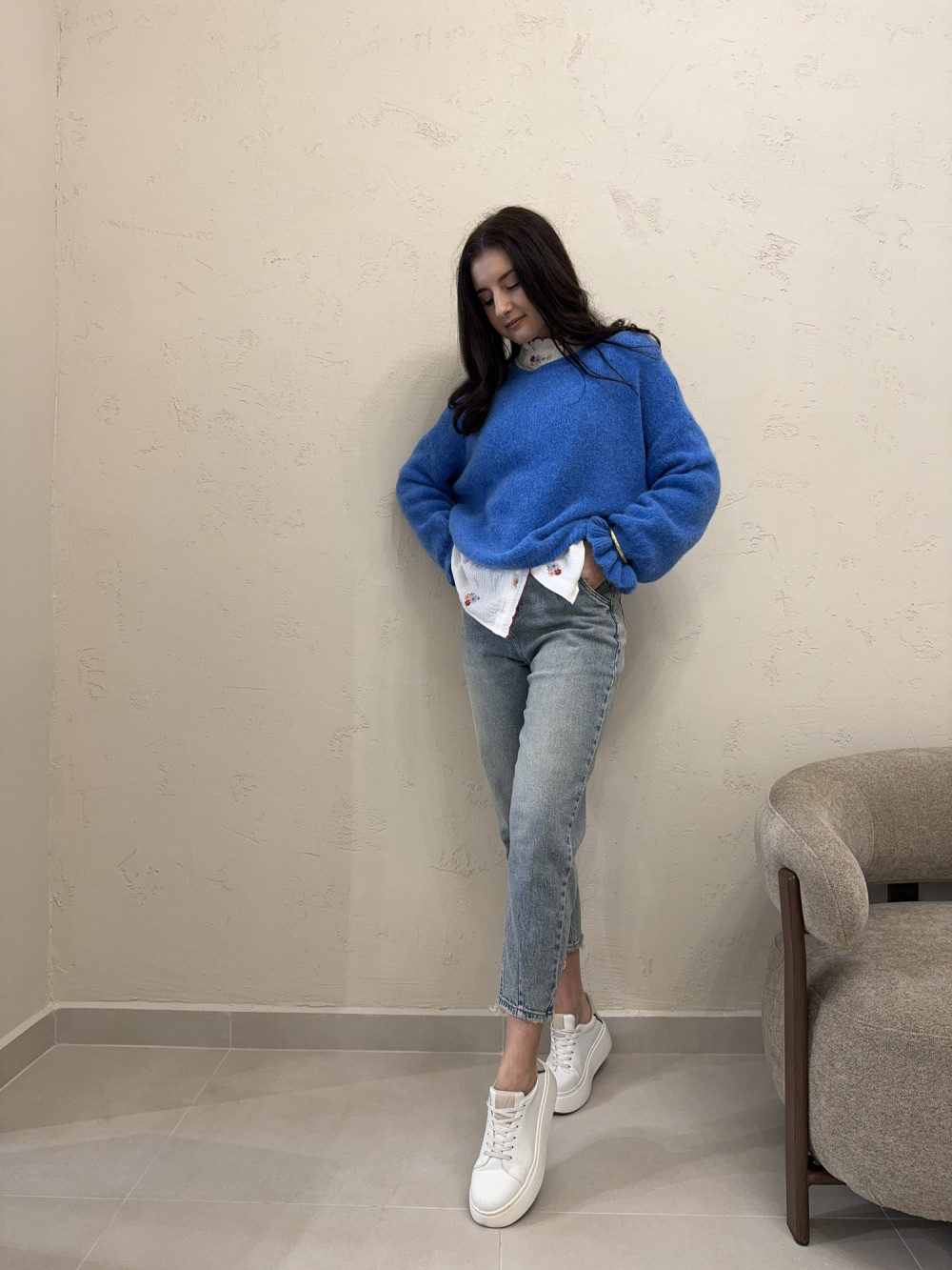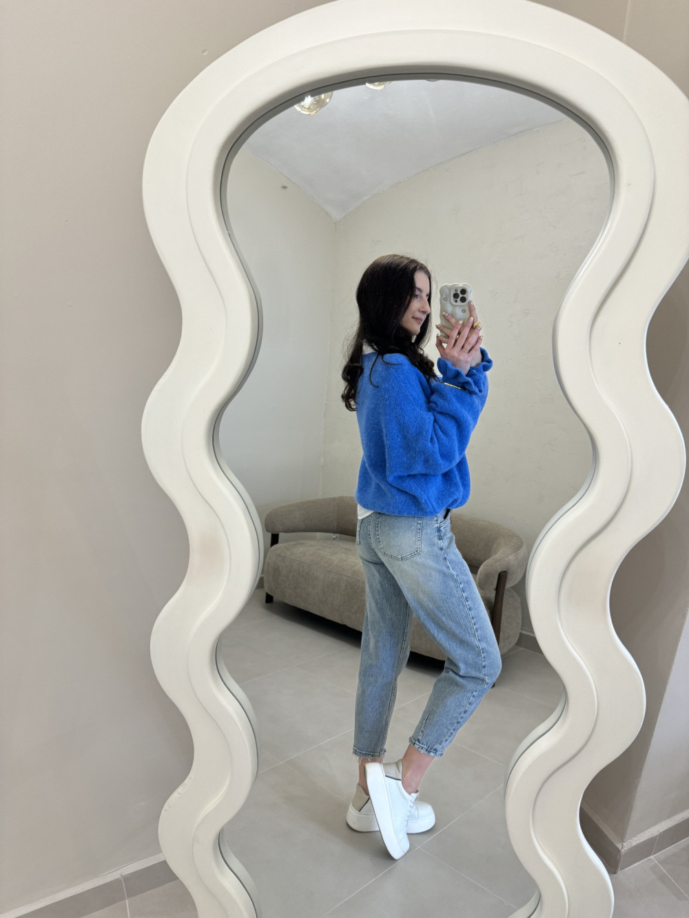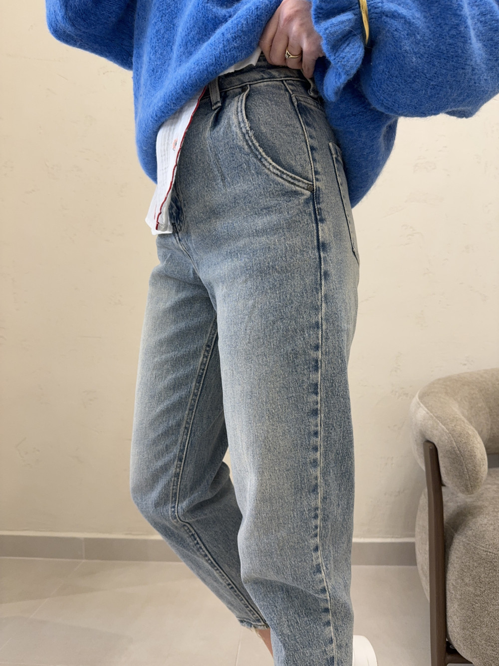 Jeansy uszyte z wyjątkowo miękkiego denimu, który pięknie dopasowuje się do sylwetki i zapewnia komfort przez cały dzień. Nogawki są delikatnie szersze u góry, ale subtelnie zwężają się przy łydkach, co wysmukla nogi. Materiał nie jest sztywny ani ciężki, dzięki czemu spodnie świetnie układają się w ruchu. To model, który łączy modny krój z wygodą noszenia. Idealne do codziennych stylizacji, ale także do bardziej dopracowanych looków.