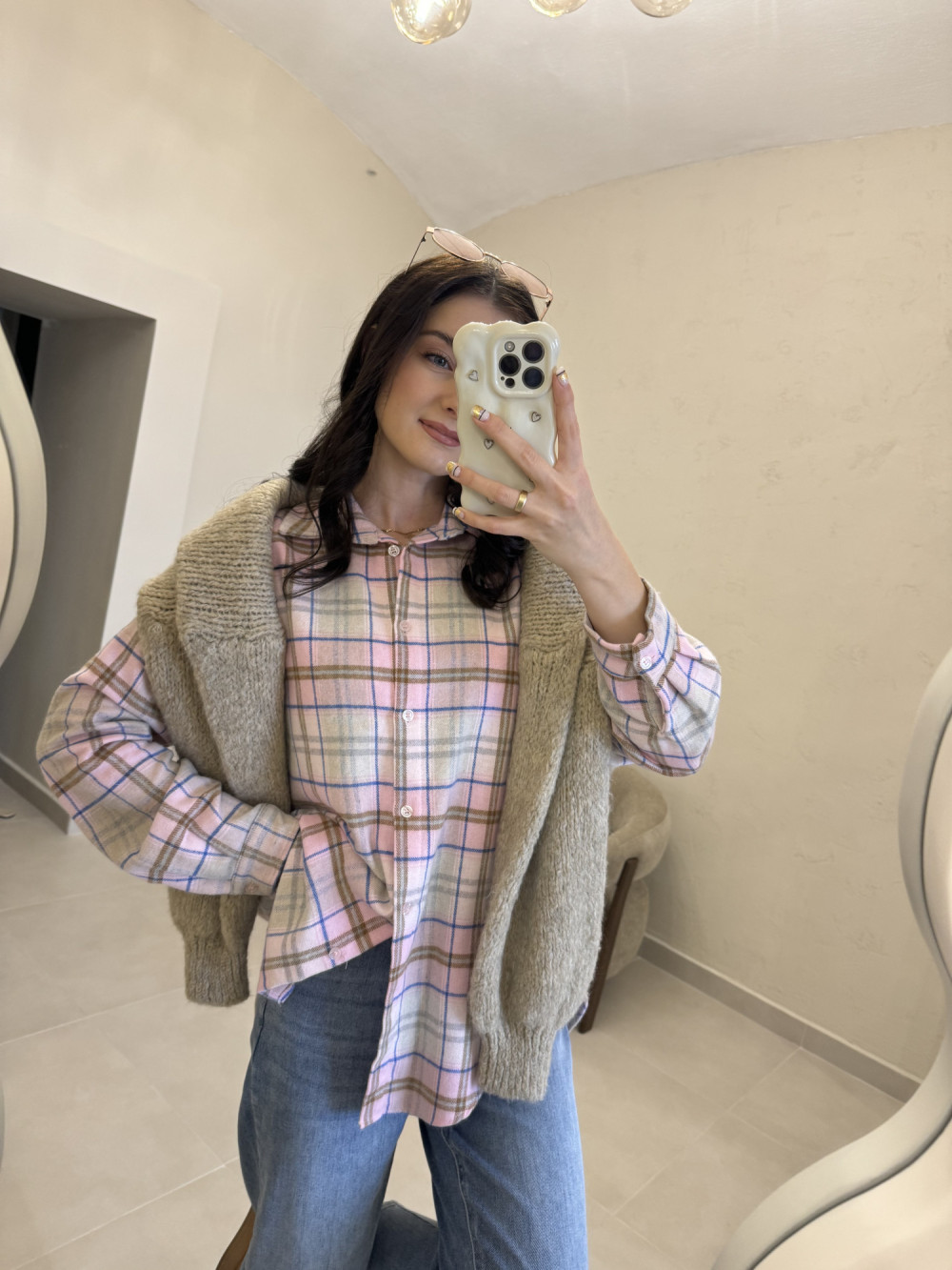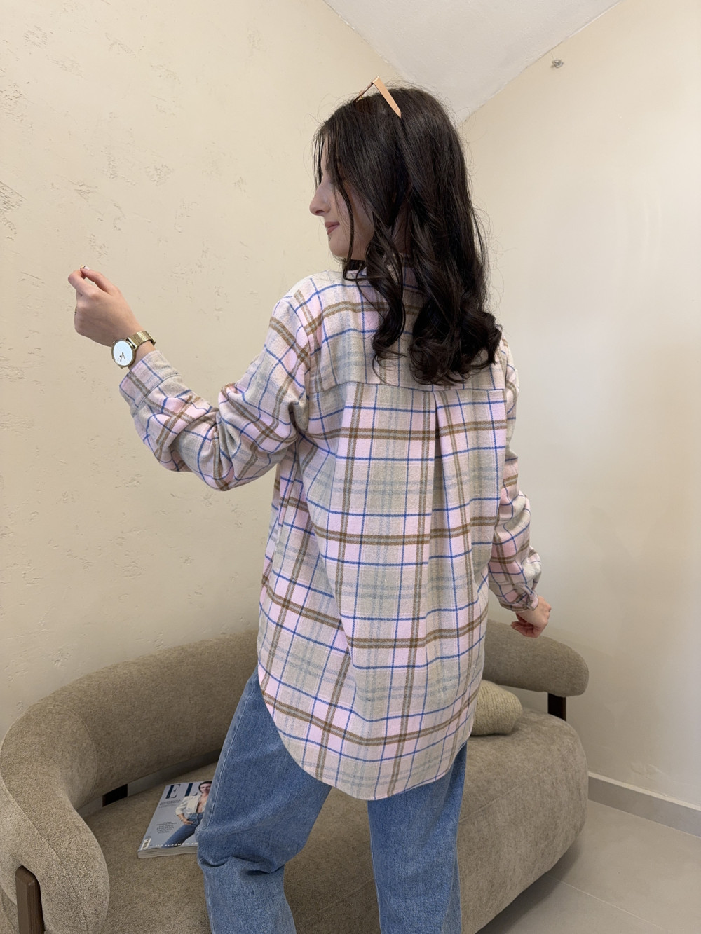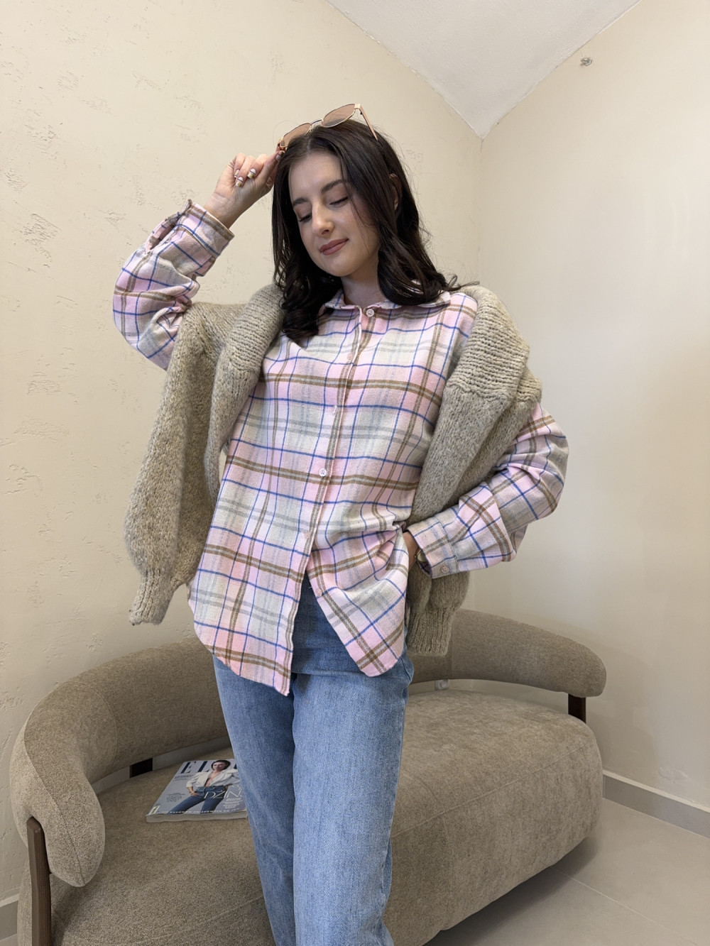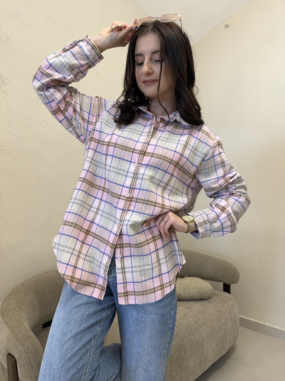 Koszula w beżowo-różową kratkę o dłuższym kroju 100% bawełna BRISA