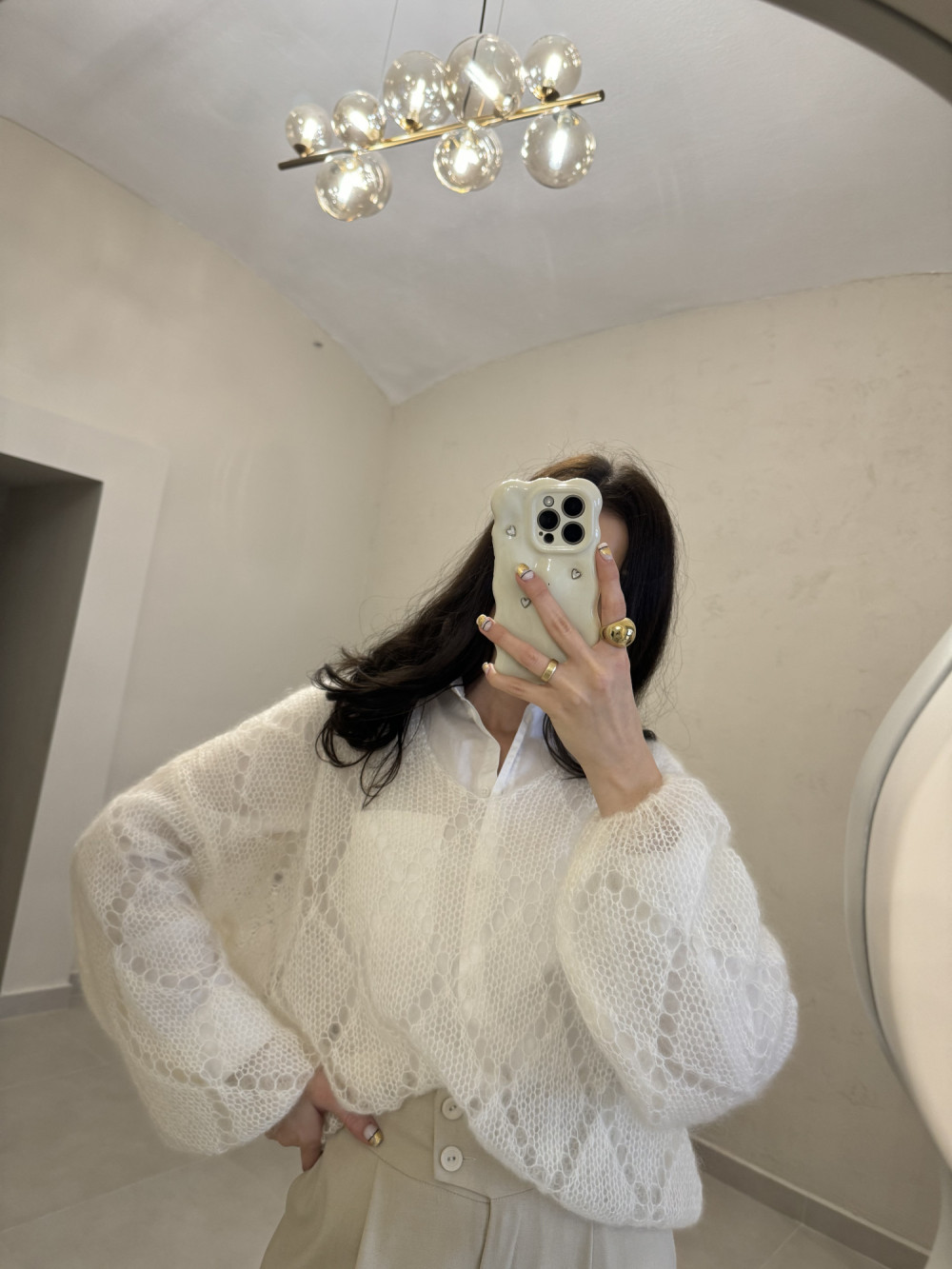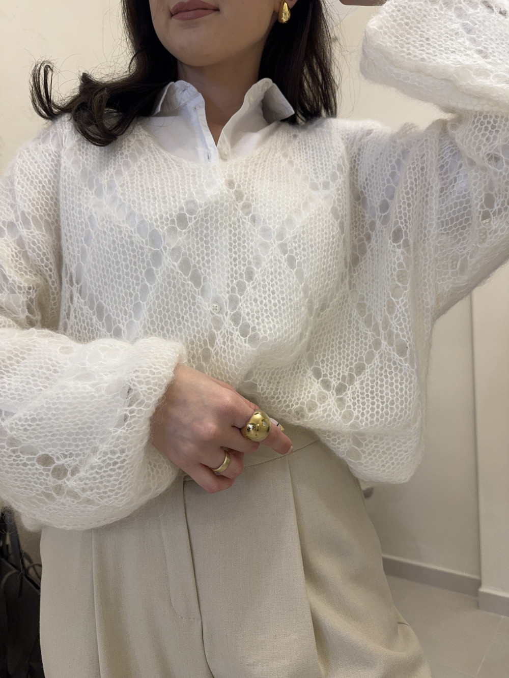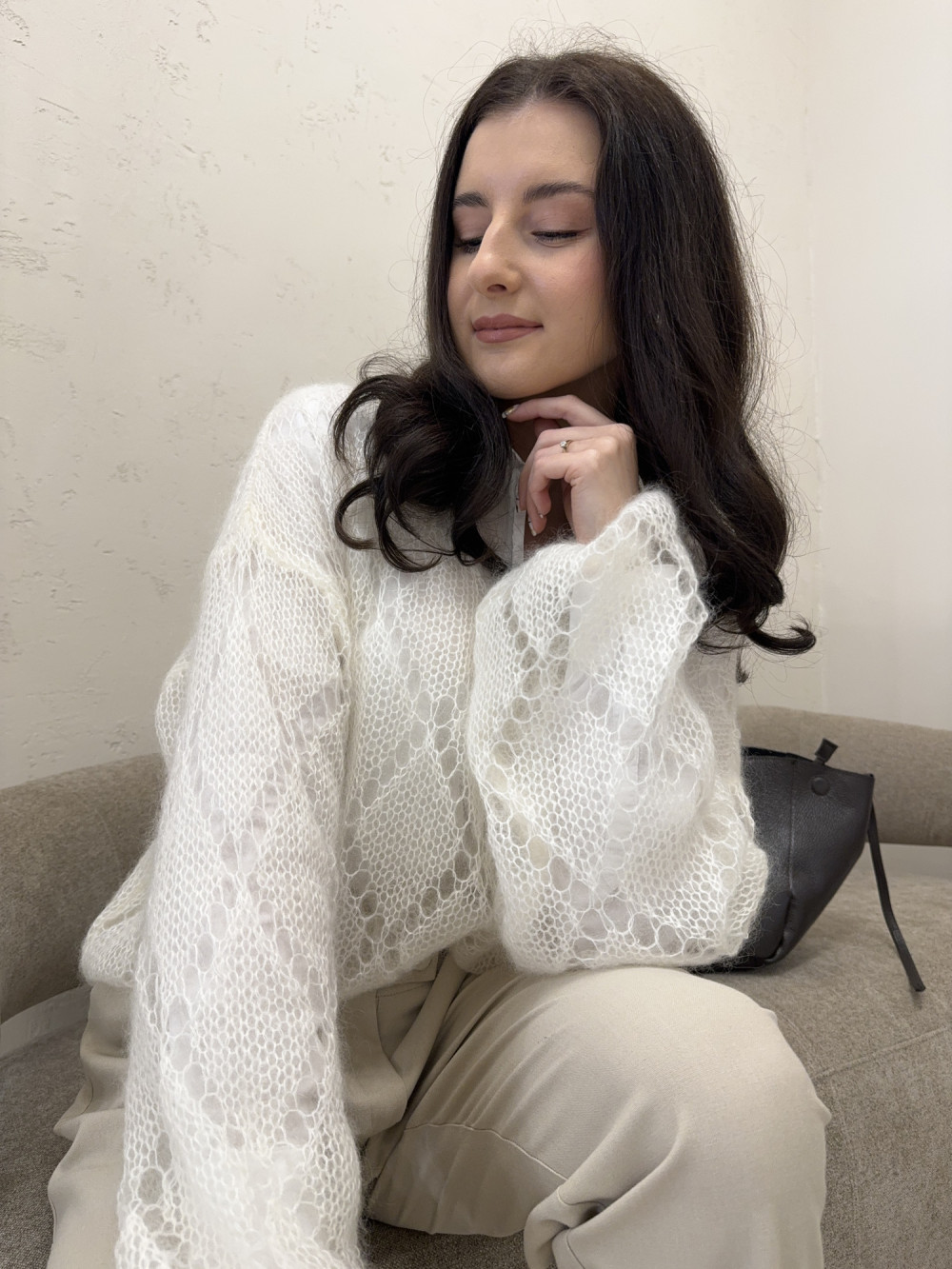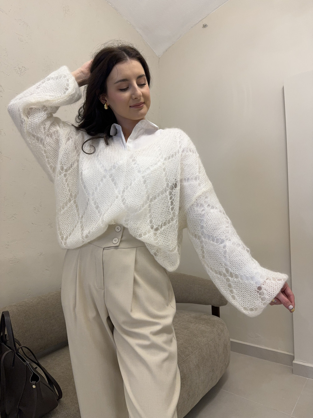Śmietankowy sweterek o wyjątkowo lekkiej, puszystej strukturze, który otula jak chmurka. Wykonany w 70% z kid moheru, zachwyca miękkością i delikatnym prześwitem. Nie zawiera koszuli widocznej na zdjęciu, dzięki czemu możesz stylizować go dokładnie tak, jak lubisz. To idealna propozycja dla miłośniczek subtelnych, romantycznych swetrów.