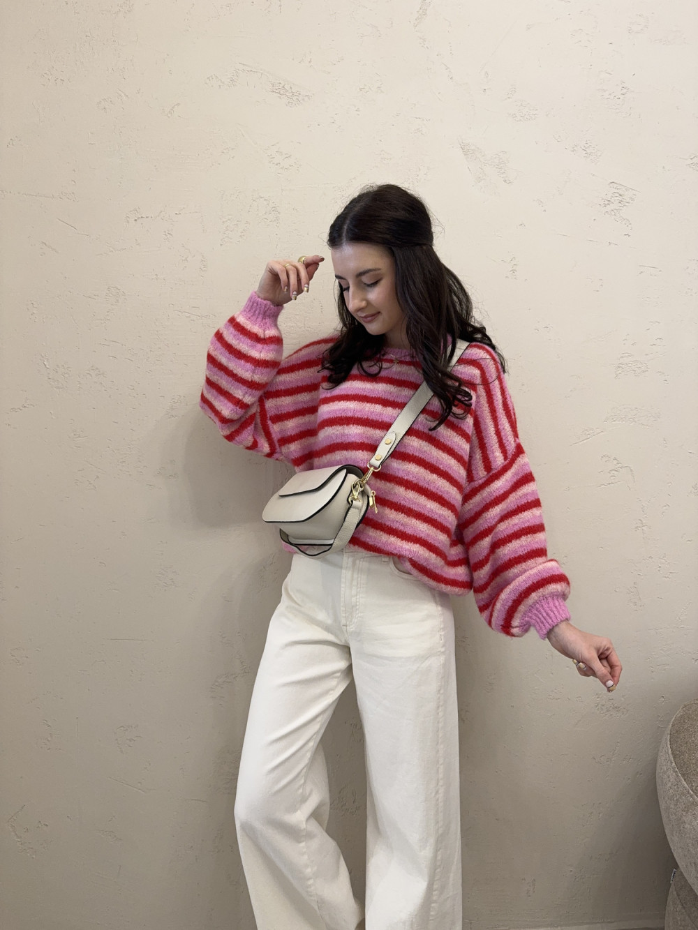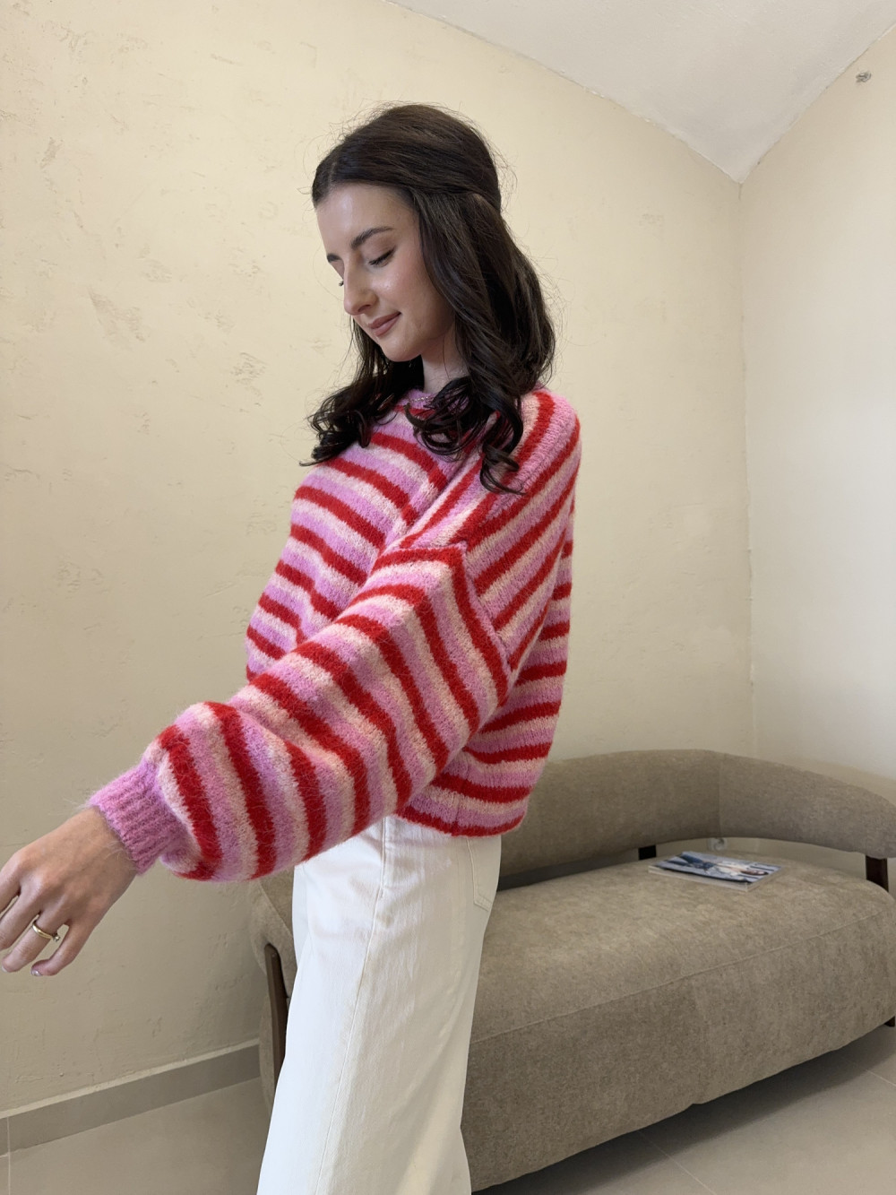 Sweter w paski balonowymi rękawami różowo-czerwony PURE