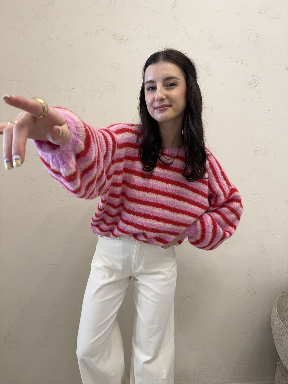 Miękki, puszysty sweterek w paski, który od razu przyciąga wzrok i dodaje stylizacji charakteru. Balonowe rękawy zakończone ściągaczem pięknie budują objętość i nadają mu modowy twist. Dół swetra jest wykończony w ten sam sposób co rękawy, dzięki czemu całość wygląda spójnie i bardzo estetycznie. Sweter świetnie układa się zarówno luźno puszczony, jak i lekko wpuszczony w spodnie. To idealny wybór, jeśli chcesz wyglądać efektownie, ale czuć się maksymalnie komfortowo.