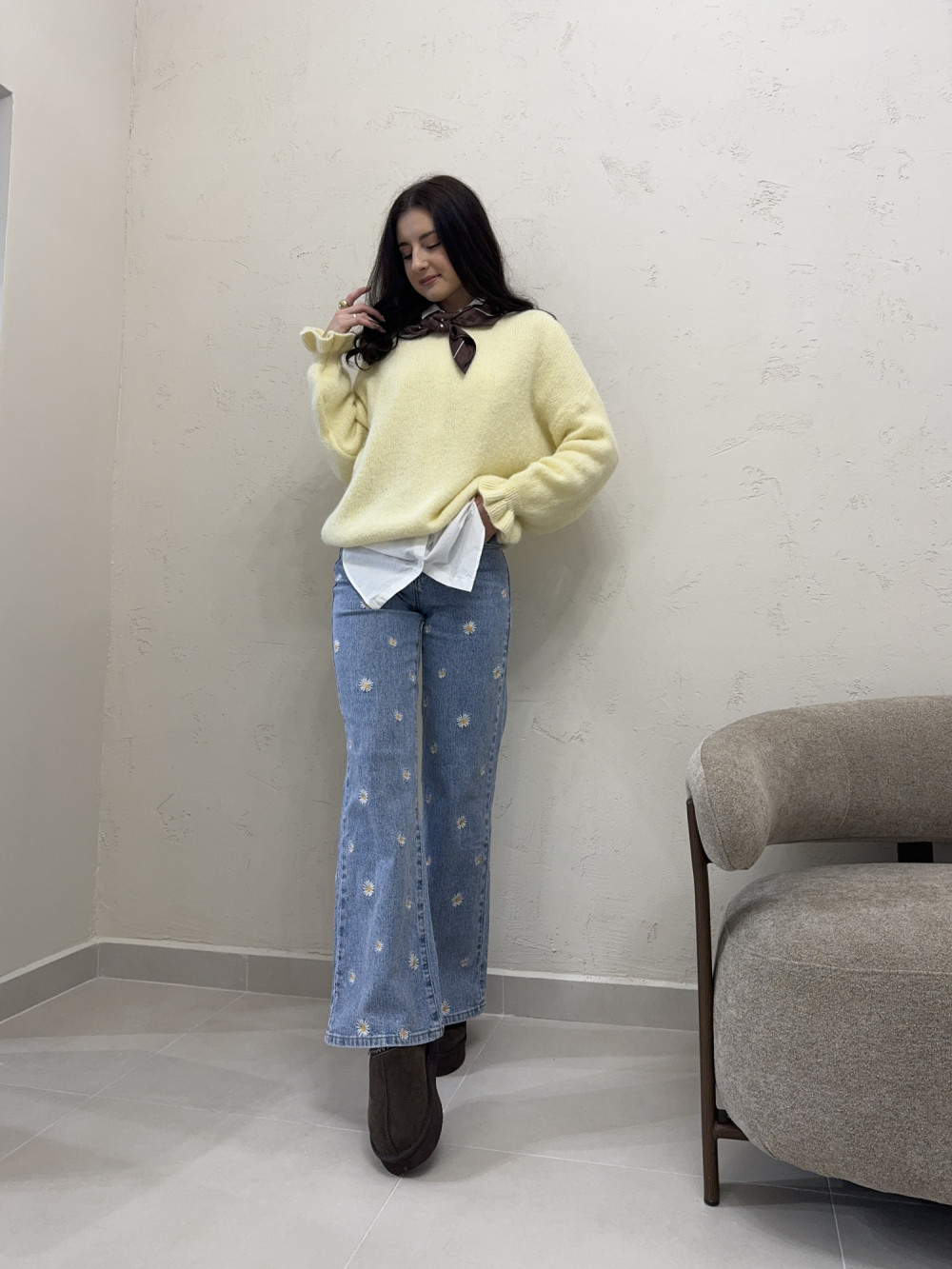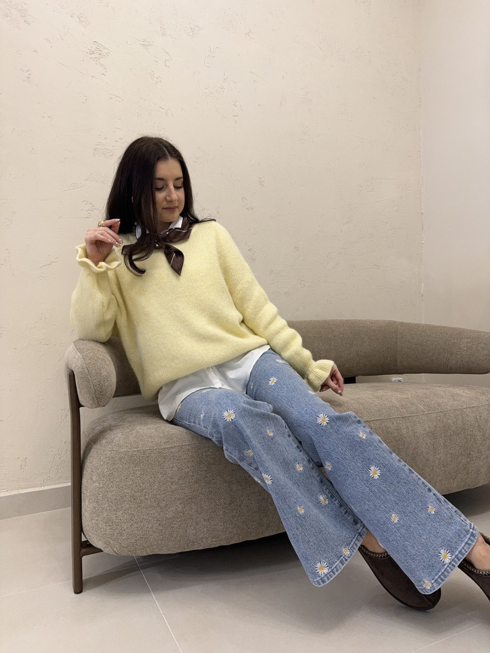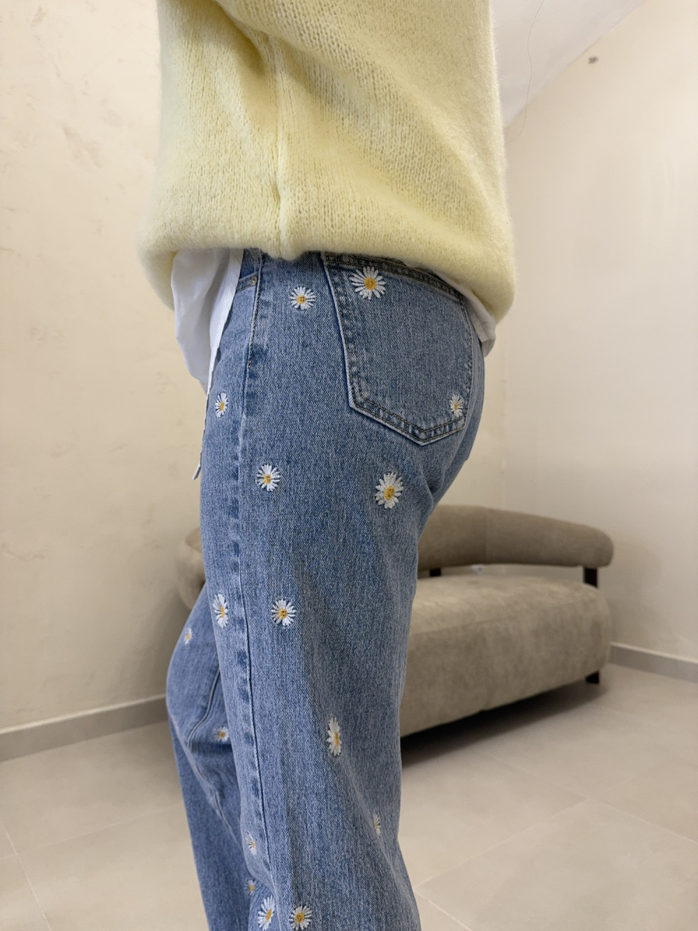 Jeansy z wysokim stanem uszyte z wyjątkowo miękkiego denimu, który pięknie układa się na sylwetce. Haftowane stokrotki dodają im uroku i subtelnego, dziewczęcego charakteru. Nogawki delikatnie rozszerzają się ku dołowi, tworząc bardzo modny i zgrabny fason. Materiał jest komfortowy w noszeniu i nie krępuje ruchów. To idealne spodnie do codziennych stylizacji z nutą romantyzmu.