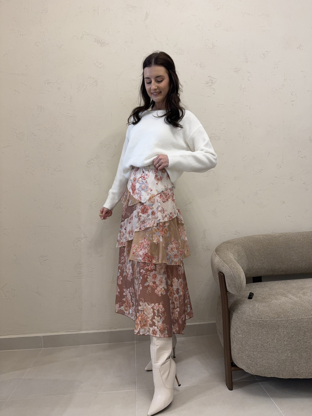 Zwiewna spódnica uszyta w 85% z tencelu, który jest lekki, oddychający i pięknie pracuje w ruchu. W talii znajduje się gumka, dzięki czemu spódnica idealnie dopasowuje się do sylwetki. Model posiada podszewkę sięgającą przed kolano, co zapewnia komfort i brak prześwitywania. Warstwowe falbany tworzą efekt lekkości i nadają całości kobiecego charakteru. To idealna propozycja na wiosnę i lato, ale sprawdzi się też w stylizacjach z botkami.